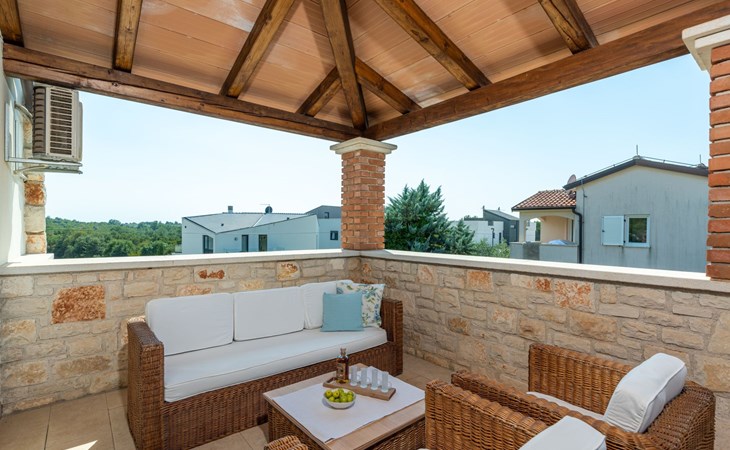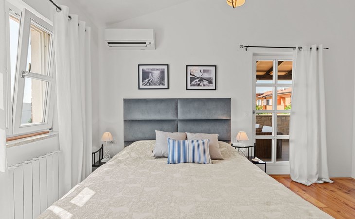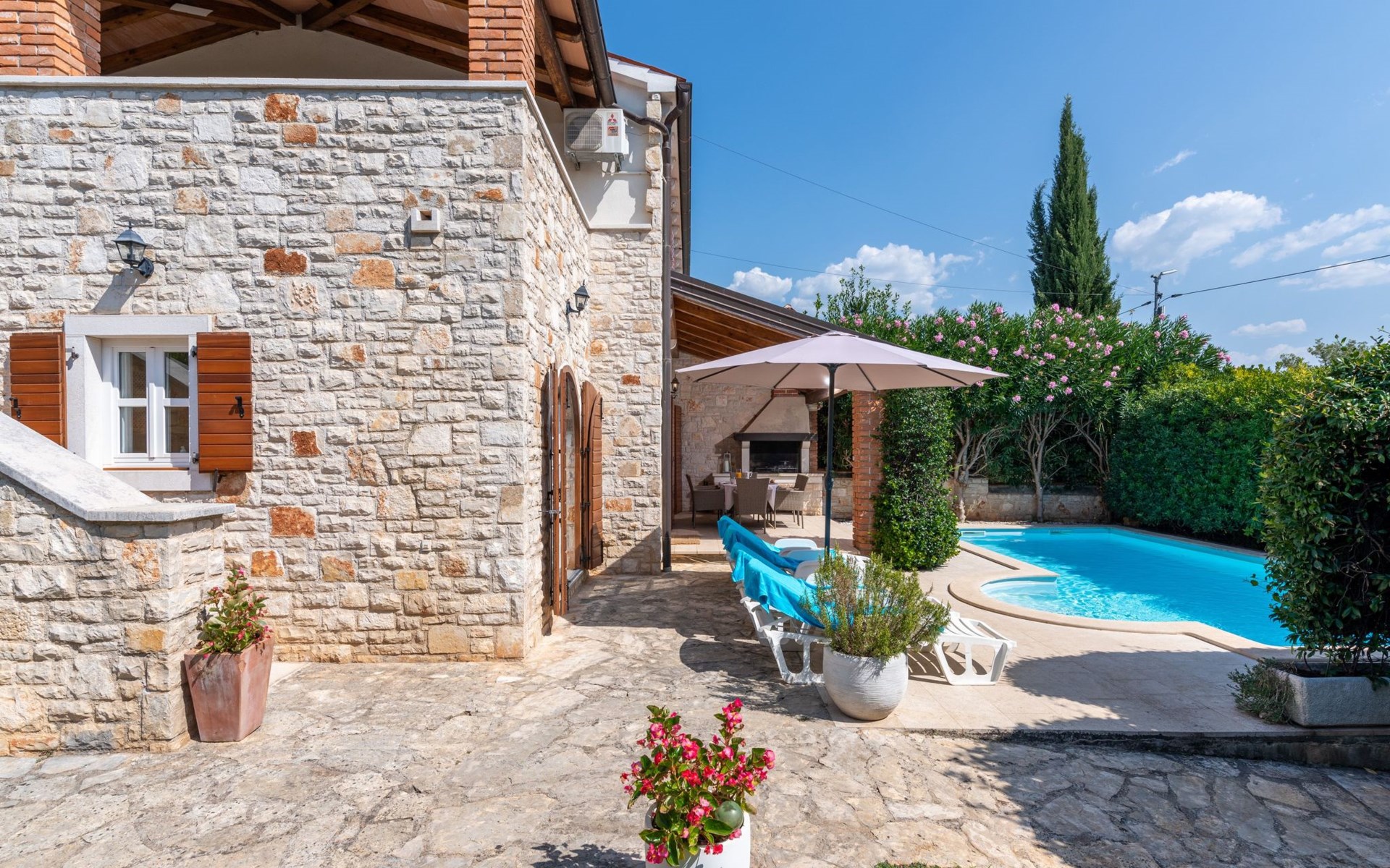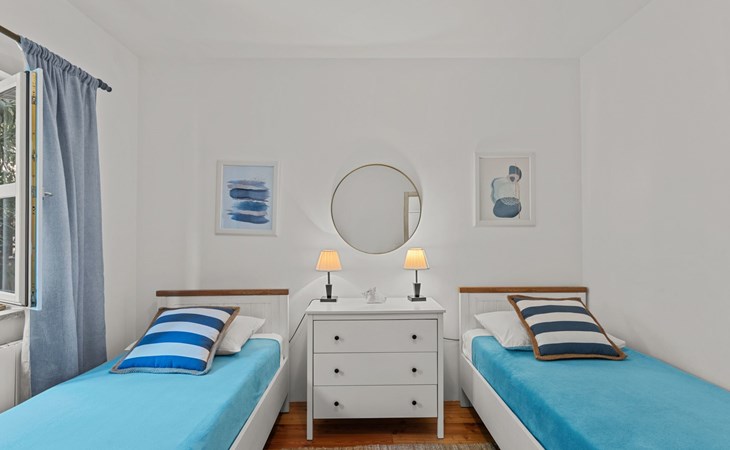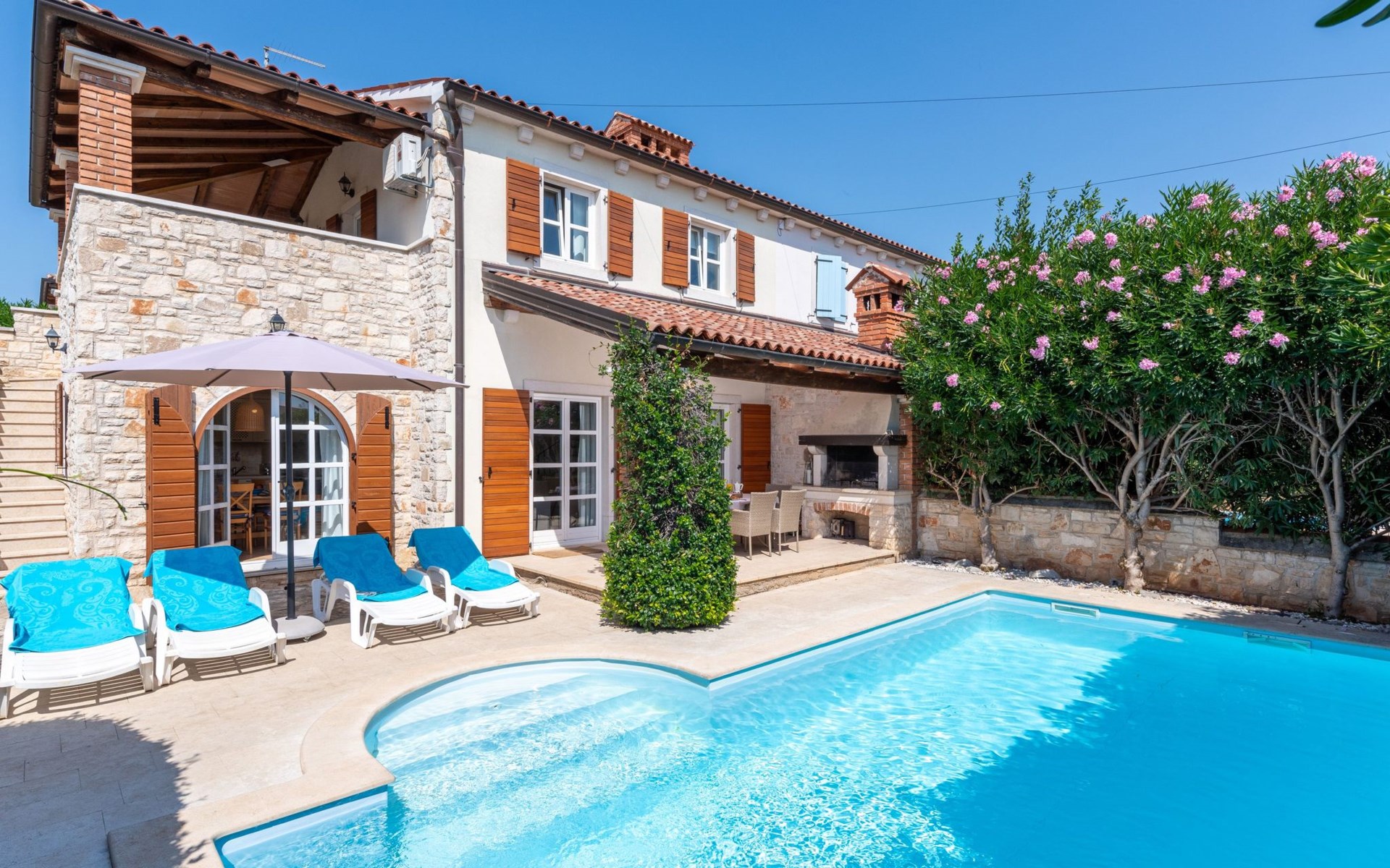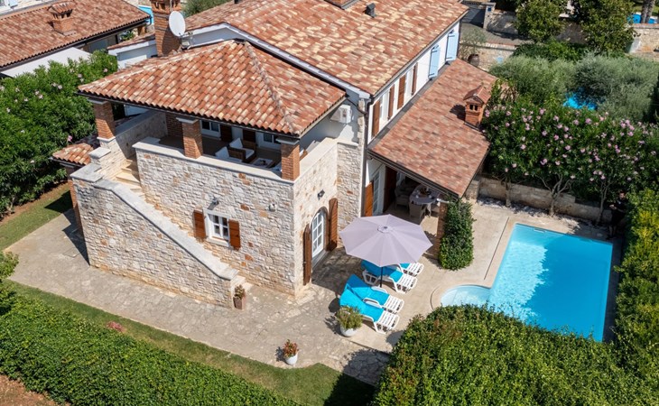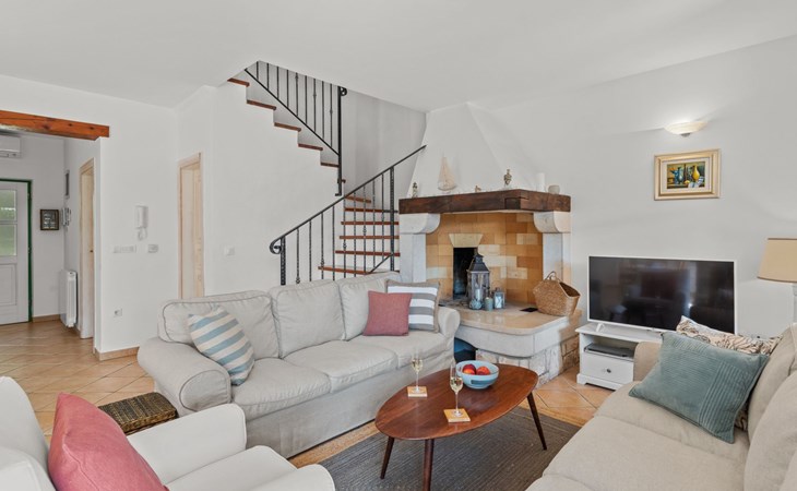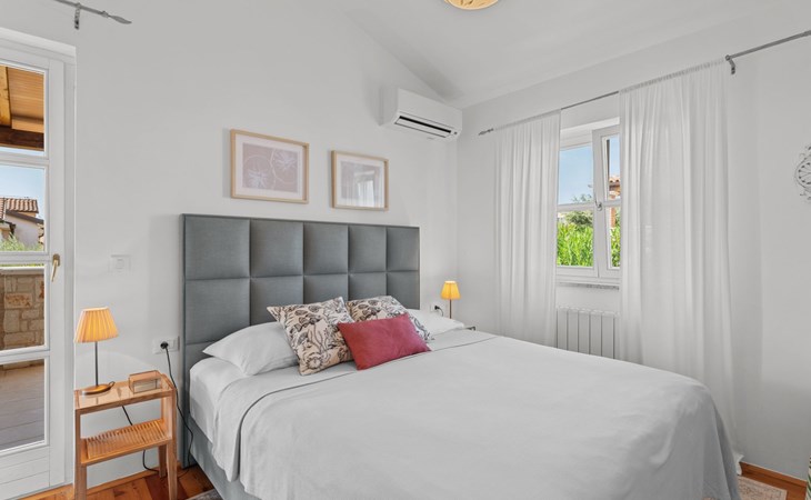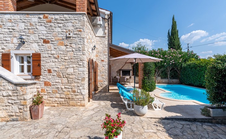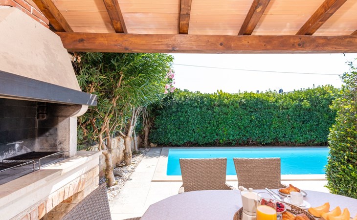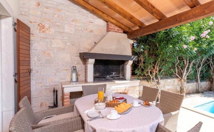 The villa is decorated in a modern, rustic elegant style and is spread over two floors. There are three bedrooms in the house, two double bedrooms are on the first floor, both with en suite bathroom. The third bedroom with two single beds and a bathroom are located on the ground floor. In one double bedroom and twin room is one sofa bed each so the house can accommodate 6+2 guests. There also is one cot and a high chair for a baby. Both bedrooms on the first floor have exit to pretty terrace ideal for alfresco drinks. Bed linen and towels are provided, you only have to bring beach towels. The living room on the ground floor provides comfortable sofas and a fireplace, as well as a flatscreen TV with digital and cable channels. The adjoining kitchen is equipped for everyday cooking: fridge, stove, oven, toaster, dishwasher and coffee machine. Both rooms are facing the swimming pool and have exit on outside covered terrace with BBQ. Free WiFi is available throughout entire house. There are many things like books, magazines, toys, DVD movies and games that make a house home. You will be greeted by the owner or representative on your arrival and he will be at your disposal during your stay in the house. He will also leave many useful information about the area to make your holiday even more enjoyable .