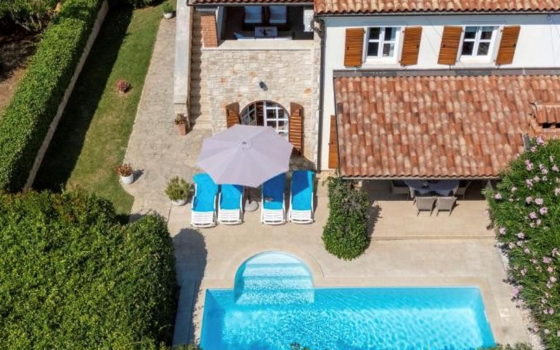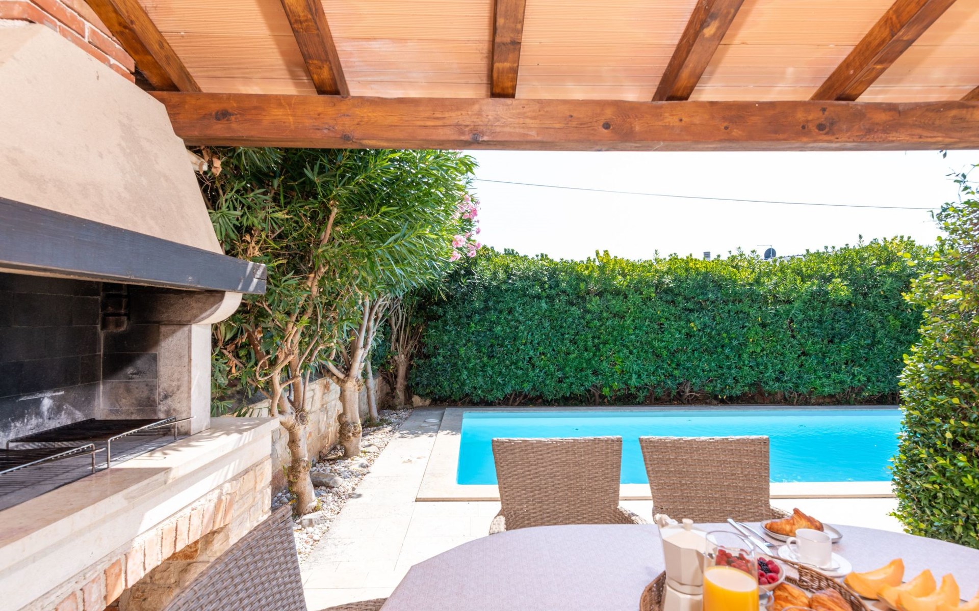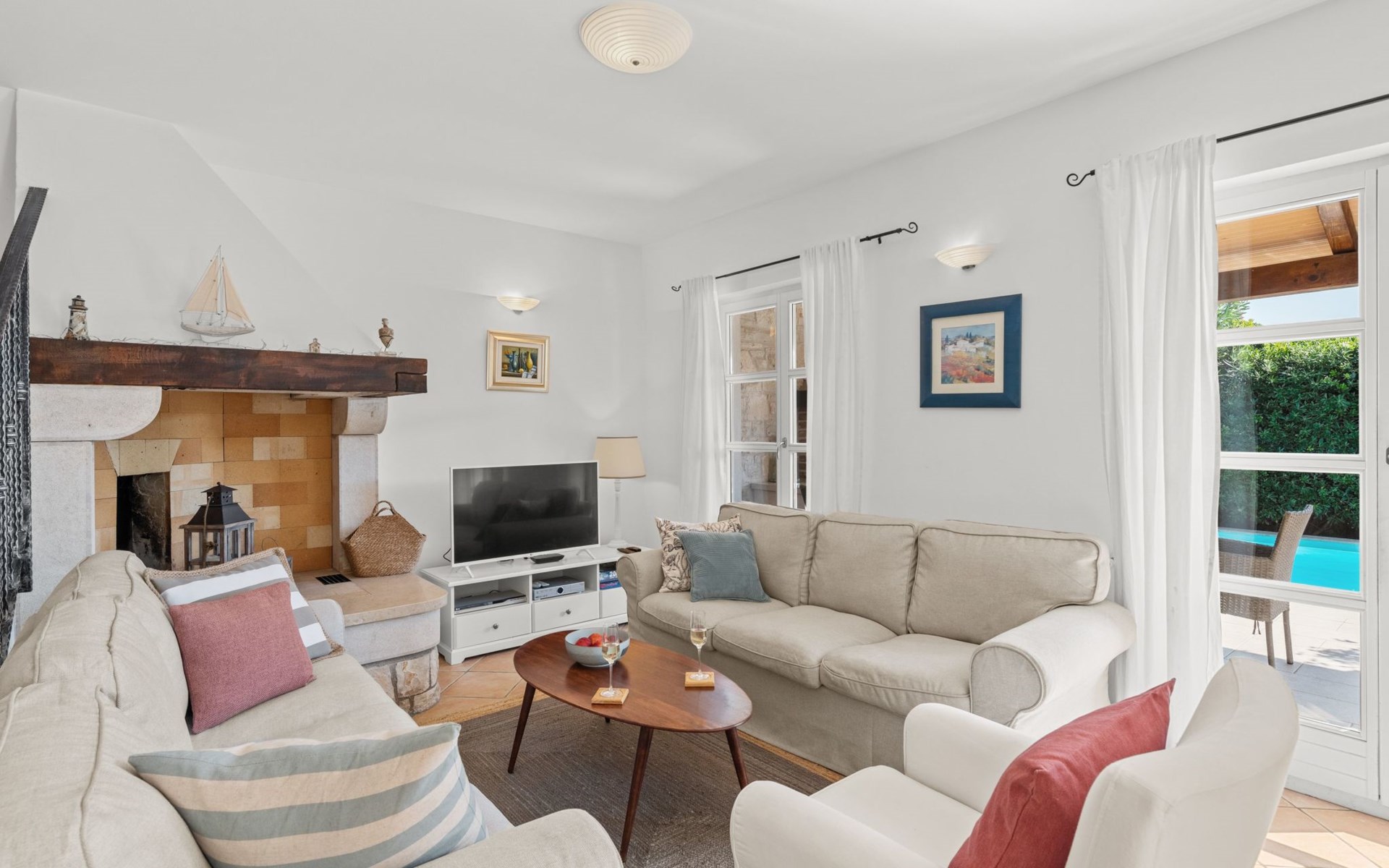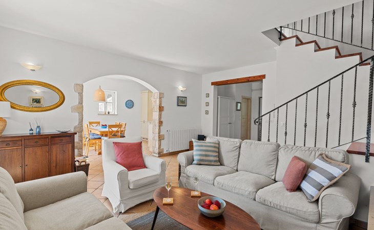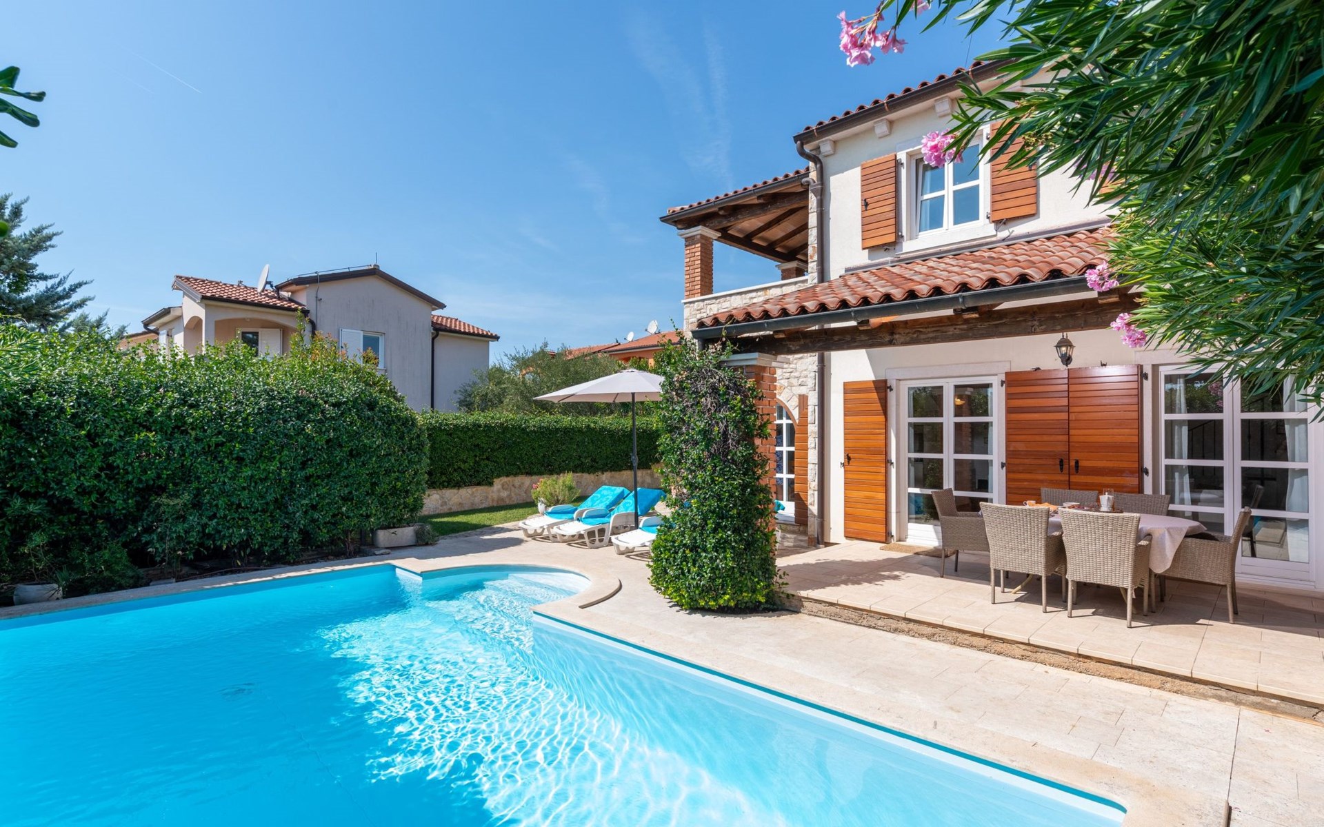 The villa is decorated in a modern, rustic elegant style and is spread over two floors. There are three bedrooms in the house, two double bedrooms are on the first floor, both with en suite bathroom. The third bedroom with two single beds and a bathroom are located on the ground floor. In one double bedroom and twin room is one sofa bed each so the house can accommodate 6+2 guests. There also is one cot and a high chair for a baby. Both bedrooms on the first floor have exit to pretty terrace ideal for alfresco drinks. Bed linen and towels are provided, you only have to bring beach towels. The living room on the ground floor provides comfortable sofas and a fireplace, as well as a flatscreen TV with digital and cable channels. The adjoining kitchen is equipped for everyday cooking: fridge, stove, oven, toaster, dishwasher and coffee machine. Both rooms are facing the swimming pool and have exit on outside covered terrace with BBQ. Free WiFi is available throughout entire house. There are many things like books, magazines, toys, DVD movies and games that make a house home. You will be greeted by the owner or representative on your arrival and he will be at your disposal during your stay in the house. He will also leave many useful information about the area to make your holiday even more enjoyable .
