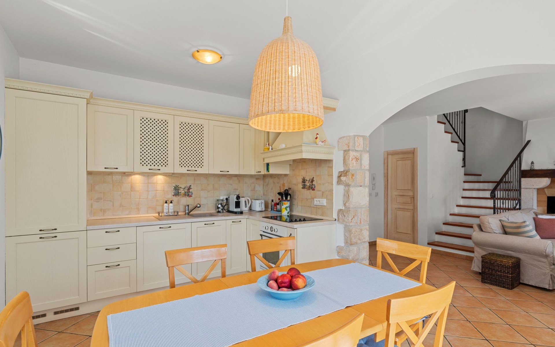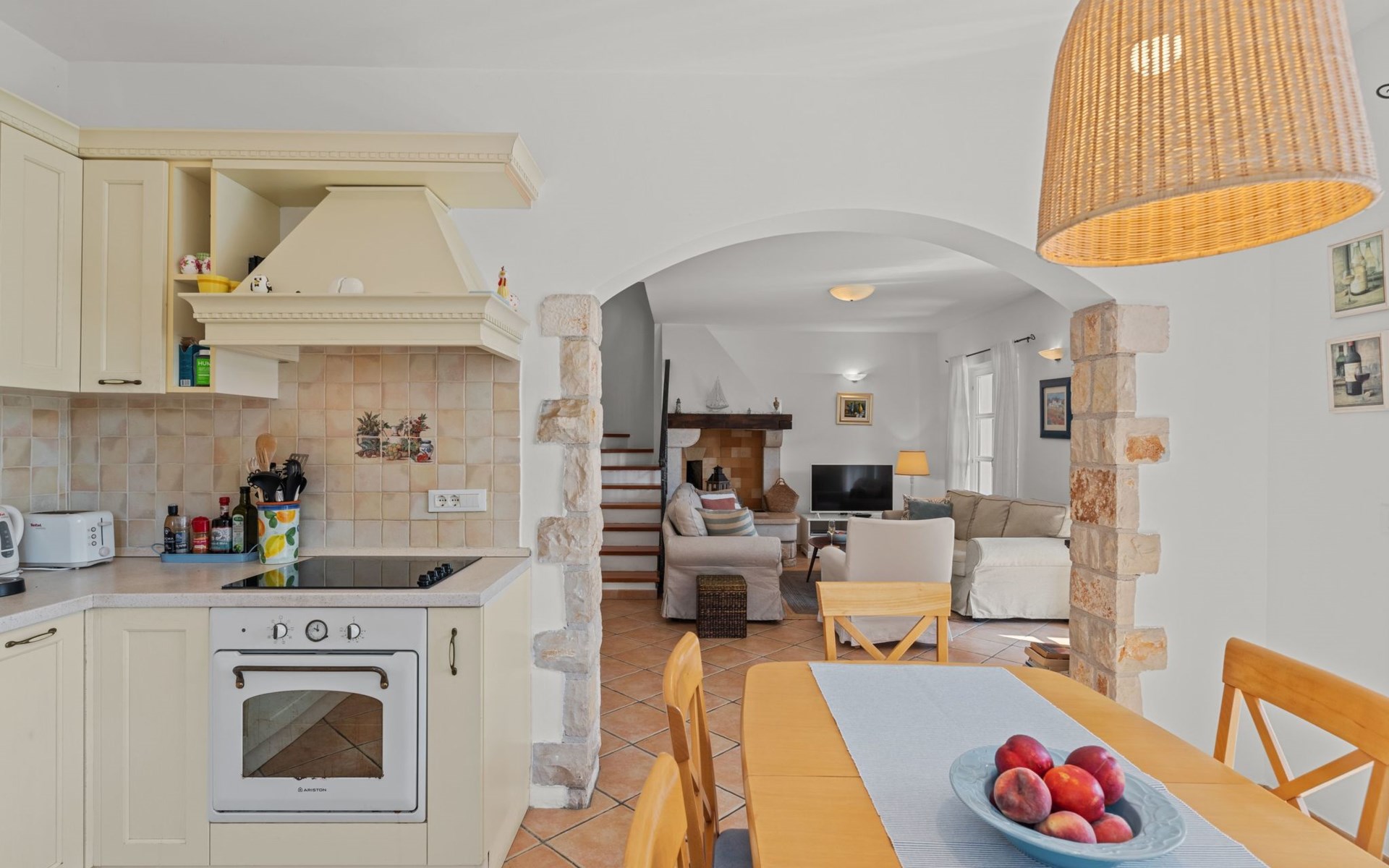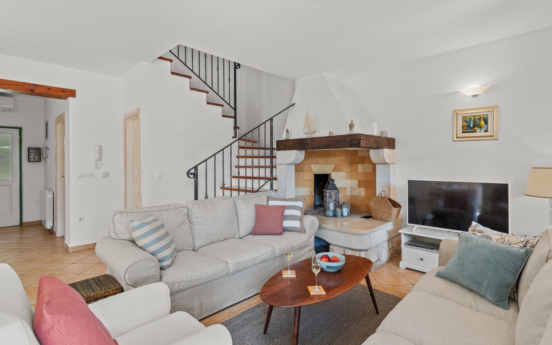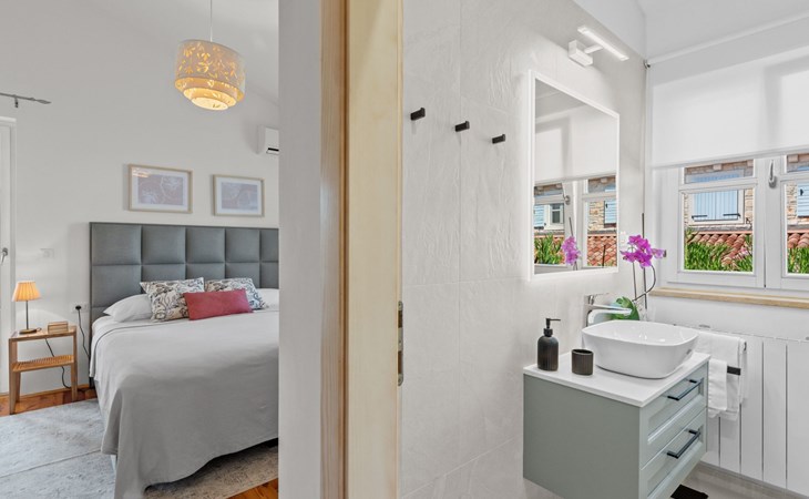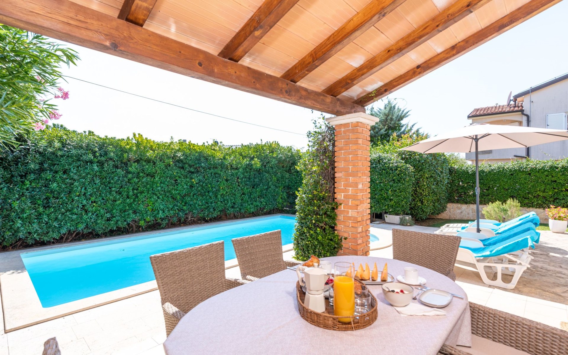 The villa is decorated in a modern, rustic elegant style and is spread over two floors. There are three bedrooms in the house, two double bedrooms are on the first floor, both with en suite bathroom. The third bedroom with two single beds and a bathroom are located on the ground floor. In one double bedroom and twin room is one sofa bed each so the house can accommodate 6+2 guests. There also is one cot and a high chair for a baby. Both bedrooms on the first floor have exit to pretty terrace ideal for alfresco drinks. Bed linen and towels are provided, you only have to bring beach towels. The living room on the ground floor provides comfortable sofas and a fireplace, as well as a flatscreen TV with digital and cable channels. The adjoining kitchen is equipped for everyday cooking: fridge, stove, oven, toaster, dishwasher and coffee machine. Both rooms are facing the swimming pool and have exit on outside covered terrace with BBQ. Free WiFi is available throughout entire house. There are many things like books, magazines, toys, DVD movies and games that make a house home. You will be greeted by the owner or representative on your arrival and he will be at your disposal during your stay in the house. He will also leave many useful information about the area to make your holiday even more enjoyable .