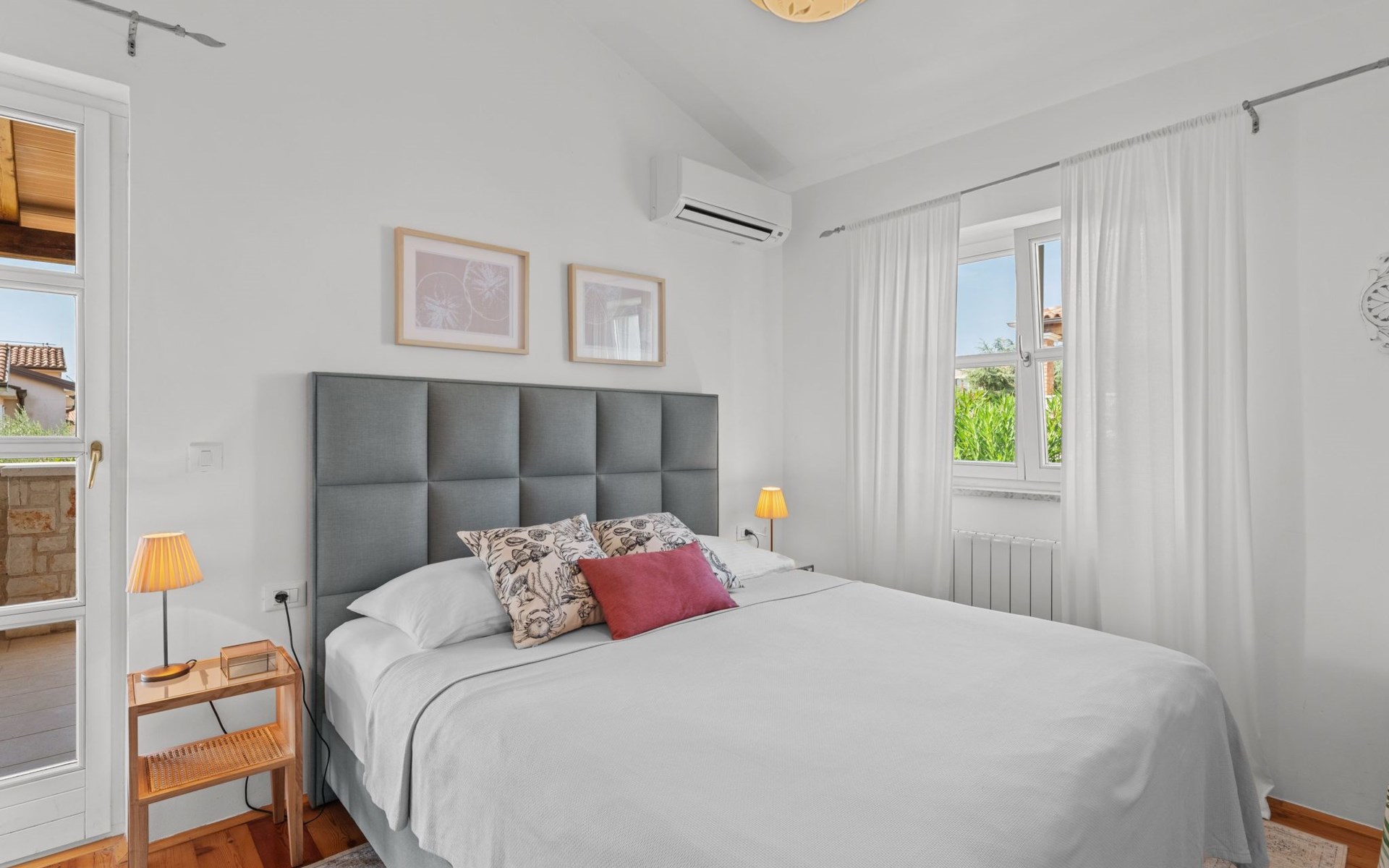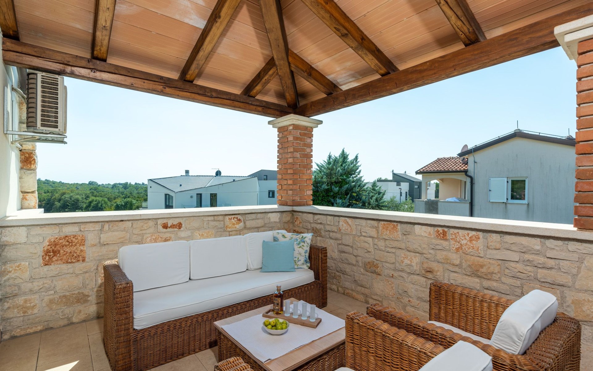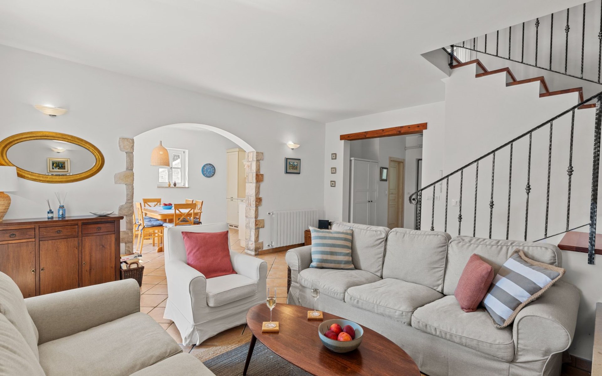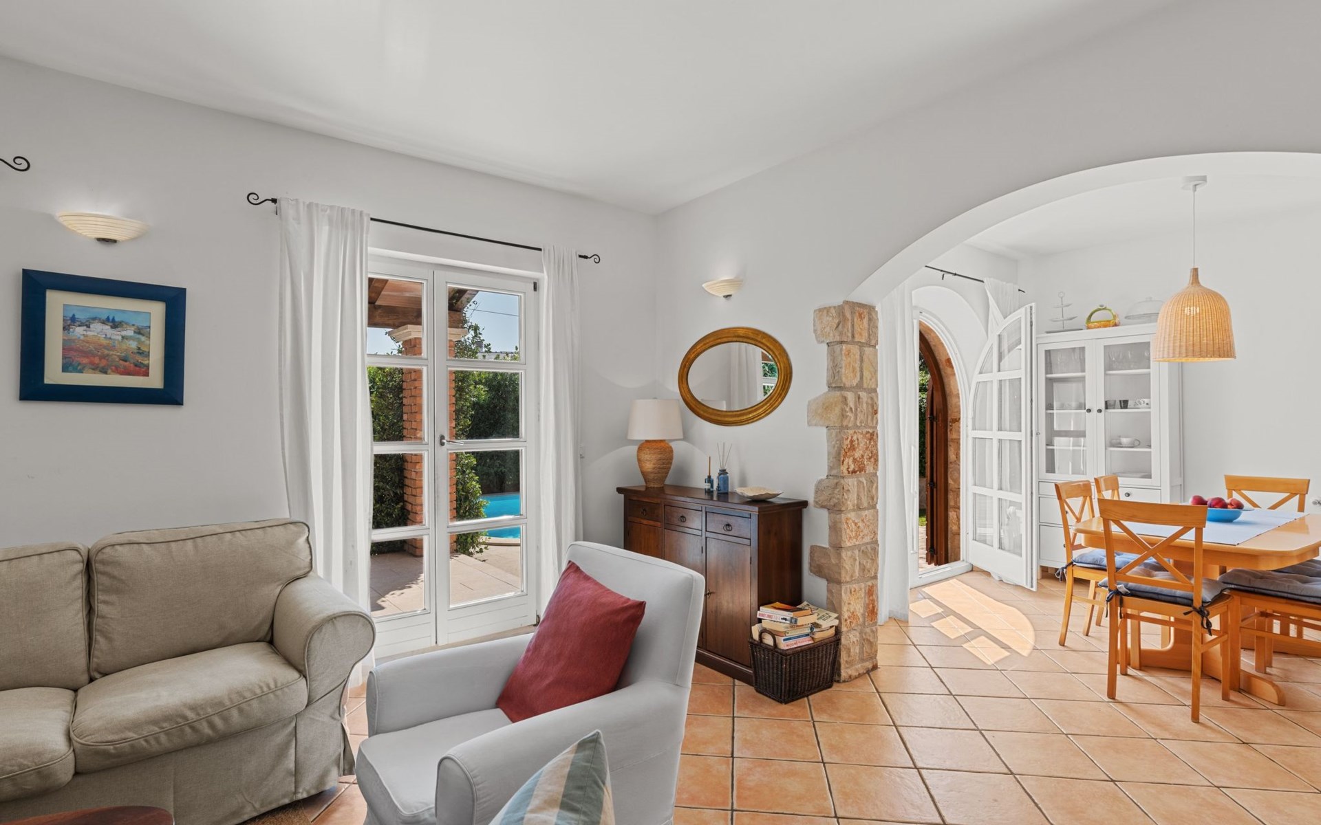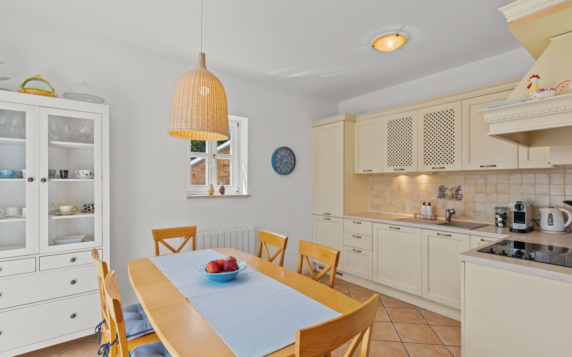 The villa is decorated in a modern, rustic elegant style and is spread over two floors. There are three bedrooms in the house, two double bedrooms are on the first floor, both with en suite bathroom. The third bedroom with two single beds and a bathroom are located on the ground floor. In one double bedroom and twin room is one sofa bed each so the house can accommodate 6+2 guests. There also is one cot and a high chair for a baby. Both bedrooms on the first floor have exit to pretty terrace ideal for alfresco drinks. Bed linen and towels are provided, you only have to bring beach towels. The living room on the ground floor provides comfortable sofas and a fireplace, as well as a flatscreen TV with digital and cable channels. The adjoining kitchen is equipped for everyday cooking: fridge, stove, oven, toaster, dishwasher and coffee machine. Both rooms are facing the swimming pool and have exit on outside covered terrace with BBQ. Free WiFi is available throughout entire house. There are many things like books, magazines, toys, DVD movies and games that make a house home. You will be greeted by the owner or representative on your arrival and he will be at your disposal during your stay in the house. He will also leave many useful information about the area to make your holiday even more enjoyable .