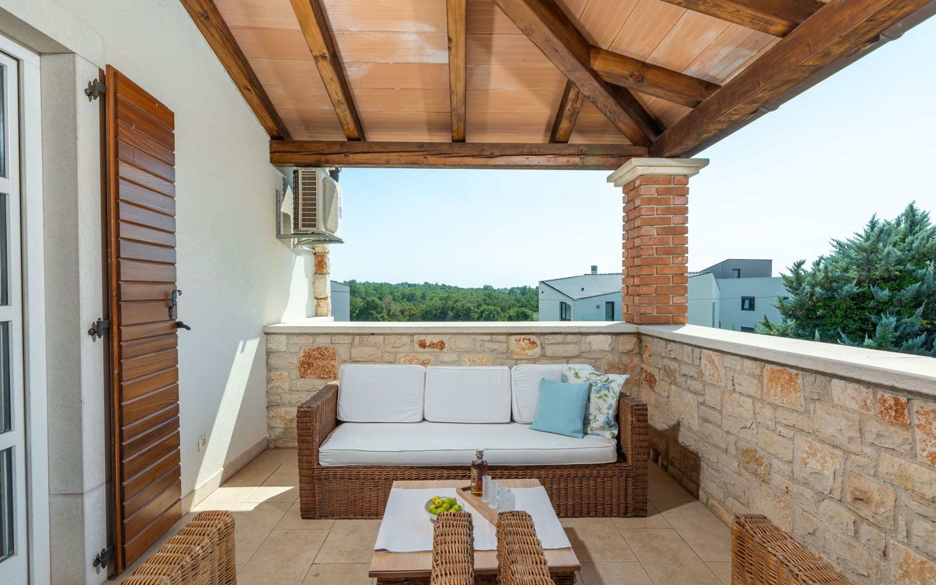The outdoor area includes a balcony accessed from the upper floor. It has lovely comfortable furniture and is roofed over. On the ground floor, the living room opens onto the roofed veranda with a dining table and chairs, as well as a stone grill for enjoyable evenings outdoors. Pets are allowed on the fenced site on request.
