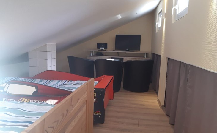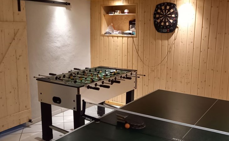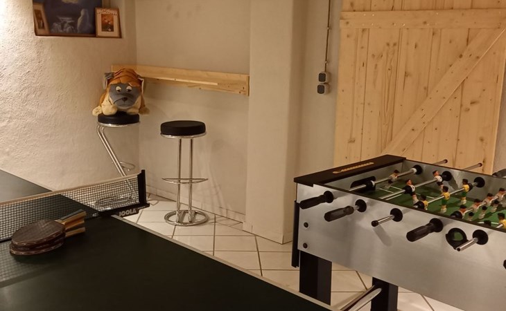 The 85m² house comprises a fully-equipped kitchen, a bedroom with a double bed, a bedroom (gallery, accessed by space-saving stairs) with two single beds and a TV with a DVD player, a living room with a TV, a bathroom with a shower bath, a dining room with a fireplace, a conservatory and a cellar room with a table tennis table and table football.