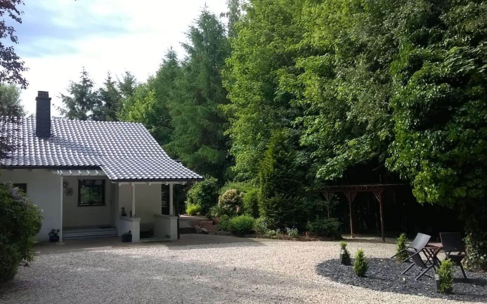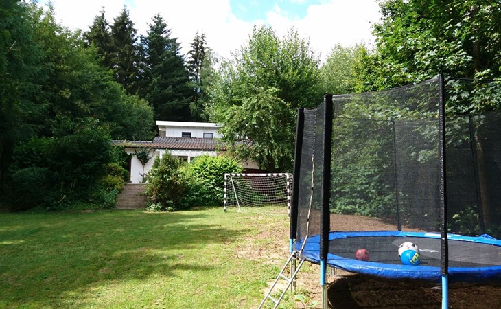 There is a terrace with a grill area and seating, a carport, a big garden with a football goal and trampoline, a courtyard with a sitting corner.