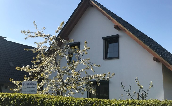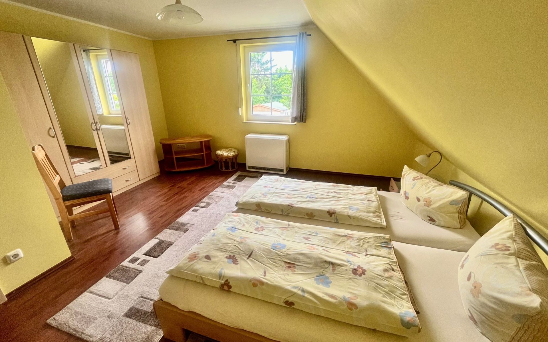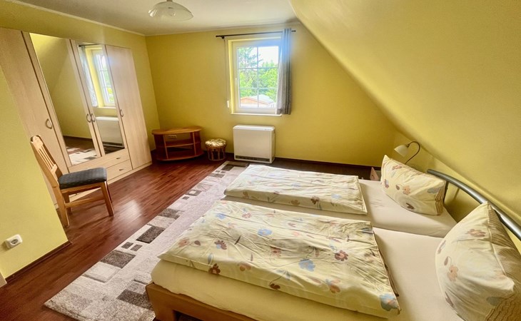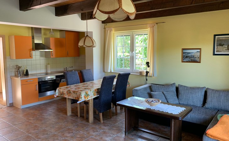 The ground floor offers a 35m2 living room with an integrated kitchen and a wood-burning stove, a bathroom with shower and a storage room. In the kitchen you will find - apart from the basic equipment - a freezer compartment, a dishwasher, a microwave, a toaster and an oven. The upper floor consists of two bedrooms and a guest WC. One of the bedrooms is furnished with a double bed (two mattresses 90x200cm), the other bedroom with 2 separate beds (90x200cm). External blinds are fitted to all windows in the house. You can use a washing machine and tumble dryer across the street for doing your laundry (for a fee). WLAN is available. Please note that there is ONE car parking space per house, which is not suitable for pickups or additional trailers