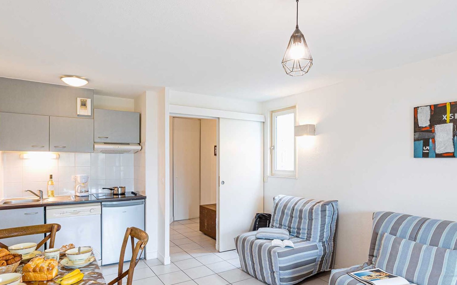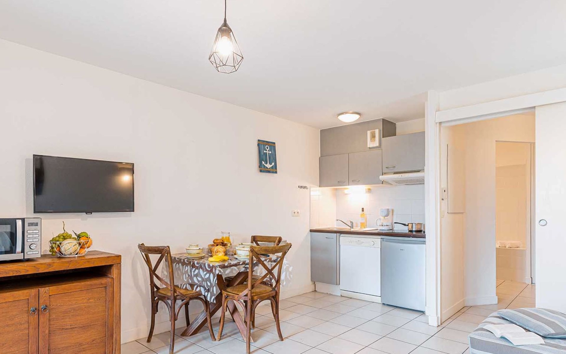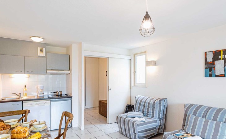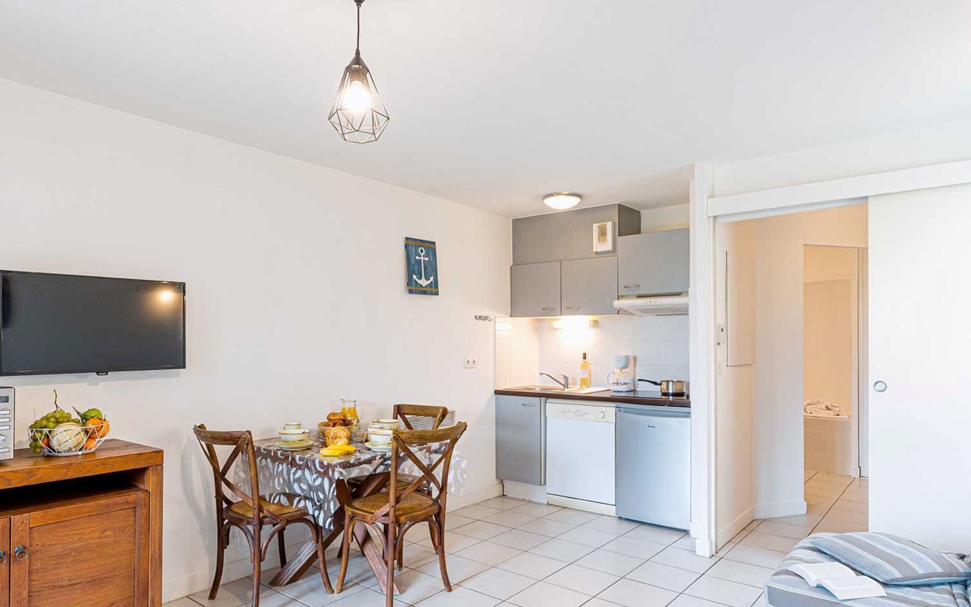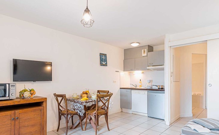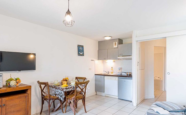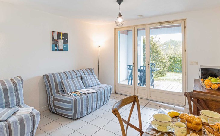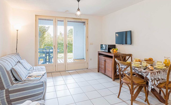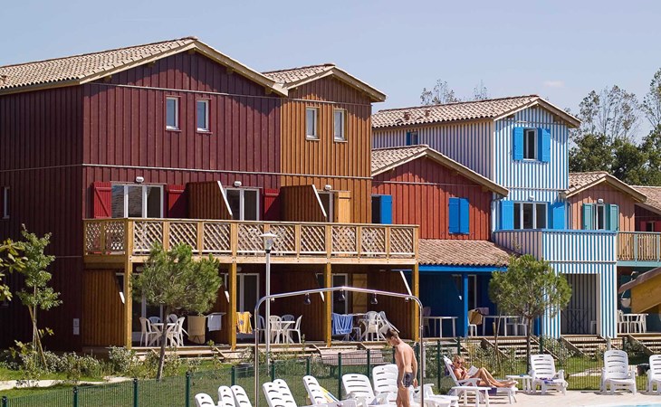 Residence "Les Rives Marines". 130 apartments in the residence. 300 m from the river. For shared use: swimming pool heated, fenced (12 x 10 m, seasonal availability: 01.May. - 30.Sep.). Table tennis, boccia. In the complex: reception, WiFi, storage room for bicycles, washing machine, tumble dryer (for shared use, extra). Bread roll service. Parking. Shop 500 m, supermarket 4 km, sandy beach "Plage de la Hume" 4 km. Sports harbour 500 m, golf course (18 hole) 10 km. Nearby attractions: Port de plaisance du Teich 500 m, Réserve ornithologique 400 m, la plage de La Hume 4 km, côte de Cap Ferret & Arcachon, Dune du Pilat, Bordeaux 53 km. Hiking paths: Parc Naturel des Landes de Gascogne. Please note: the photograph shows a typical example. The holiday properties may differ in living space, floorplan, equipment and furnishing.