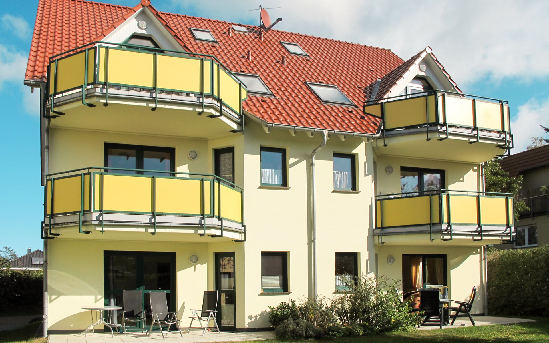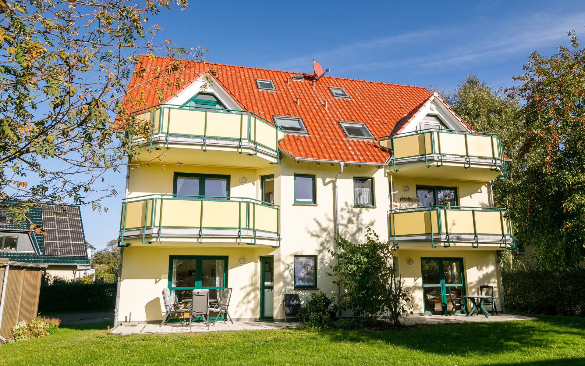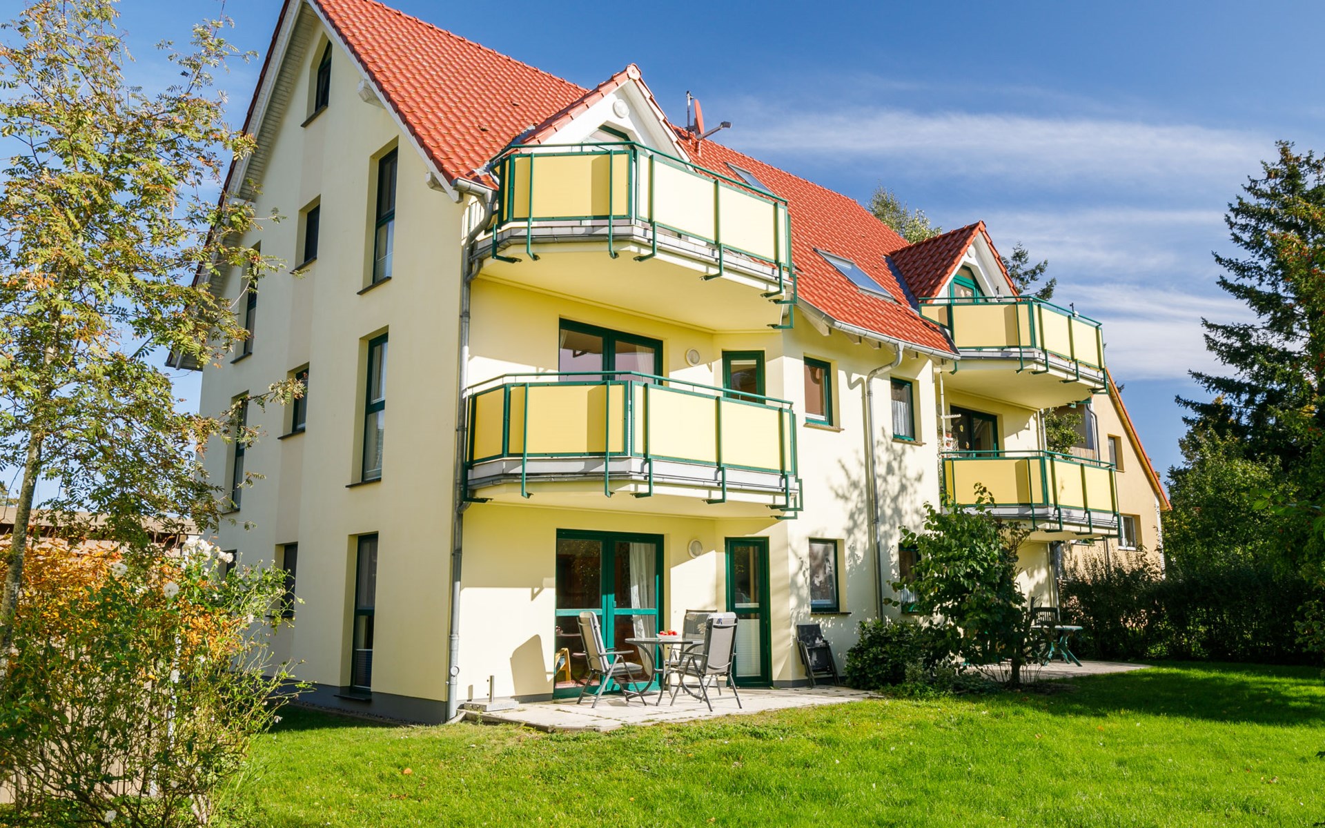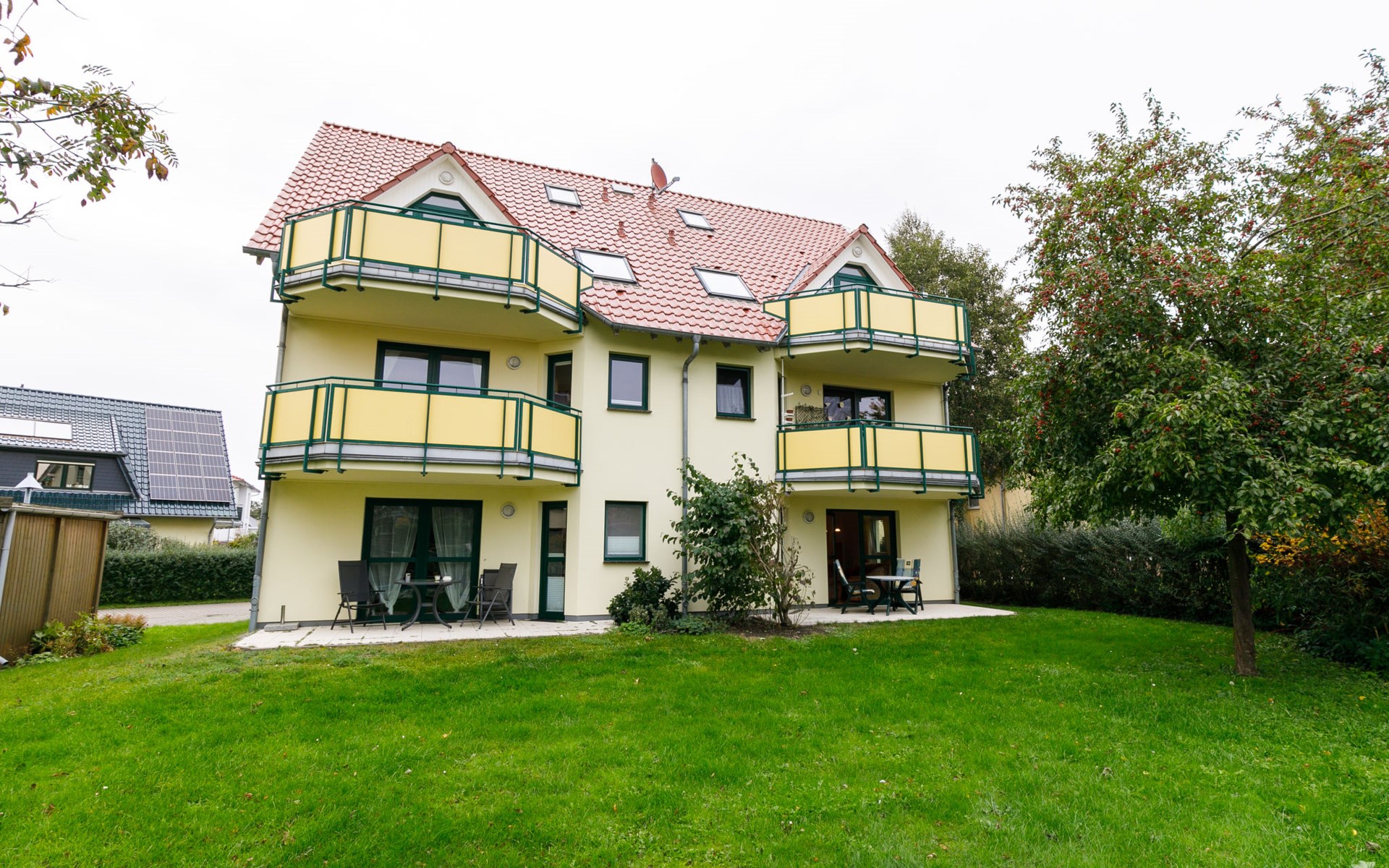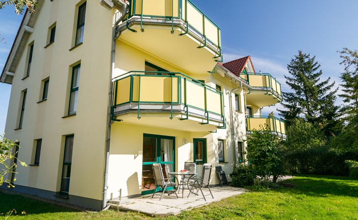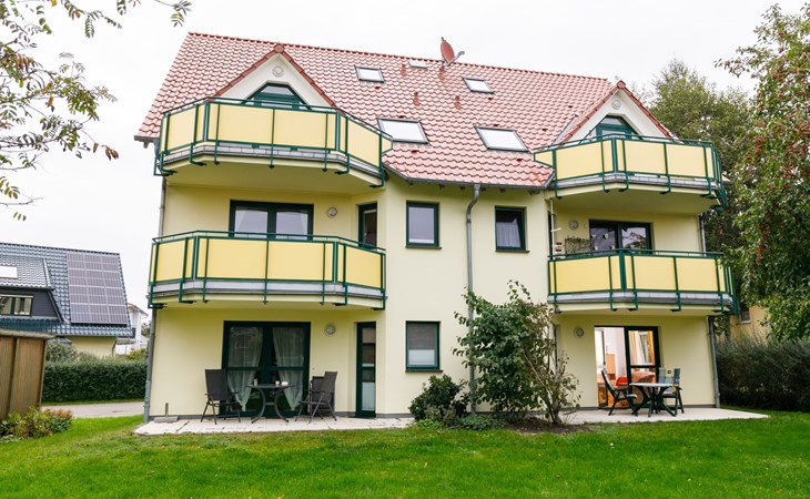 Apartment block "Ostseetrio", 3 storeys. 3 houses in the residence. 6 apartments in the property. In the resort 900 m from the centre of Zinnowitz, 1 km from the sea, 1 km from the beach. In the house: storage room for bicycles, central heating system. Parking on the premises. Supermarket 600 m, restaurant 600 m, bakery 600 m, café 800 m, bus stop 100 m, railway station 350 m, sandy beach 1 km, thermal baths "Bernsteintherme" 1.4 km. Marina 2.3 km, golf course (18 hole) 25 km, surf school 1.4 km, tennis 1 km, minigolf 1.4 km.