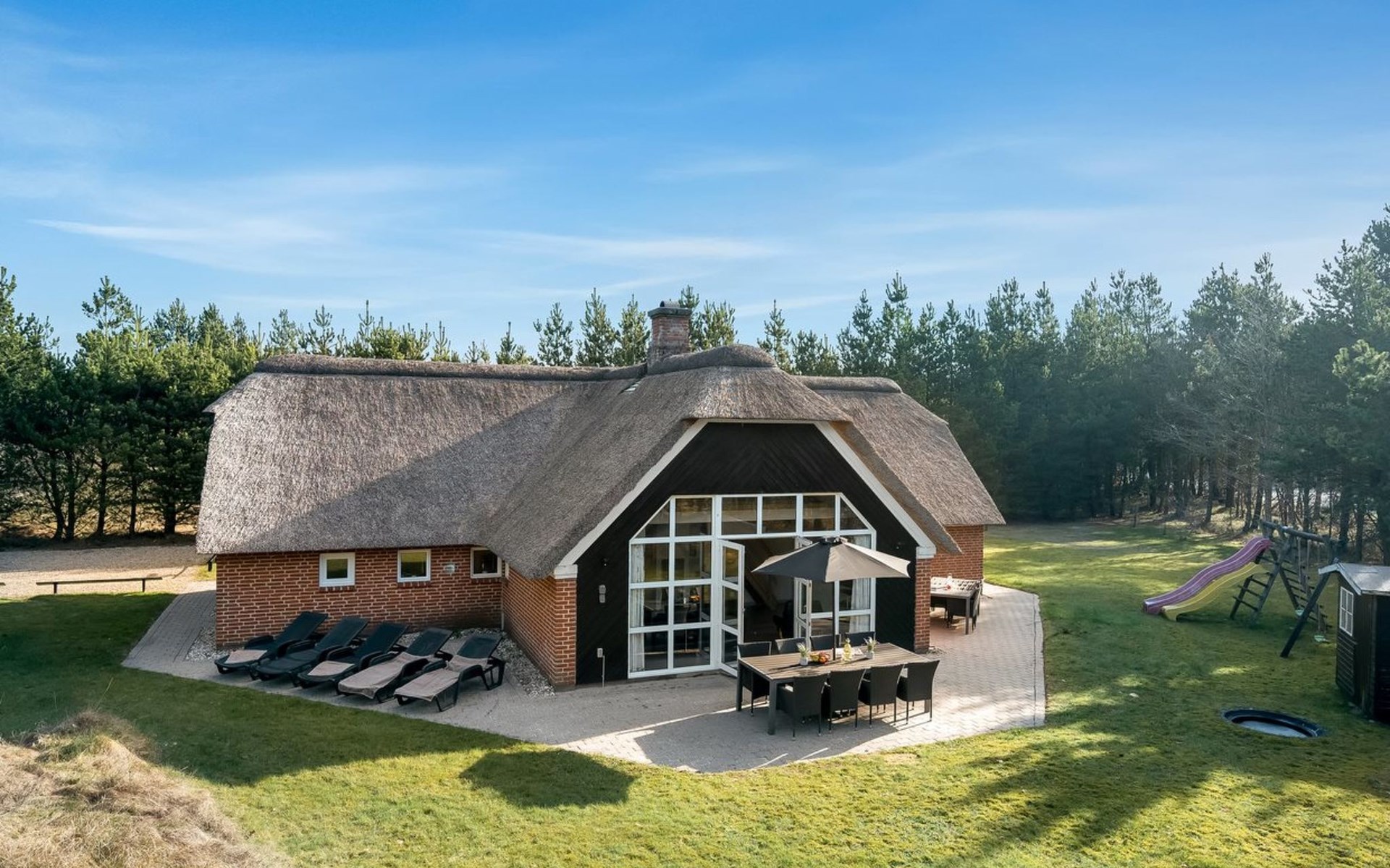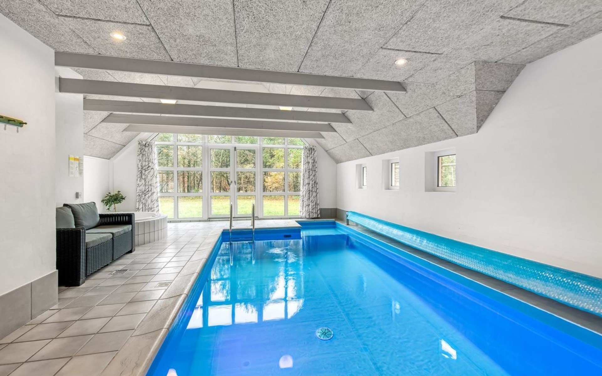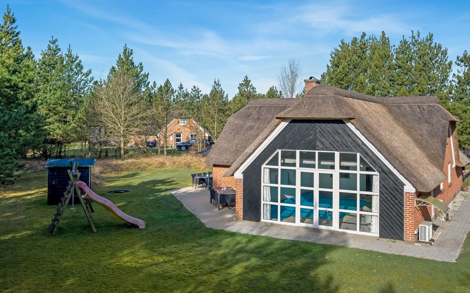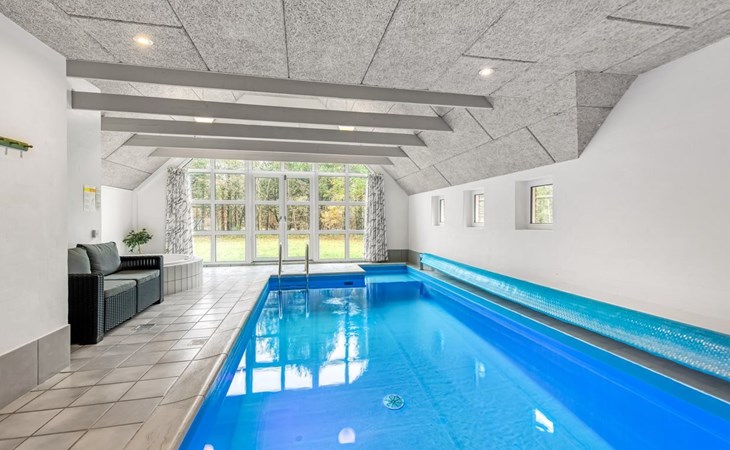 Single-family house, built in 1994. 4.3 km from the sea. Private: natural state property 1'800 m2, indoor pool (3 x 8 m, 24 m2, depth 140 - 140 cm). Terrace (55 m2), children's playground (slide). In the house: sauna, washing machine, tumble dryer. Parking at the house. E-charging station. Grocery 1 km.
