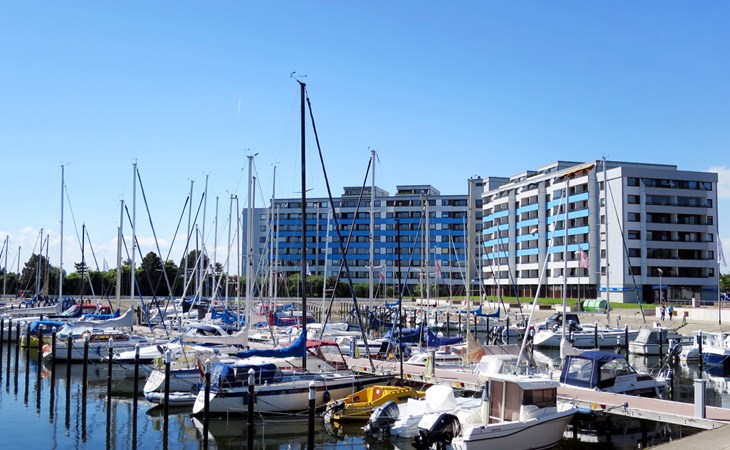 The port is expected to be closed until the end of 2024 due to construction work. Resort "Ostsee-Residenz", 7 storeys. In the centre of Damp 20 km from the centre of Eckernförde, 40 km from the centre of Schleswig, 100 m from the sea, direct access to the beach. For shared use: children's playground. In the complex: restaurant, bar, fitness room (extra). Bowling, table tennis (all extra), shopping facilities, boutique, lift, central heating system, bicycle rental. Parking at 100 m. Supermarket, bus stop 100 m, sandy beach 150 m, indoor swimming pool 300 m. Marina 100 m, golf course (18 hole) 1 km, tennis 1 km, minigolf 300 m. Please note: childminding (extra). Nightclub/disco close by.