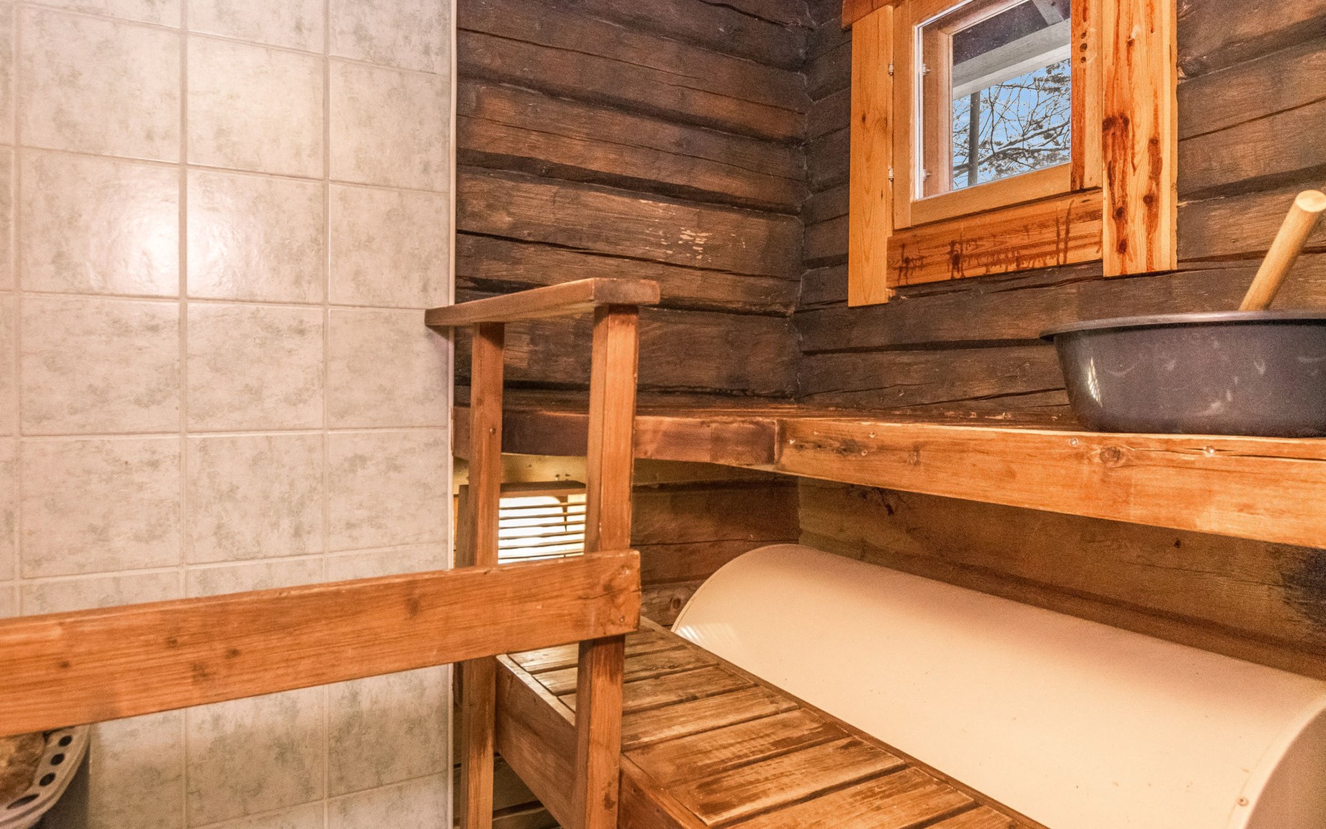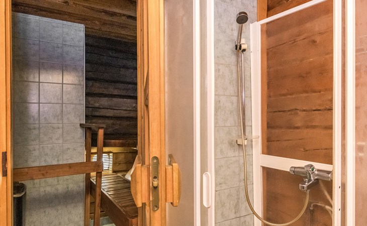 The bathroom includes a WC and shower, and the sauna has an electric stove.