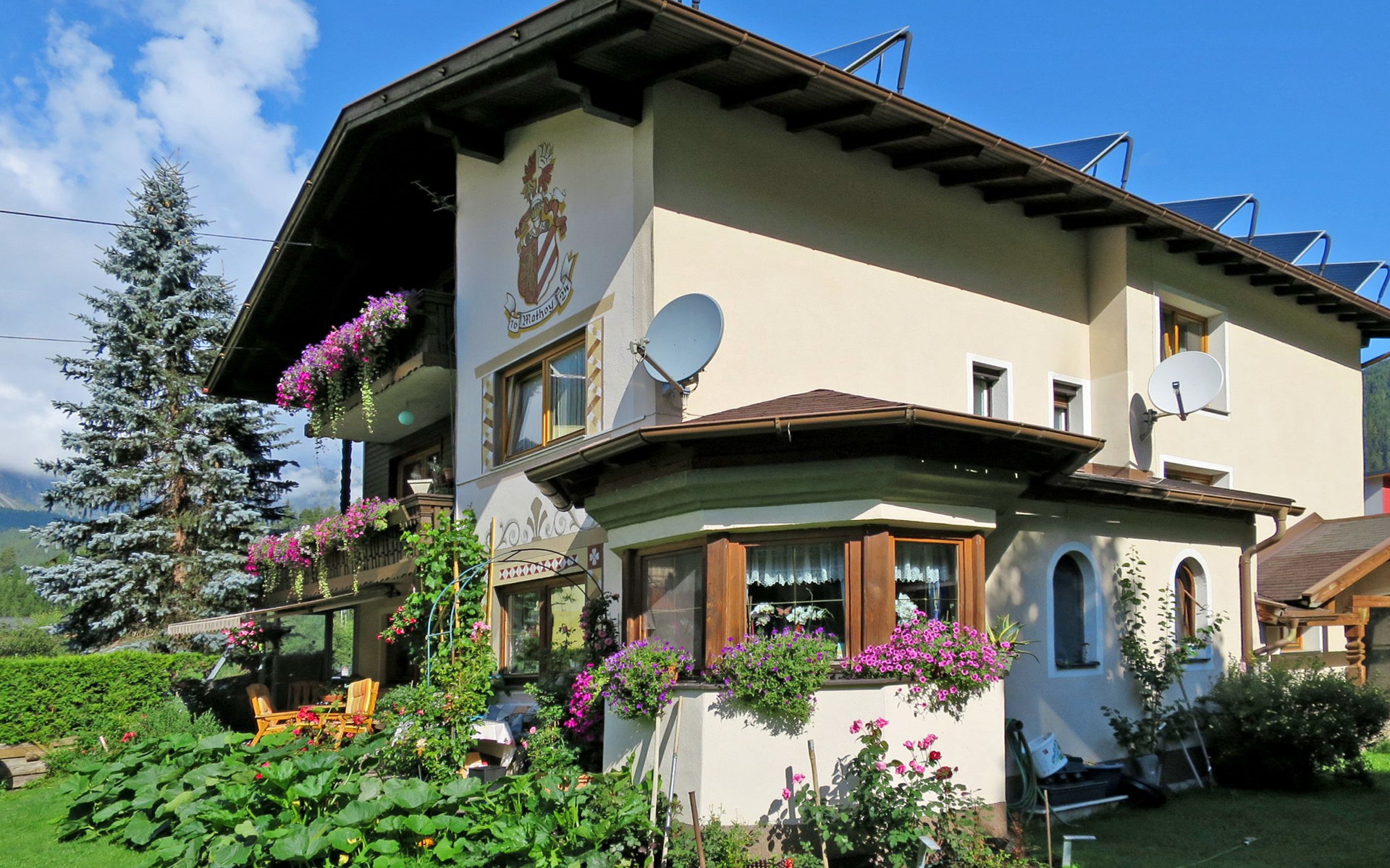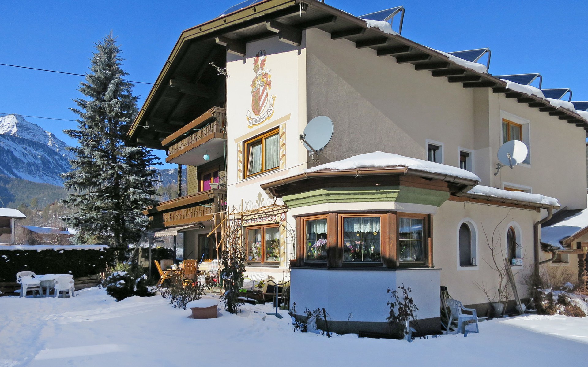 Au 3 km from Längenfeld: Large 2-family house "Mathoy". In the district of Au 3.5 km from the centre of Längenfeld, 17 km from the centre of Sölden. For shared use: beautiful garden with lawn and plants. Terrace, garden furniture, barbecue (slide, swing). In the house: storage room for skis, ski boot dryer. Bread roll service. Parking on the premises. Supermarket 3.5 km, restaurant, bakery 100 m, café 100 m, bus stop 200 m, thermal baths "Aqua Dome Längenfeld" 4 km. Gondola lift 17 km, cross country ski track 100 m. Well-known ski regions can easily be reached: Sölden 17 km, Ötz 14 km. Please note: the owner lives in the same residence.