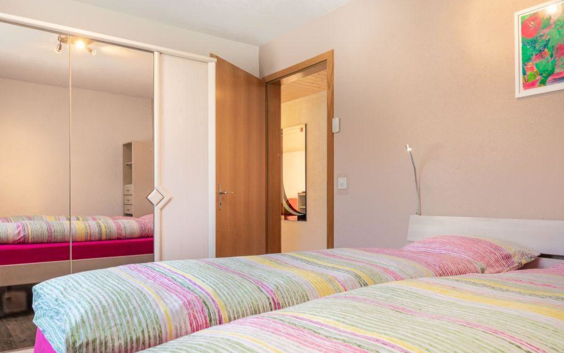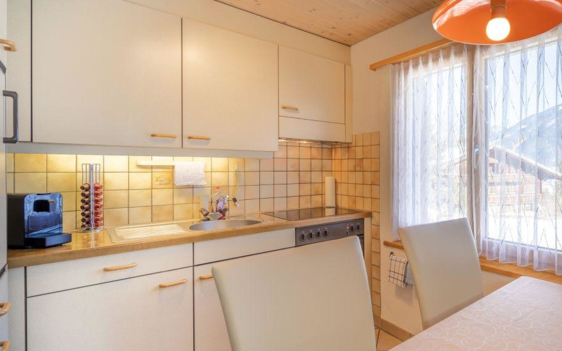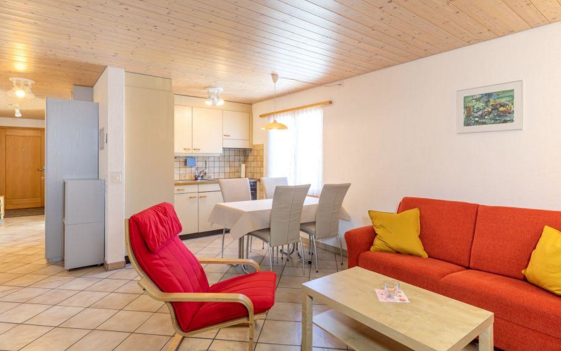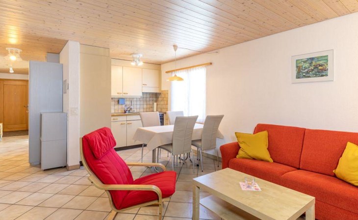 Well-equipped 2-room apartment with separate entrance to the house and apartment. Cozy living / dining room with pull-out sofa bed (140x200cm). 1 bedroom with grand lit (160x200cm). Open kitchen living room equipped with a capsule coffee machine (Delizio), raclette set and pressure cooker. Bathroom with shower and toilet. WiFi/TV/Radio/CD.