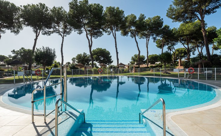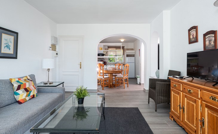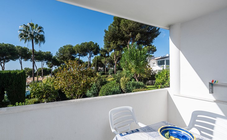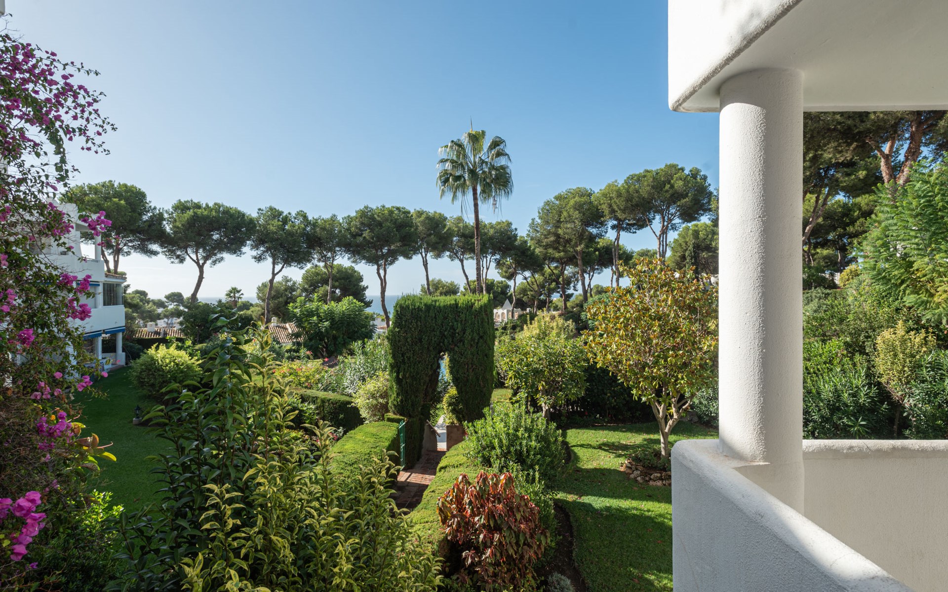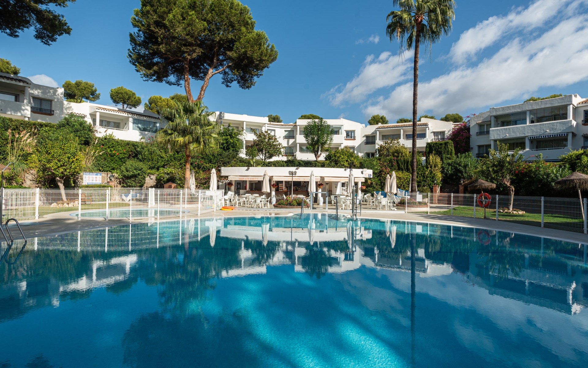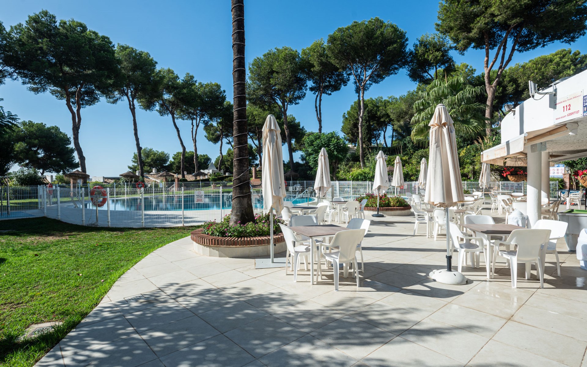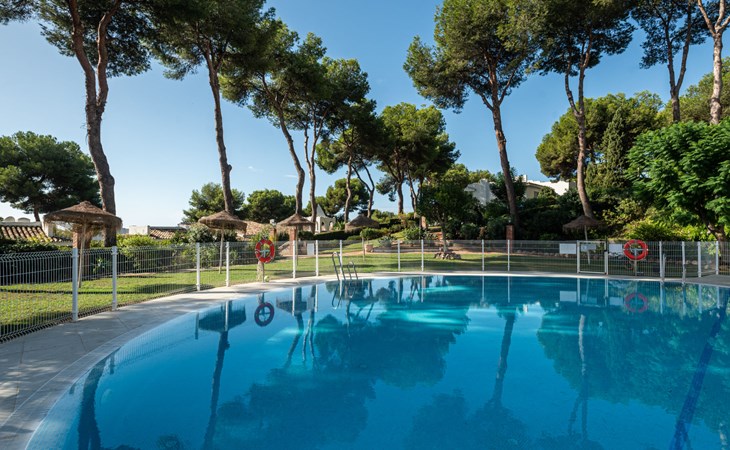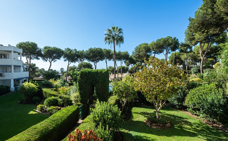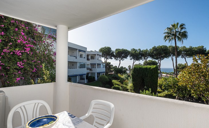 Mijas Costa 18 km from Marbella: Comfortable holiday development "Jardin de miraflores". In the resort Mijas Costa, 950 m from the sea. For shared use: property, well-kept garden with lawn, swimming pool (seasonal availability: 01.Apr. - 31.Oct.). Children's pool, outdoor shower, tennis, children's playground. Stepped path (12 steps) to the house. Public parking on the road. Shop, grocery 100 m, supermarket 1 km, restaurant 200 m, bus stop "Pueblo Miraflores" 550 m, sandy beach 950 m. Golf course (18 hole) 2 km. Please note: no lift.
