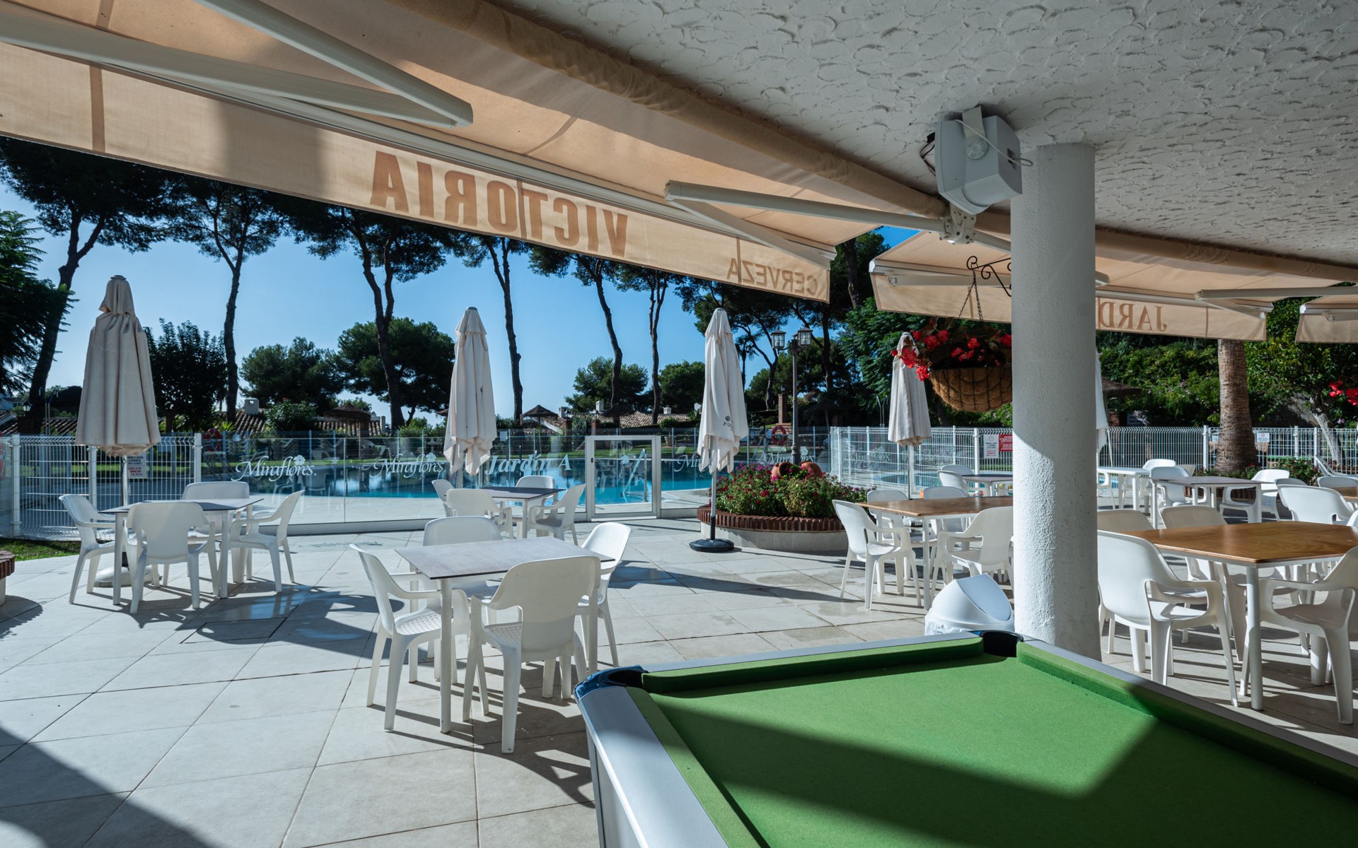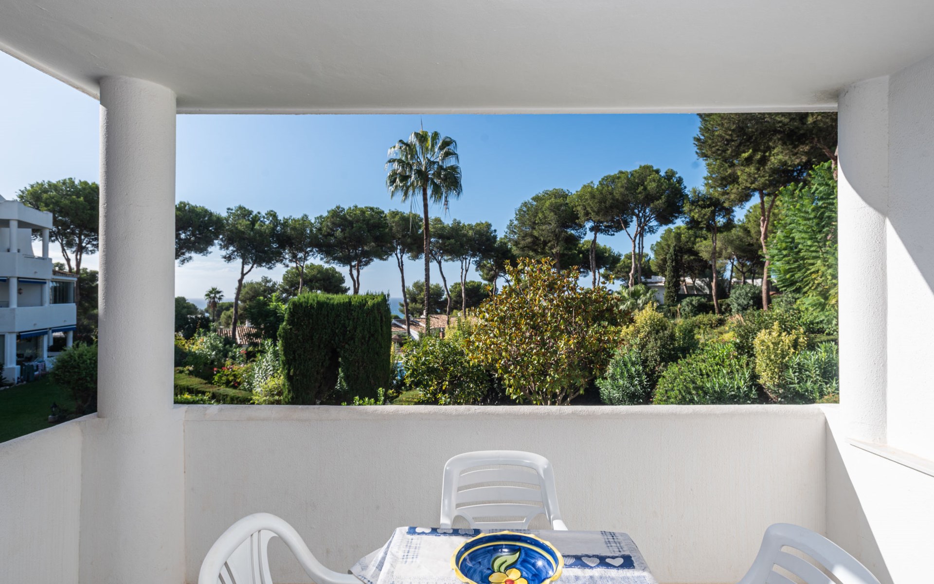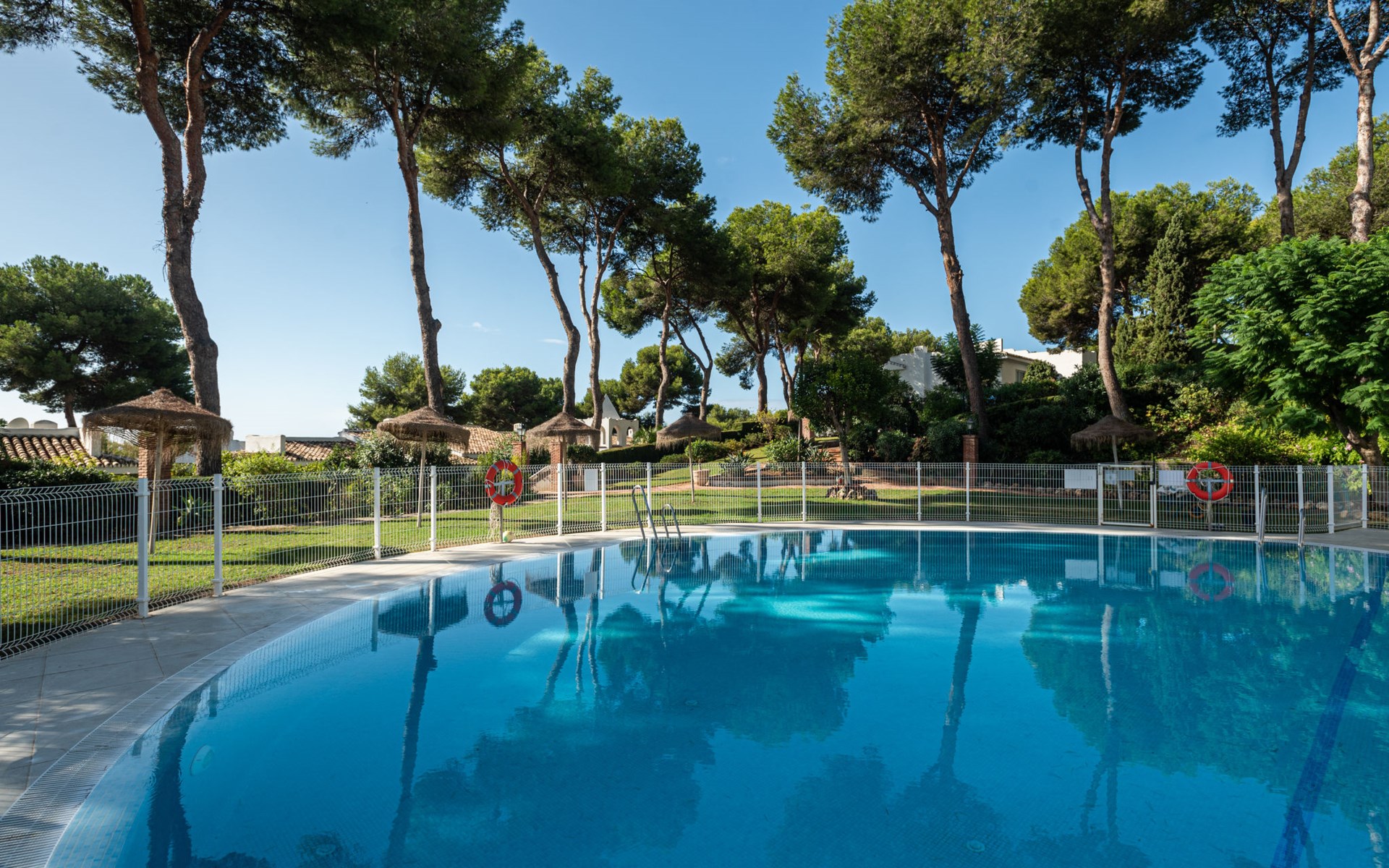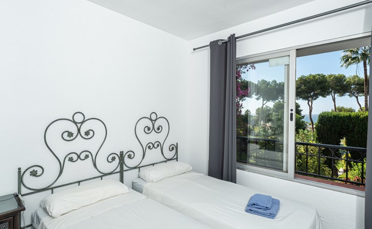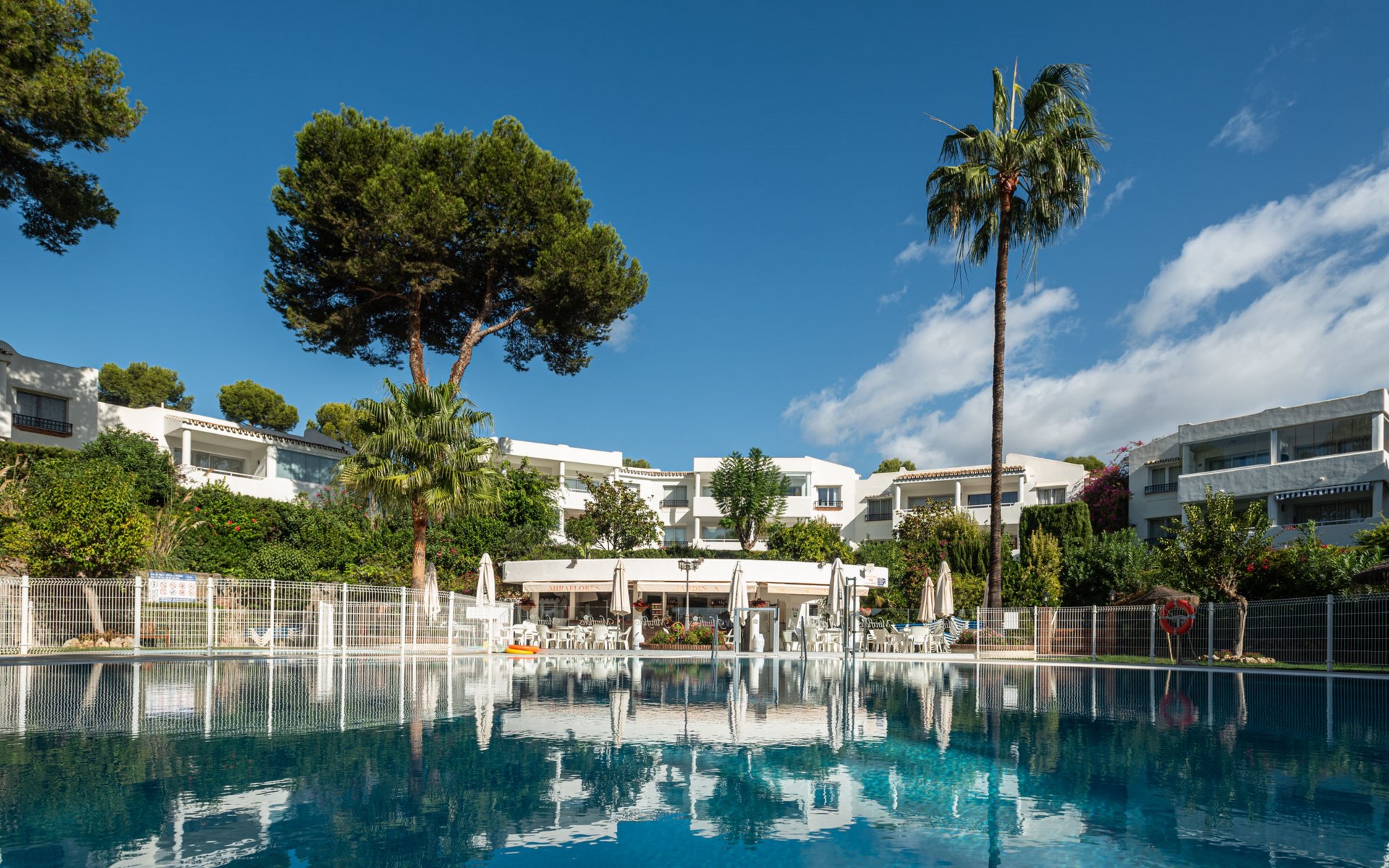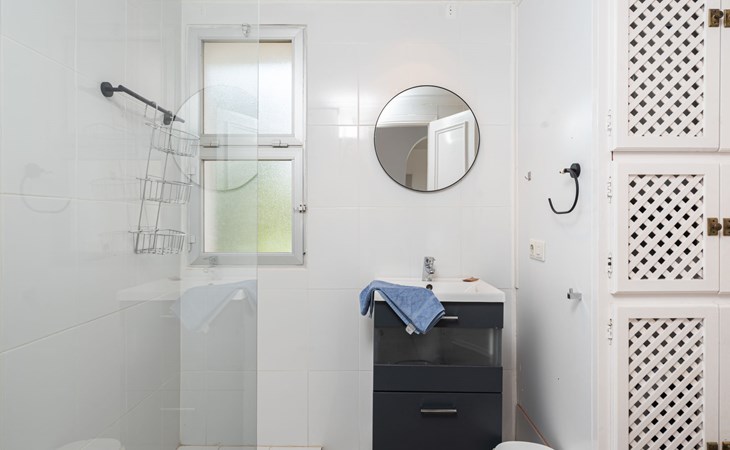 Mijas Costa 18 km from Marbella: Comfortable holiday development "Jardin de miraflores". In the resort Mijas Costa, 950 m from the sea. For shared use: property, well-kept garden with lawn, swimming pool (seasonal availability: 01.Apr. - 31.Oct.). Children's pool, outdoor shower, tennis, children's playground. Stepped path (12 steps) to the house. Public parking on the road. Shop, grocery 100 m, supermarket 1 km, restaurant 200 m, bus stop "Pueblo Miraflores" 550 m, sandy beach 950 m. Golf course (18 hole) 2 km. Please note: no lift.