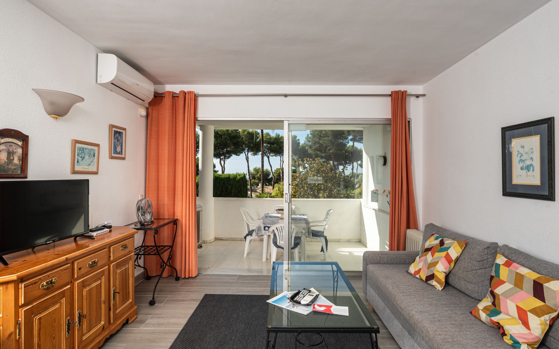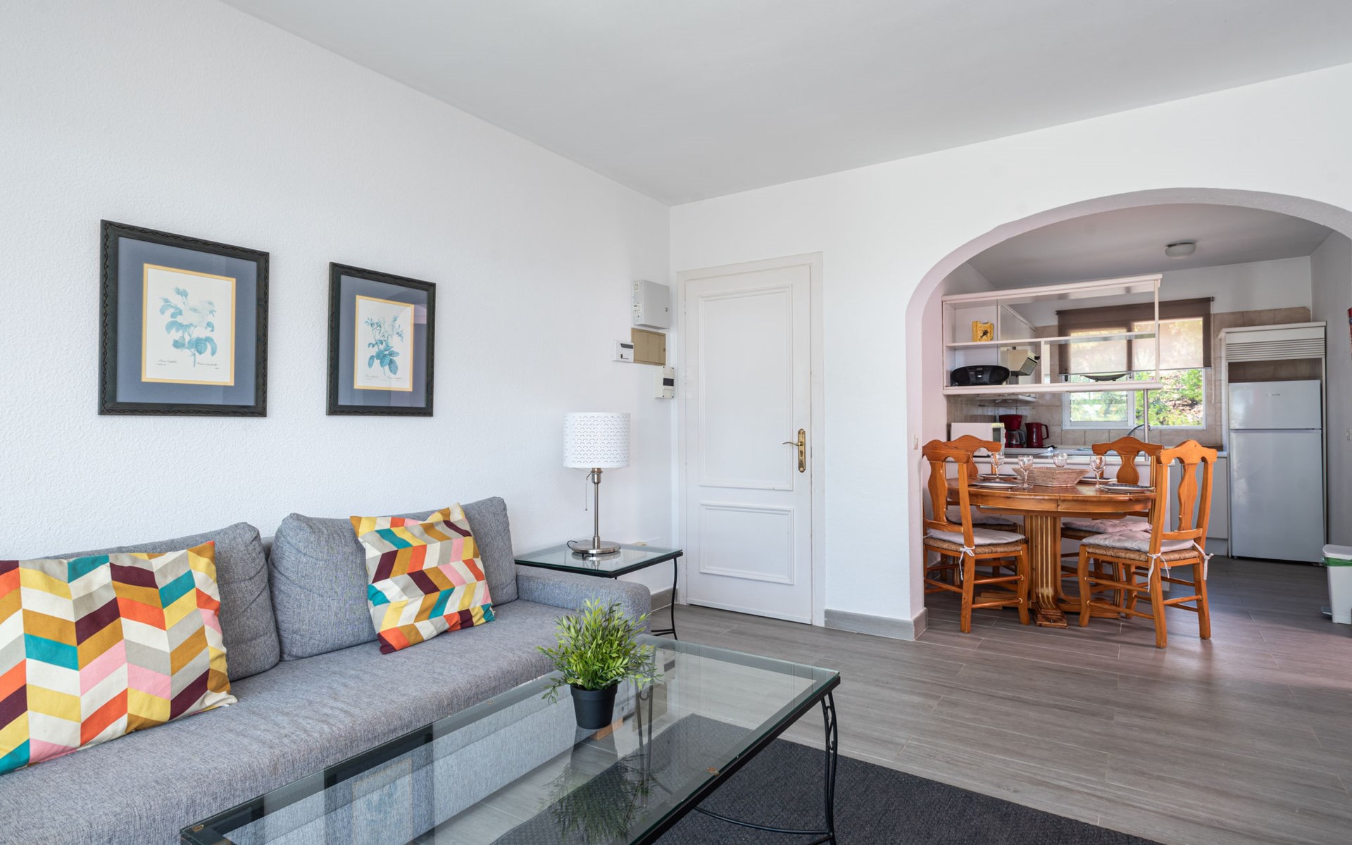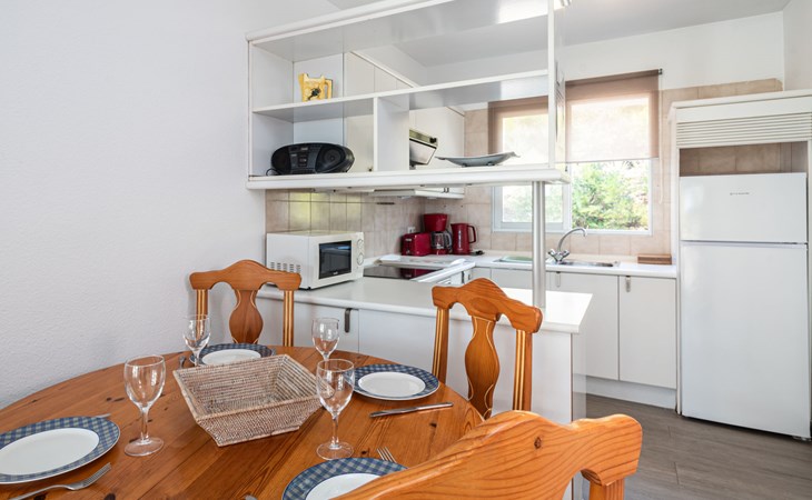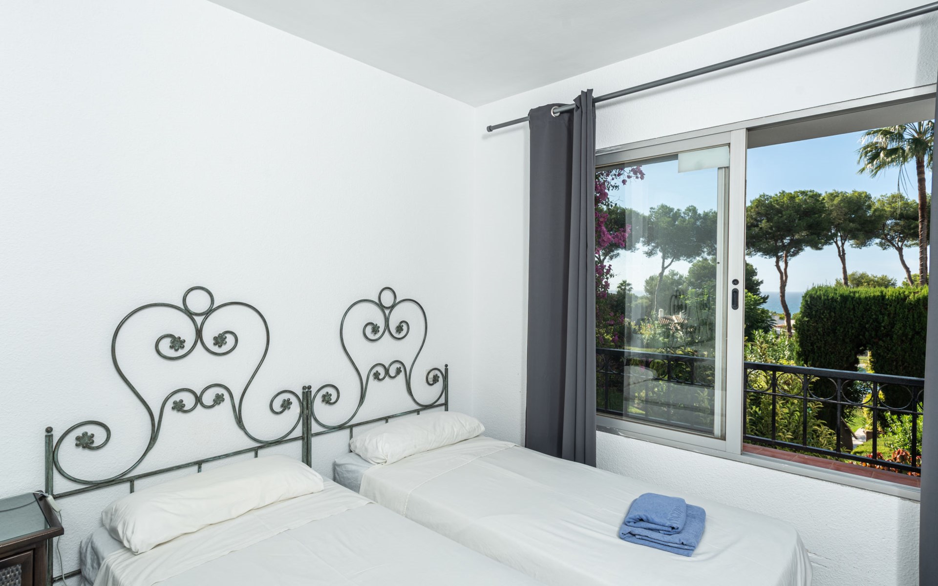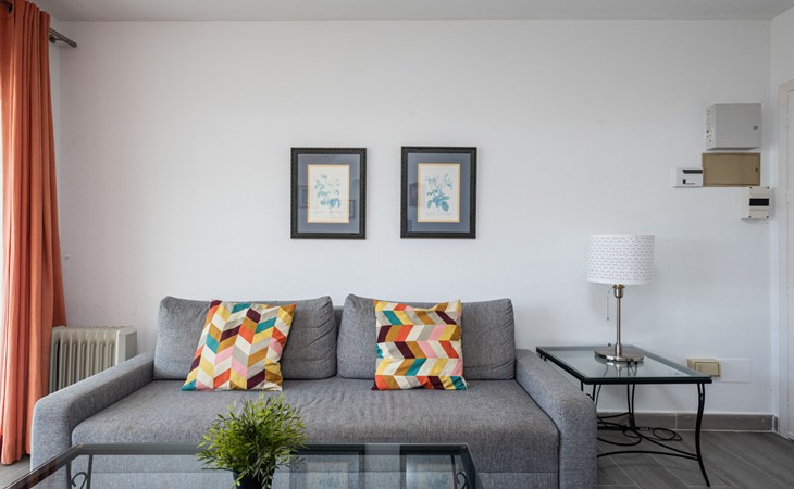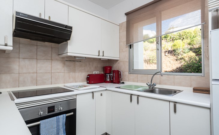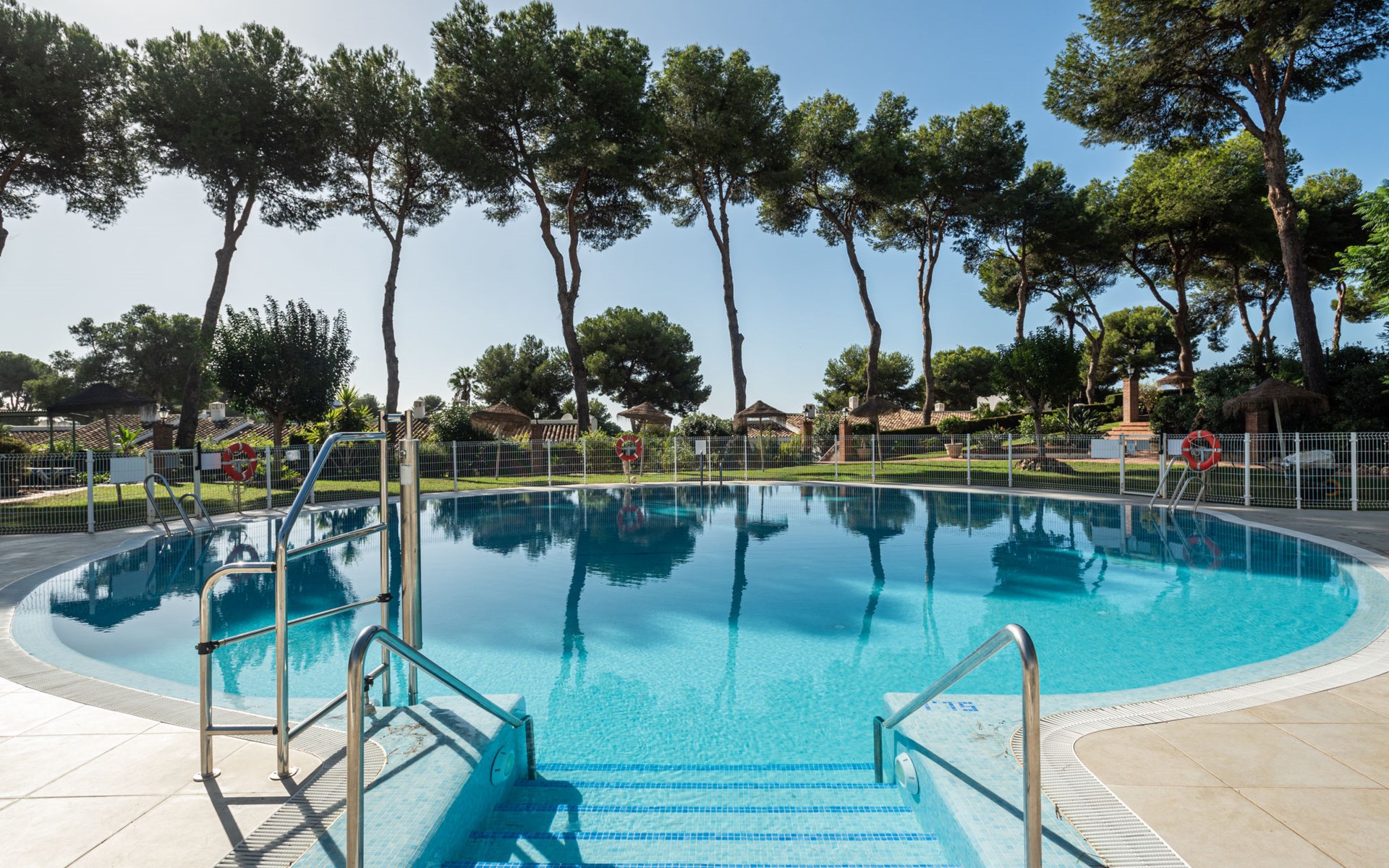 Mijas Costa 18 km from Marbella: Comfortable holiday development "Jardin de miraflores". In the resort Mijas Costa, 950 m from the sea. For shared use: property, well-kept garden with lawn, swimming pool (seasonal availability: 01.Apr. - 31.Oct.). Children's pool, outdoor shower, tennis, children's playground. Stepped path (12 steps) to the house. Public parking on the road. Shop, grocery 100 m, supermarket 1 km, restaurant 200 m, bus stop "Pueblo Miraflores" 550 m, sandy beach 950 m. Golf course (18 hole) 2 km. Please note: no lift.