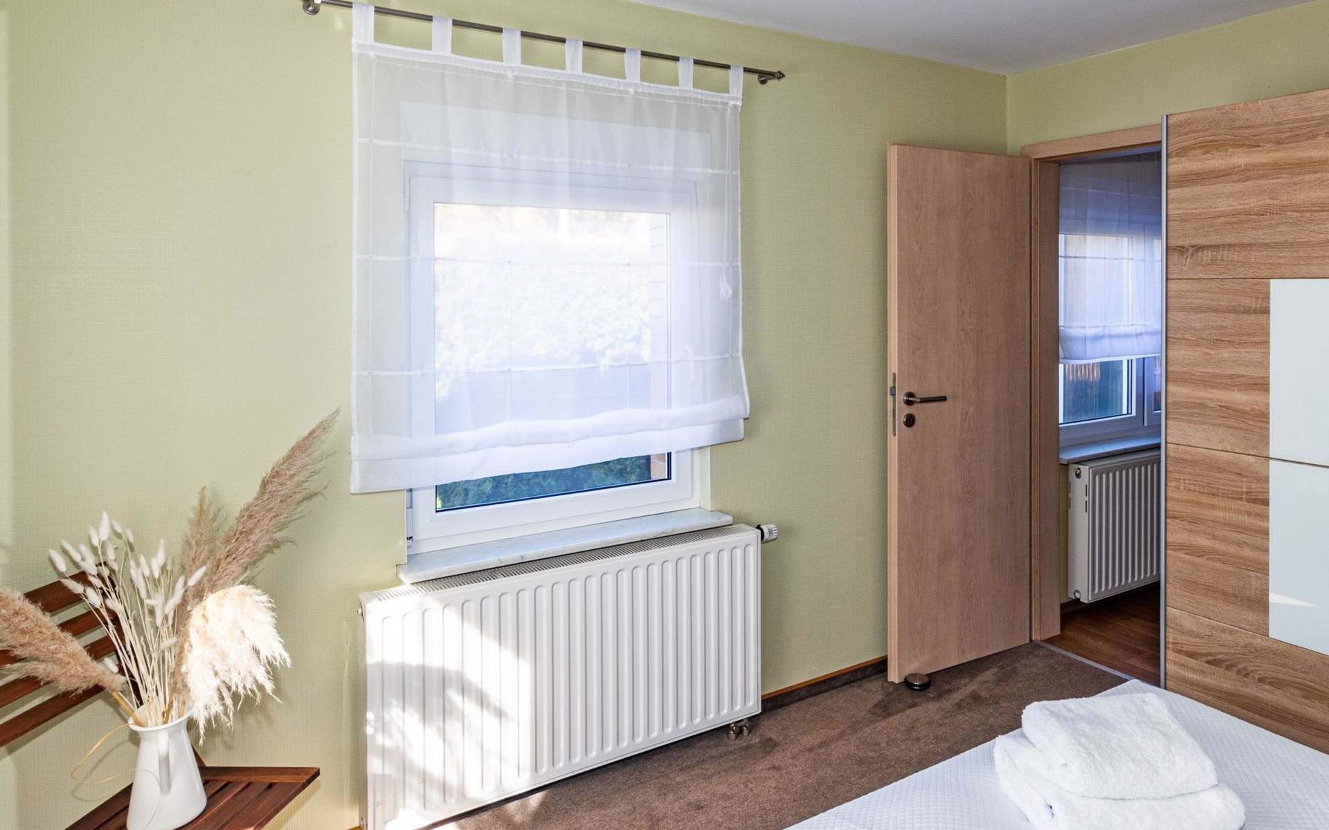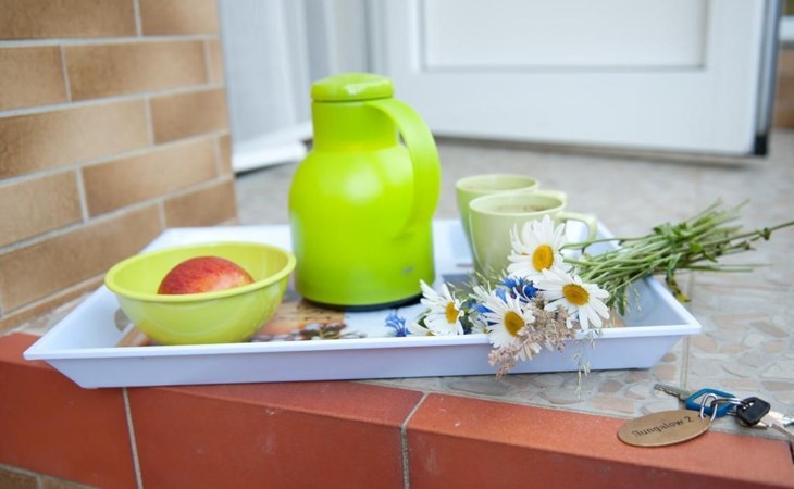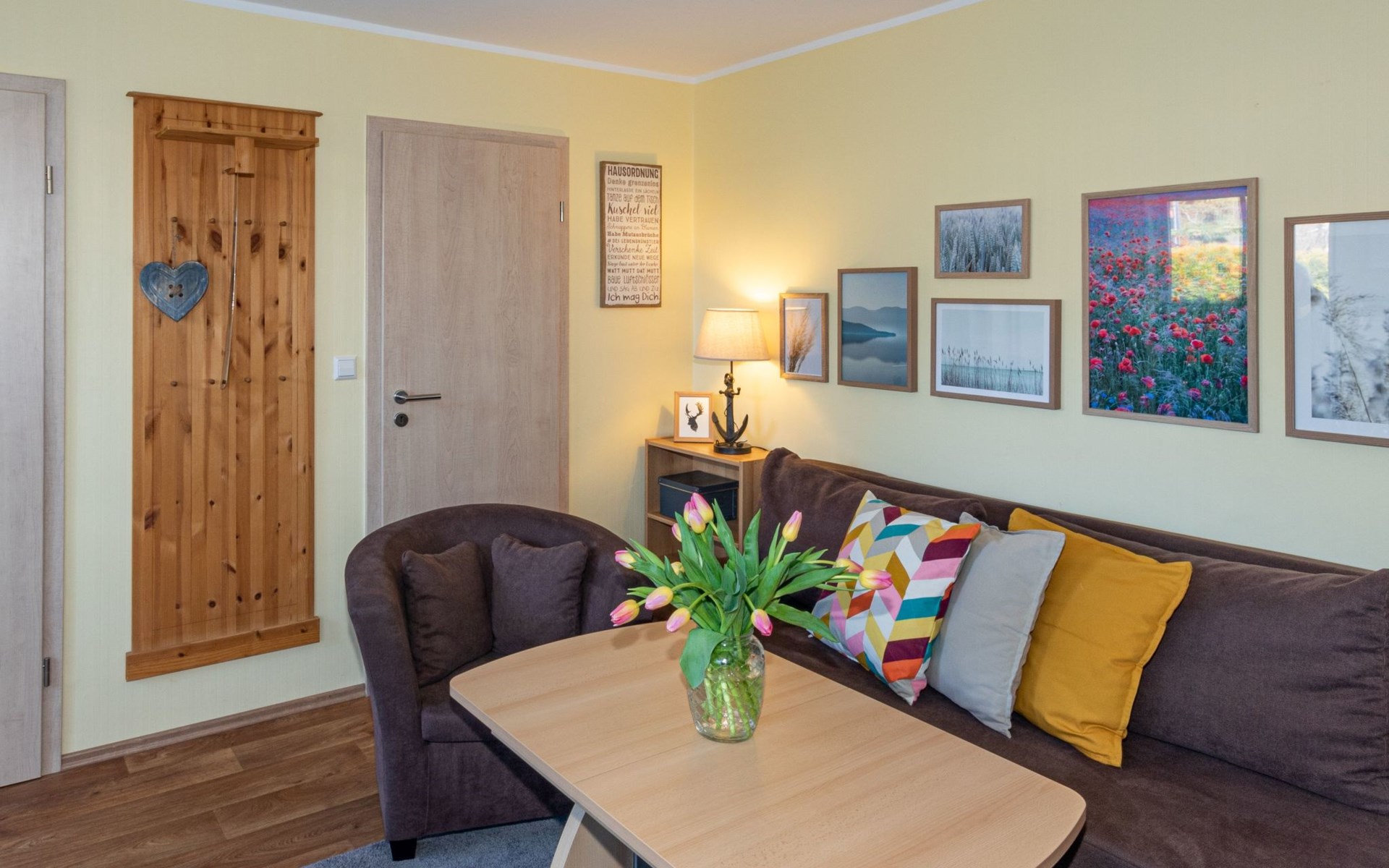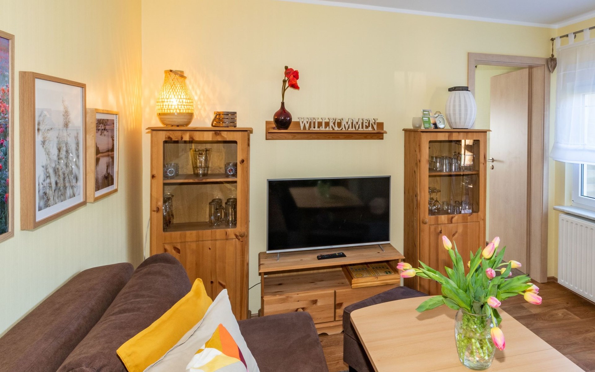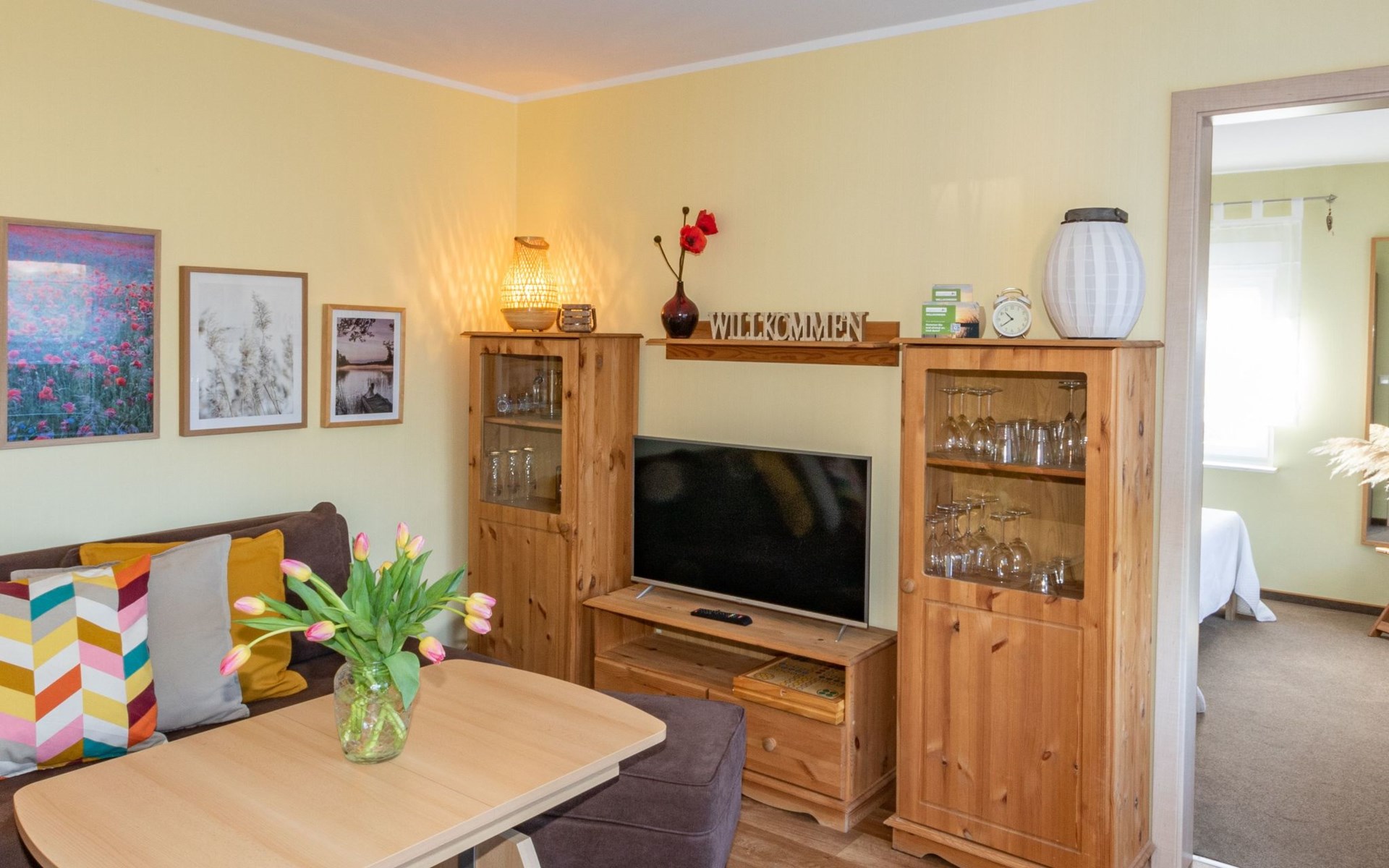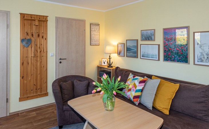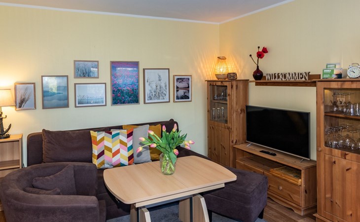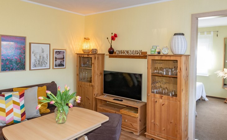 Inside the holiday home you will find a warm and inviting atmosphere, coupled with everything you need for a pleasant stay. The furnishings include a living/dining room with a satellite HD TV and CD radio for cosy evenings and a separate bedroom that invites you to dream after a day of exploring. The partial underfloor heating provides cosy warmth even on colder days. The kitchen equipment with fridge, electric cooker, crockery, coffee machine and kettle is ideal for self-catering.