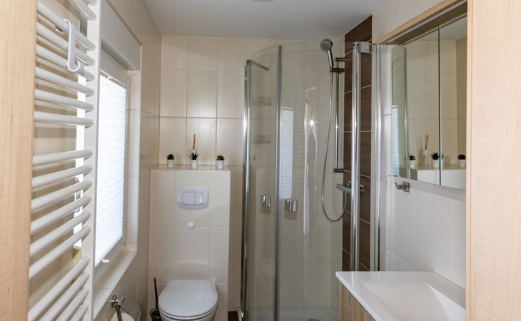 The outdoor area of the holiday home offers a private terrace that invites you to relax and sunbathe, complemented by an open sunbathing lawn and a cosy seating area. A barbecue is available for barbecue fans to round off the long summer evenings with culinary delights. The fully fenced area is particularly practical for guests with dogs, so that your four-legged friends can also enjoy their holiday to the full.