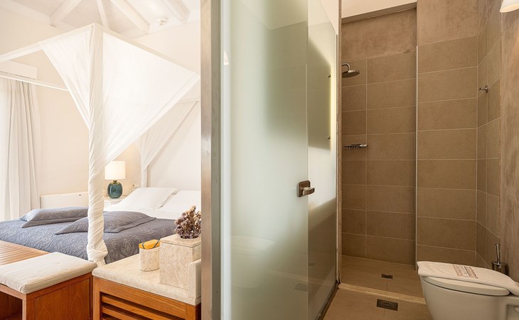Bedroom 1: King-size (1.80×2.00) bed, en-suite bathroom with hydromassage shower, private balcony with sea and garden view.