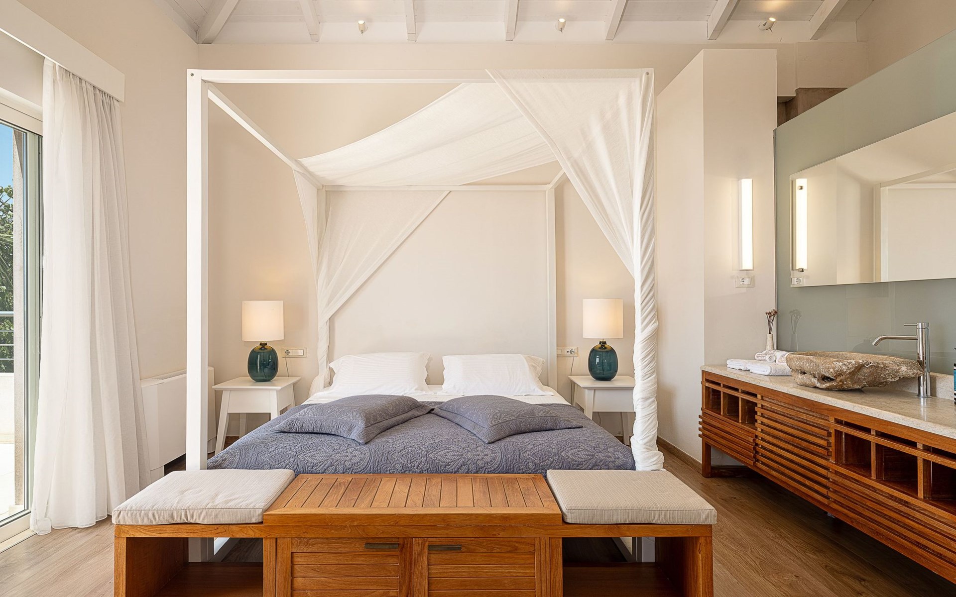 Adeste Seaview Villa ll is a two-story villa consisting of three bedrooms, two of them on the upper floor, one with twin beds with a sea view, and another with a king-size canopy bed. The third bedroom on the ground floor has a king-size bed with a sea view. On the ground floor, there is a communal WC and an ensuite bathroom, and on the upper floor 2 ensuite bathrooms. Luxury and modern design complete the scenery of contemporary architecture and high-quality products. Entering the villa on the ground floor you will find a spacious open area with a fully equipped contemporary kitchen that has branded appliances and facilities, making holiday cooking a most pleasurable experience. The area is completed with a dining room and a living room with a 42’’ Satellite LED TV. The large windows create the illusion of transparency and provide a seamless transition between the indoor and outdoor areas.