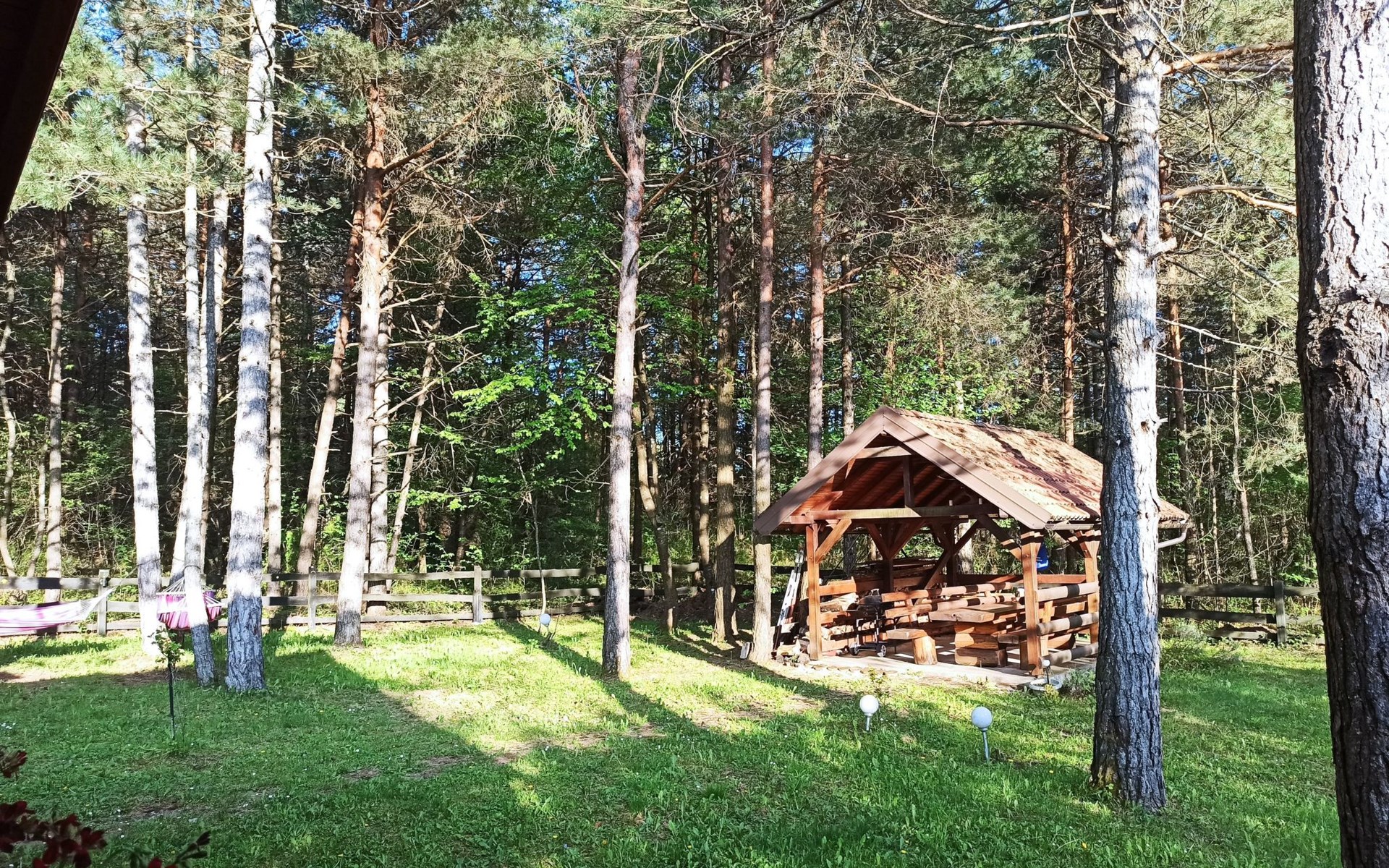 The outdoor space of this house is truly where nature's embrace can be felt. Surrounded by a lush garden for sole use, children can delight in the playground while adults unwind on the terrace or cabana. A unique feature is the hammock, perfect for soaking in the surroundings. For hiking and cycling enthusiasts, there's a trail, and the property's position directly at the edge of the wood opens up endless possibilities for exploration.