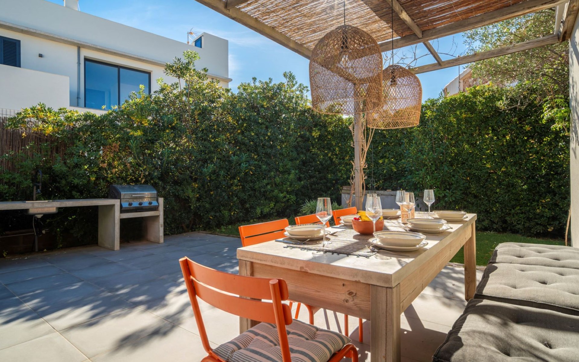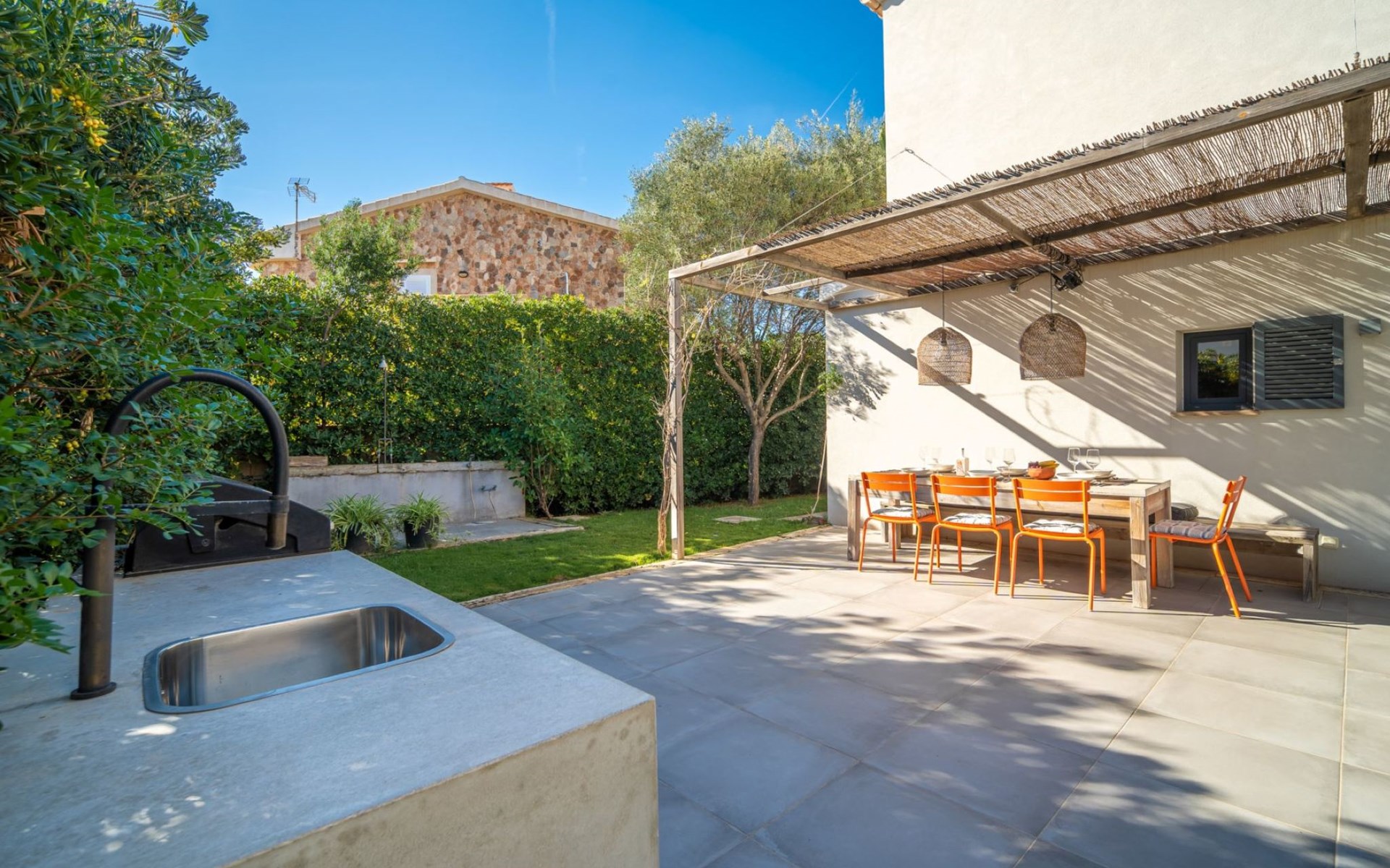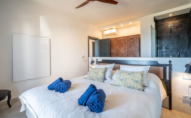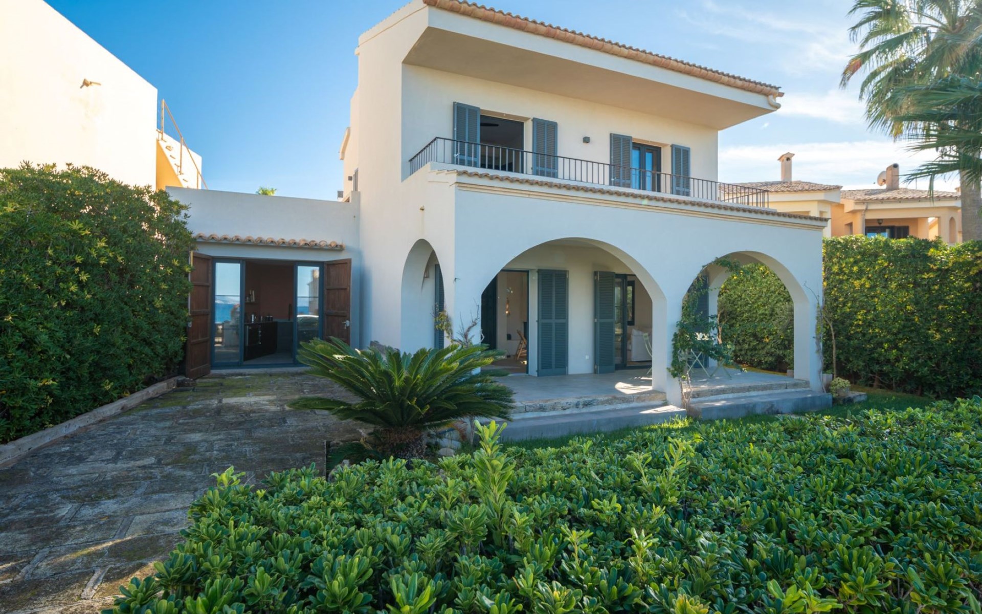 S'Estanyol 3 km from Colonia de Sant Pere: Large, modern, beautiful house "Can Popi", 2 storeys. In the district of Urbanización s'Estanyol, in the resort 1.8 km from the centre of Colònia de Sant Pere, in a quiet, sunny position residential area (villas), 15 m from the sea, 750 m from the beach, road to cross, direct access to the beach. Private: beautiful garden with lawn and wildlife garden. Outdoor shower, patio, arbour, garden furniture, barbecue. In the house: internet access, WiFi, air conditioning, washing machine. Parking at the house. Shop 1.8 km, supermarket 2 km, restaurant 1.9 km, bar 1.9 km, bakery 2.3 km, 20 minute walk to the centre, bus stop "Plaça Bassa d'en Fasol. Colonia." 2 km, sandy beach "Playa de Sa Canova" 350 m, swimming bay 15 m. Sports harbour 1.8 km, golf course (18 hole) 18 km, sailing school 2.1 km, riding stable 12 km, walking paths from the house, cycle lane 300 m. Nearby attractions: Son Serra de Marina 15 km, Betlem 5.7 km, Can Picafort 21 km, Artá 13 km, Cala Ratjada 24 km, Capdepera 20.9 km. Hiking paths: Ermita de Betlem 3.5 km, Parc Natural de Llevant 5 km, Finca Son Real 10 km. Please note: car recommended. Suitable for families, baby equipment on request (included). The owner does not accept any groups. The owner does not accept any youth groups. Loading and unloading of baggage is possible at the holiday house. Airfield 73 km from the property. Neighbourhood highly sensitive to noise. Quietness and good behaviour expected.