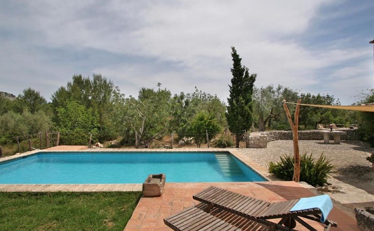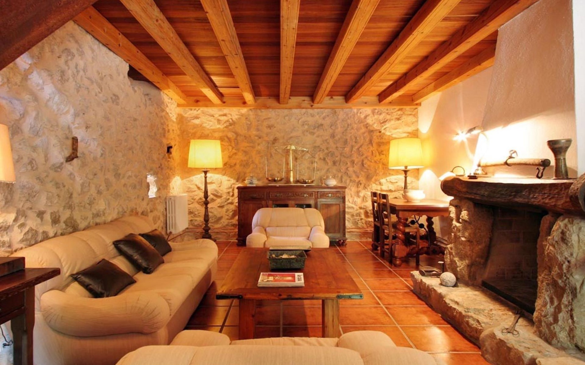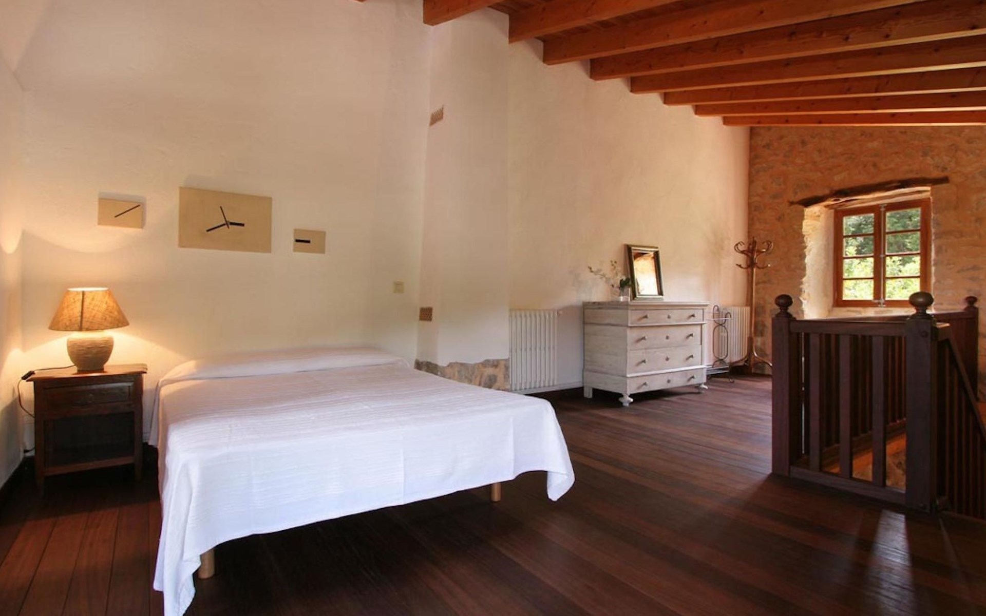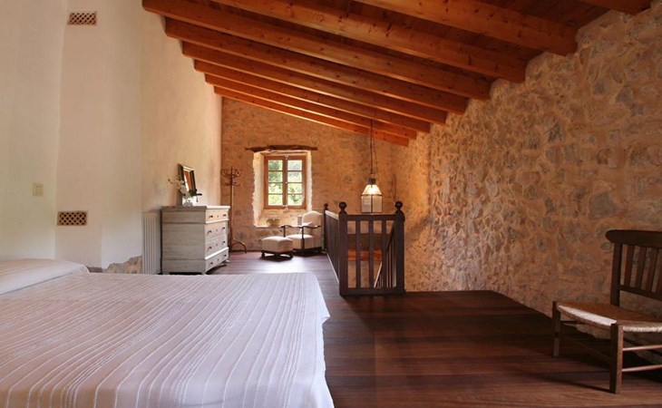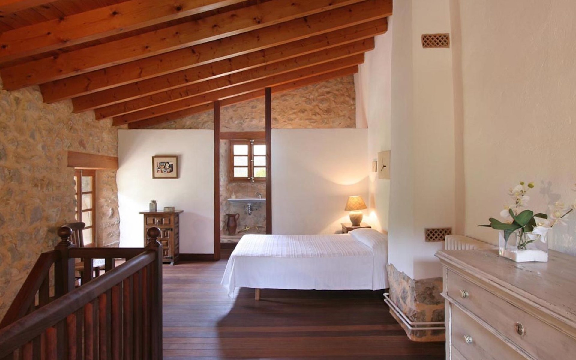 The two-storey house is decorated and furnished in a rustic style, as well as other traditional elements such as exposed stone walls, wooden beams, terracotta floors and so on. Old wooden doors give access to the interior of the house, which welcomes us with a spacious dining room. A few steps lead from the dining room to a small living room fully equipped with WIFI internet connection, TV and DVD. Behind the living room is the kitchen, equipped with electric oven, gas hob, fridge/freezer, microwave and dishwasher. The washing machine is located in a small laundry room just behind the house. A separate living room with stone walls, a fireplace and a shower room complete the ground floor of the house. A wooden staircase leads to the master bedroom, which has a double bed and an en suite bathroom. This room has a wooden floor and beautiful views of the mountains. A second staircase leads to the rest of the bedrooms (two double and one twin) which share a full bathroom with bath and shower. The swimming pool has steps for easy access, and is surrounded by terraces furnished with outdoor furniture.