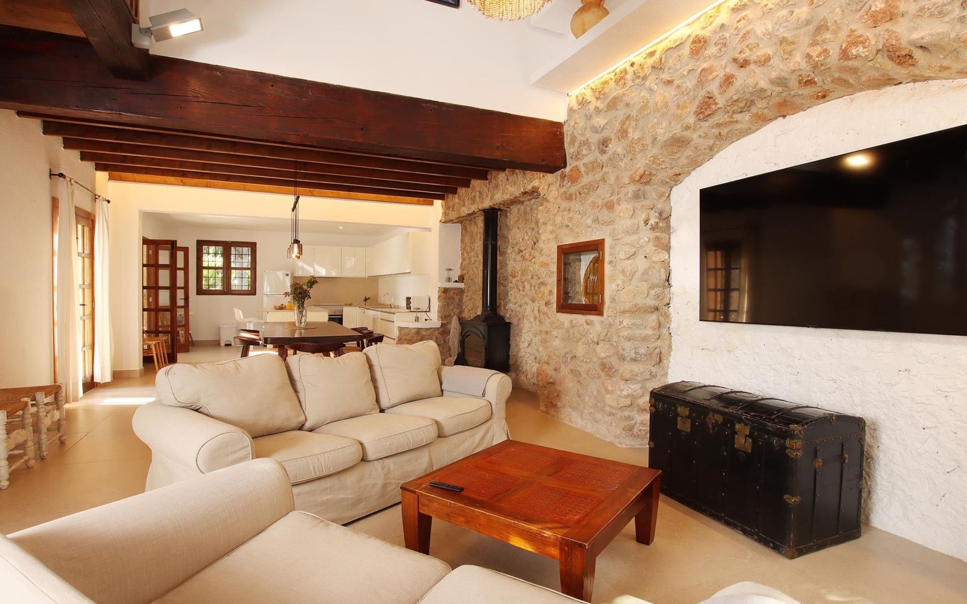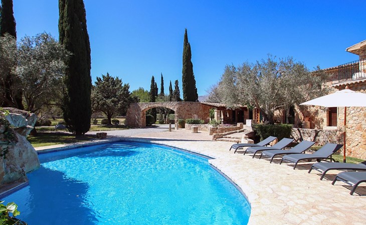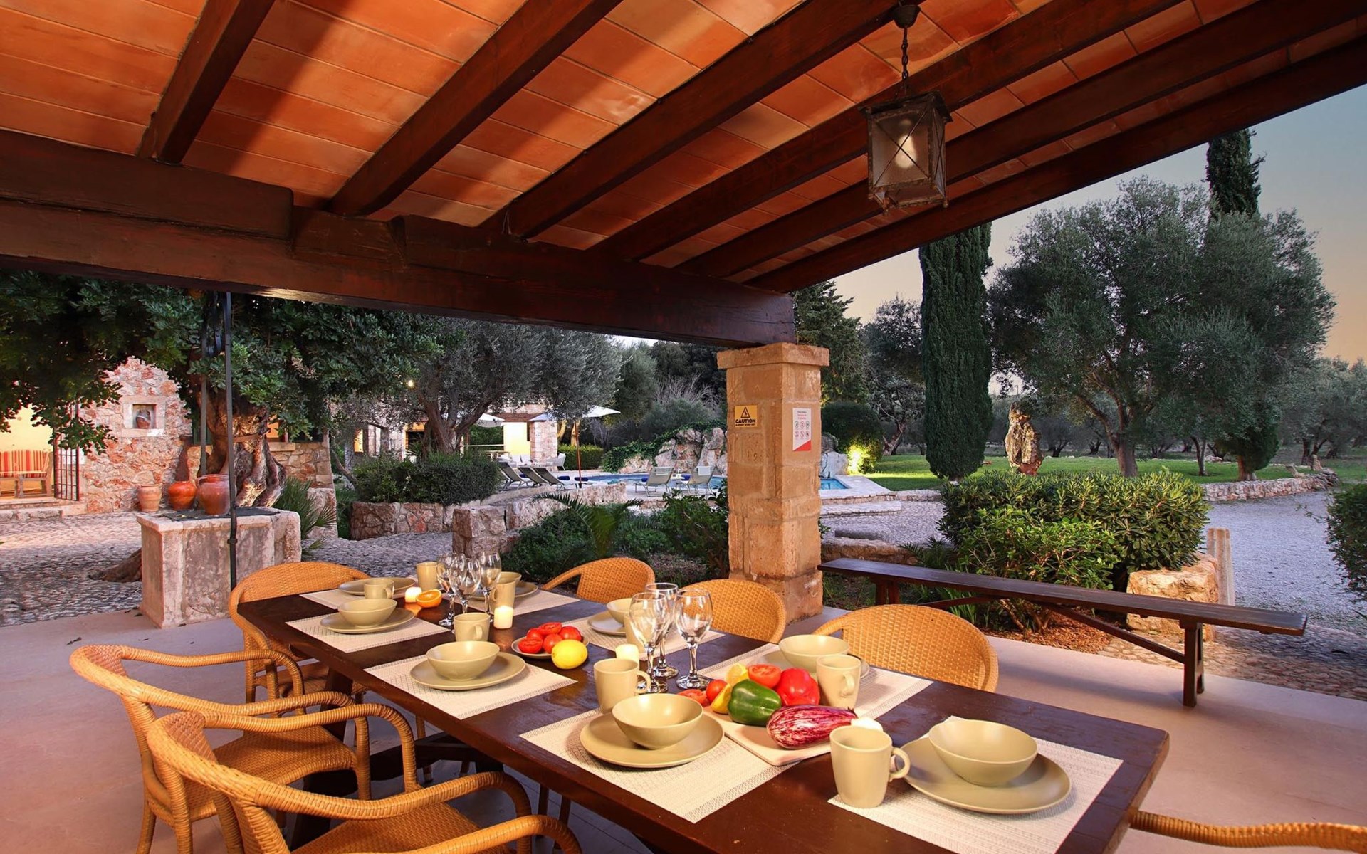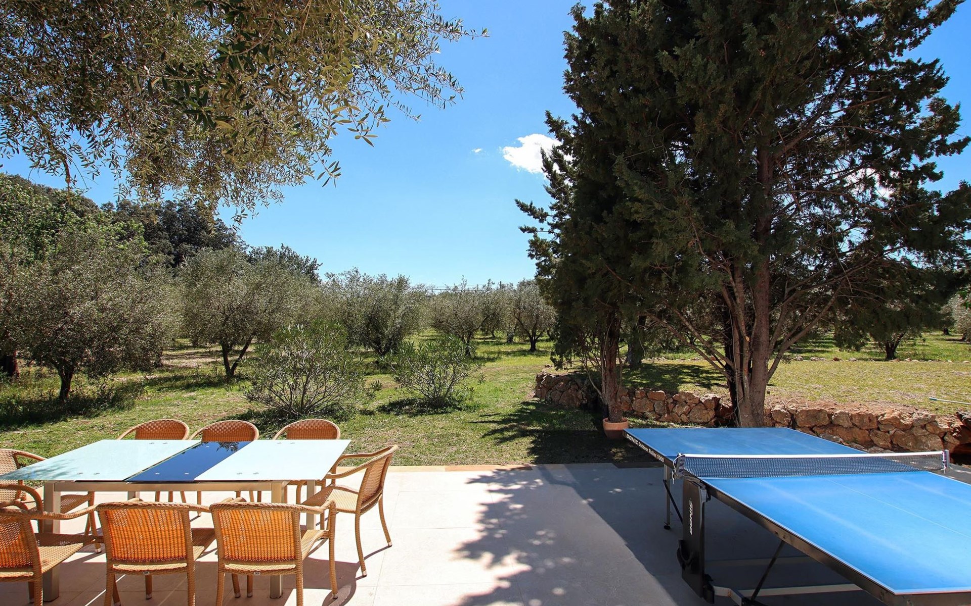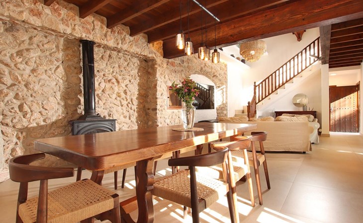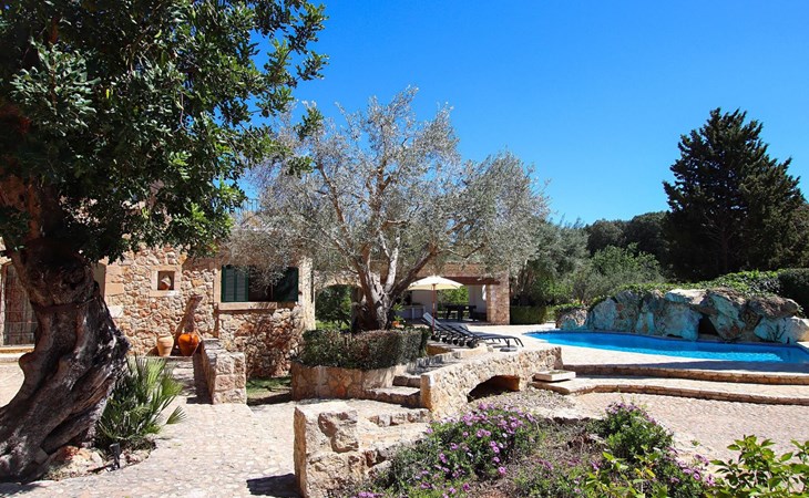 The Bennassar farm stands out for its exterior, located in a field of olive trees, and for its stone terraces, in which a centenary carob tree is located that offers a refreshing shade to whoever wants it. Next to it is a stone bridge that crosses a small but charming pond with plants, and the pool, asymmetrically shaped and large. There is a large outdoor area with several loungers where you can relax and sunbathe, as well as a practical covered barbecue area where you can enjoy a good grill.