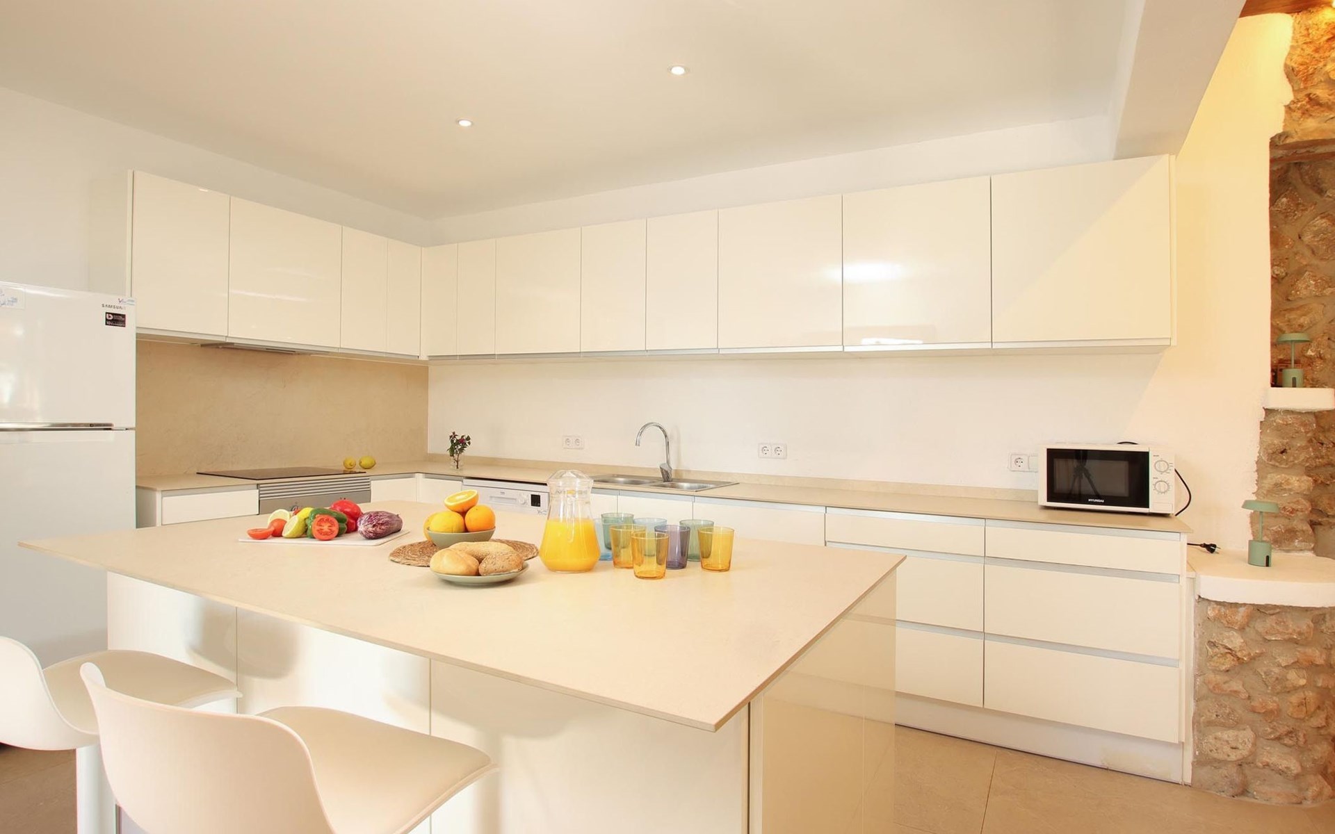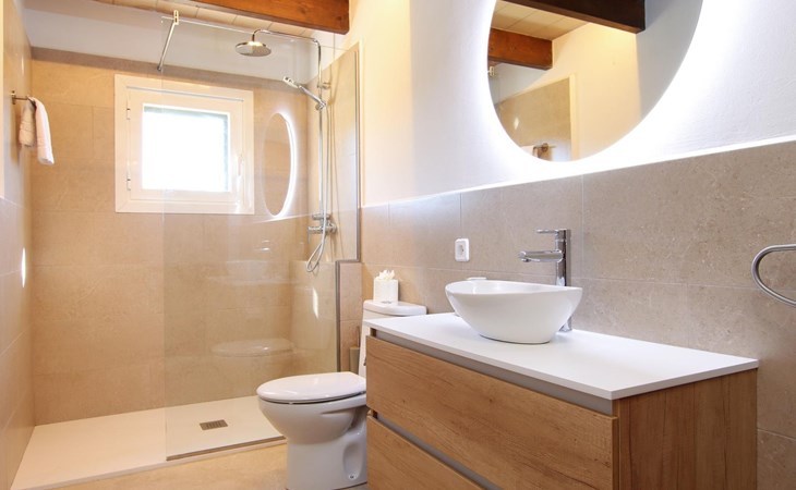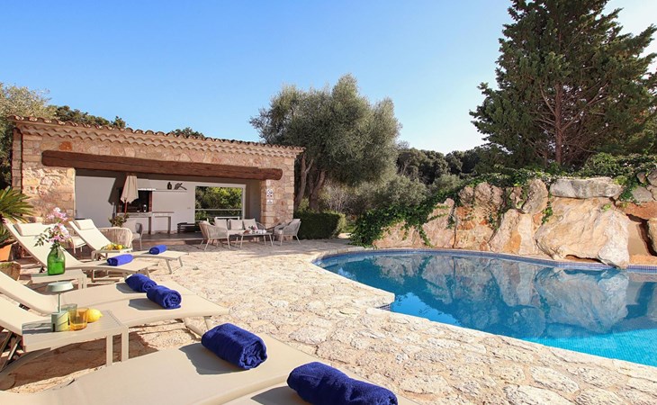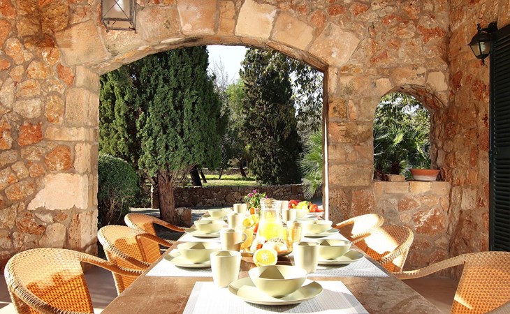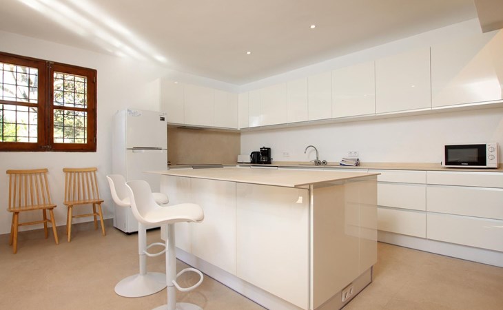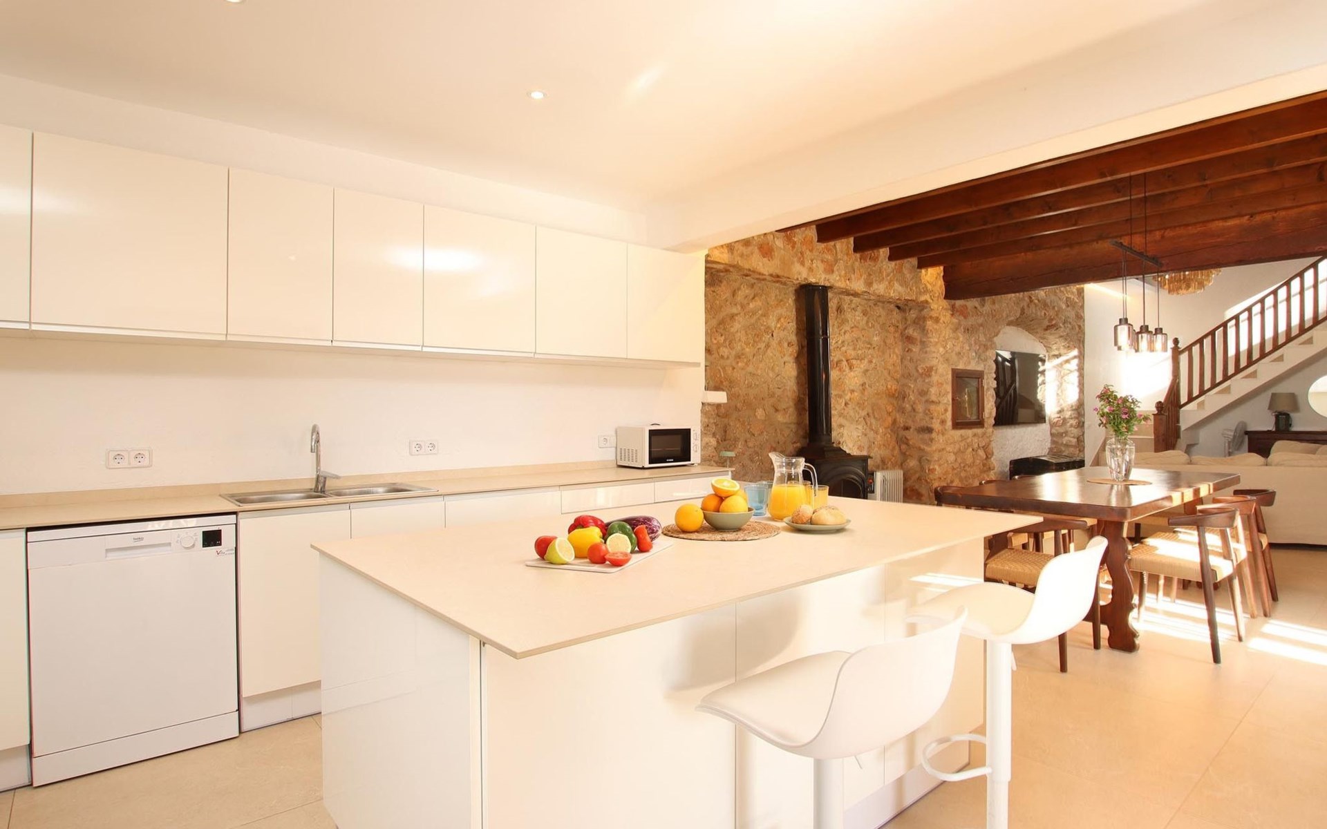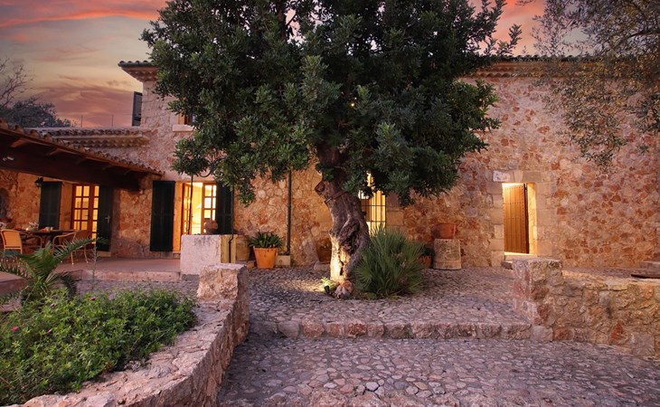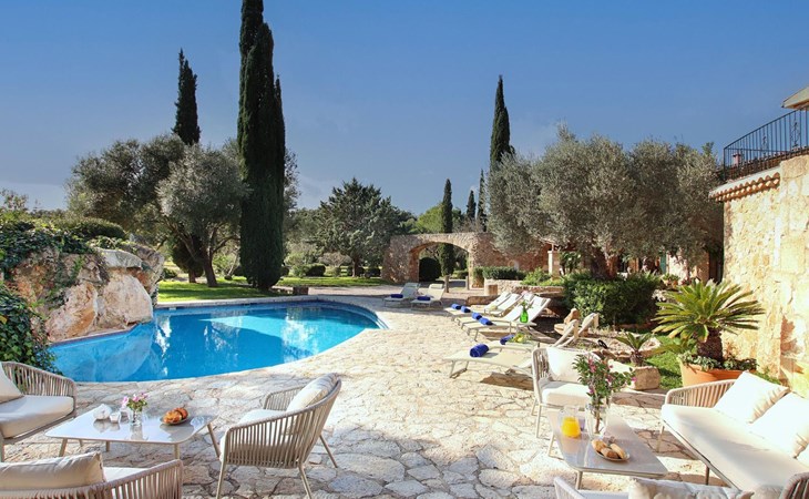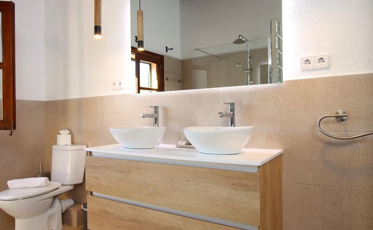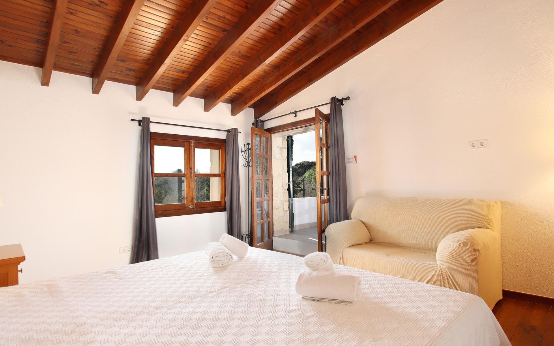The Bennassar farm stands out for its exterior, located in a field of olive trees, and for its stone terraces, in which a centenary carob tree is located that offers a refreshing shade to whoever wants it. Next to it is a stone bridge that crosses a small but charming pond with plants, and the pool, asymmetrically shaped and large. There is a large outdoor area with several loungers where you can relax and sunbathe, as well as a practical covered barbecue area where you can enjoy a good grill.