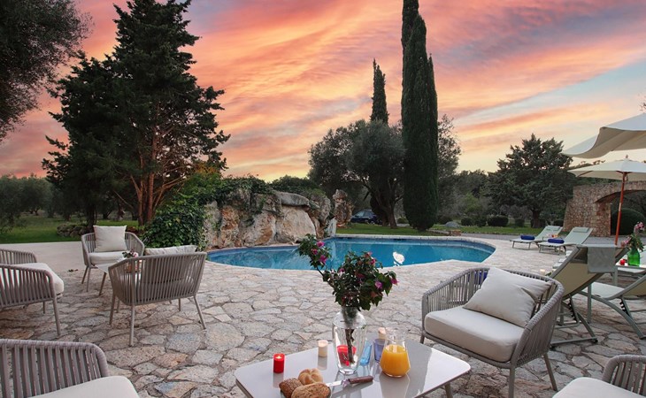 Upon entering the house, we find a spacious living room with interior walls lined with stone and an ornamental fireplace. In the dining room there is a solid oak wood table, sofas and satellite TV system, DVD, Internet connection via Wi-Fi and direct access to one of the terraces. Adjacent to this room we find the kitchen, perfectly equipped with an electric oven, dishwasher, microwave, fridge-freezer, and other utensils. The kitchen also has direct access to a covered terrace. On this floor there is also a double bedroom and a complete bathroom.On the upper floor we find another comfortable space with sofas. In addition, here you will find a double room with pastel colored walls, and a double room with a private terrace, which offers fabulous views of the pool and the olive grove that the estate has. Both bedrooms share a full bathroom.The fourth room is located in an annex, with its own exterior access and very close to the main entrance. It is a spacious double room with an en-suite bathroom. In the annex there is also the laundry room.It should be noted that all rooms have air conditioning with restricted hours.