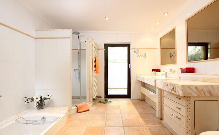 Stairs lead up from the parking area to the garden and the annexe, which consists of two parts. The first part of the annexe has a double bedroom with beamed ceilings, elegant pastel painted walls and a bathroom with shower en-suite. Adjacent to the bedroom is the spacious living-dining room and a kitchen equipped with fridge-freezer, electric oven, ceramic hob and other kitchen utensils. The second part of the annexe consists of a double bedroom, a bathroom with shower and a living room with two comfortable sofas. There is a door that connects the two parts of the annexe, which can be opened and/or closed with a key if you wish, depending on the privacy you desire.