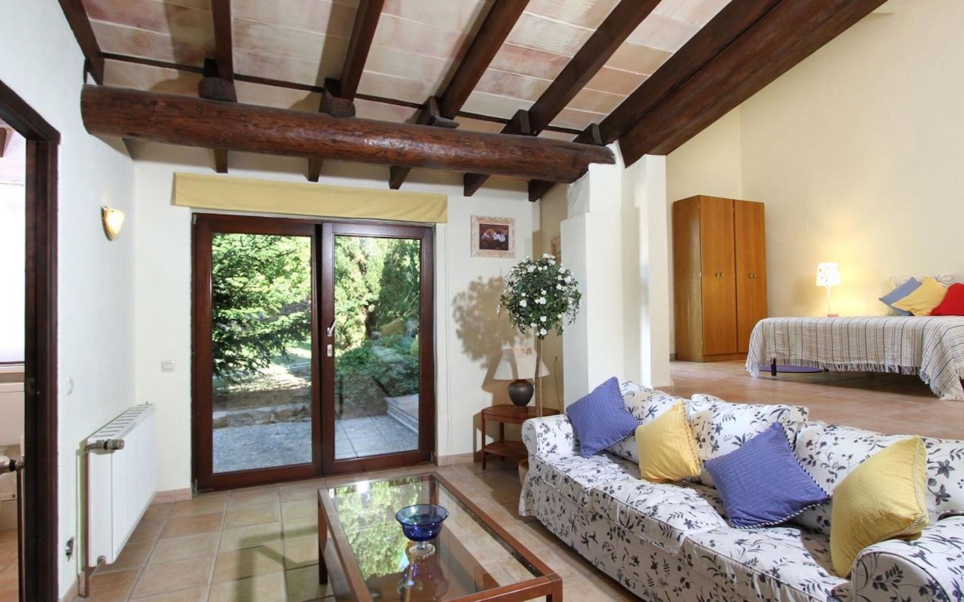 Following the orography of the hill on which can Llop is situated, the main house is a little higher than the annexe. As soon as you enter, you will find a spacious living-dining room with fabulous views of the countryside. The walls are decorated with paintings hand painted by the owner of the house, a professional painter (please note that the walls are now white, and lack the landscape motifs seen in some of the photos). The kitchen is certainly modern and is also fully equipped with electric oven, microwave, oven, dishwasher, fridge/freezer, and washing machine. There are also two bedrooms (one double and one twin) which share a splendid bathroom with bath and shower.