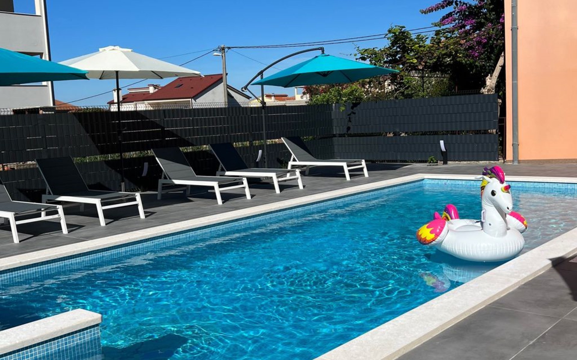 The garden is renovated this year with a beautiful terrace with BBQ and table tennis, tabel football, swimming pool, outside shower, trampoline, facility house with shower, toilet and kitchen. Every apartment has his own parking space.