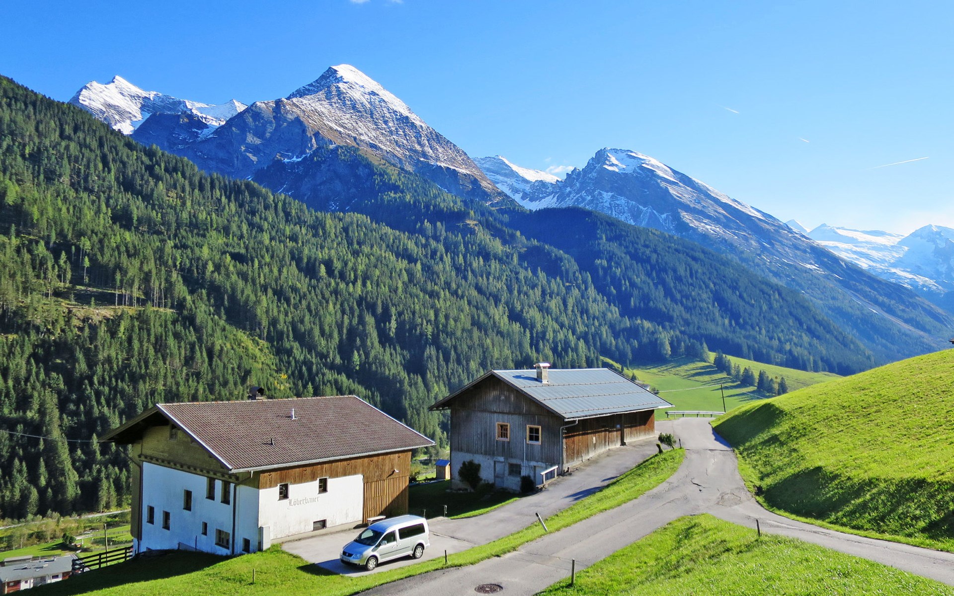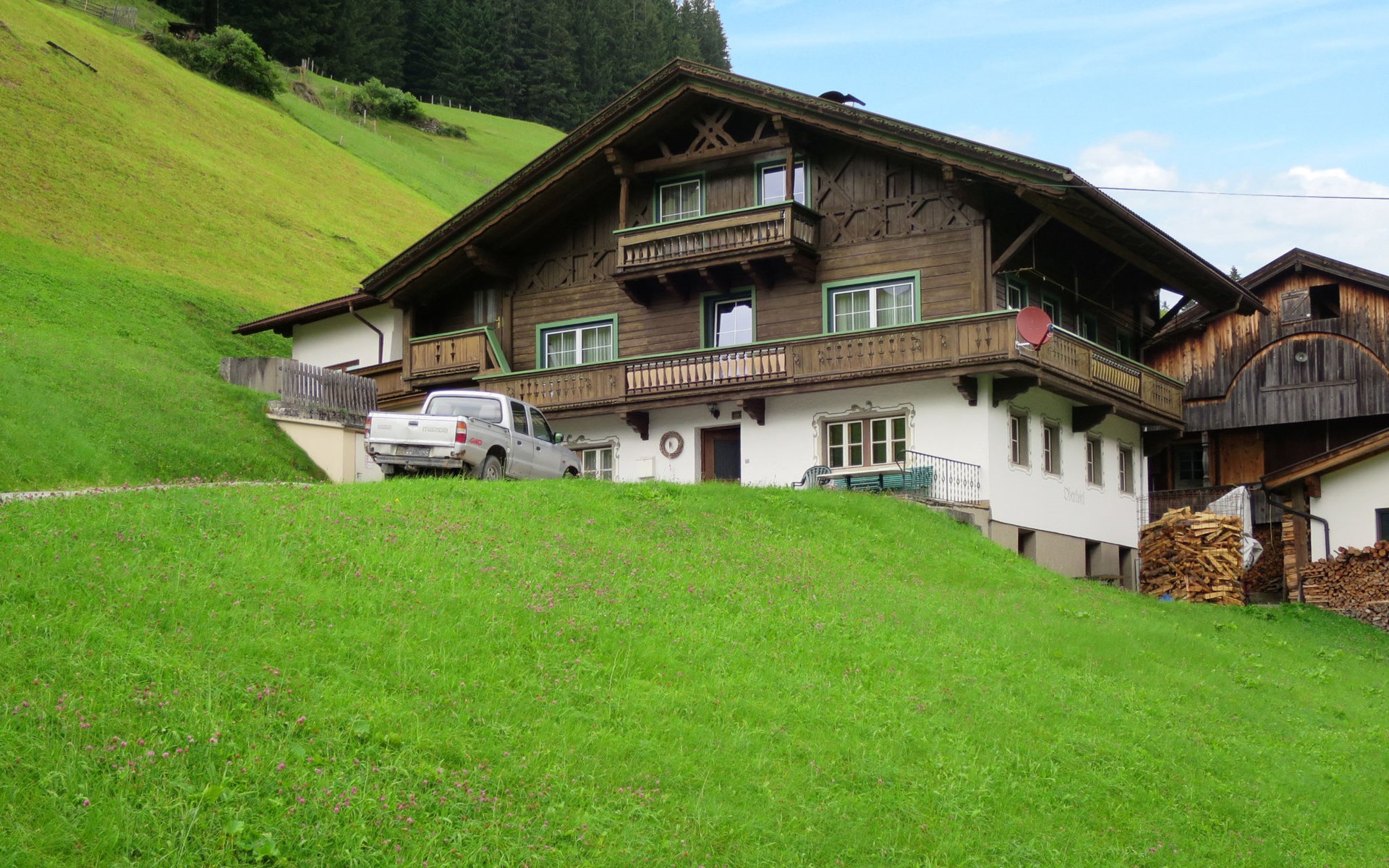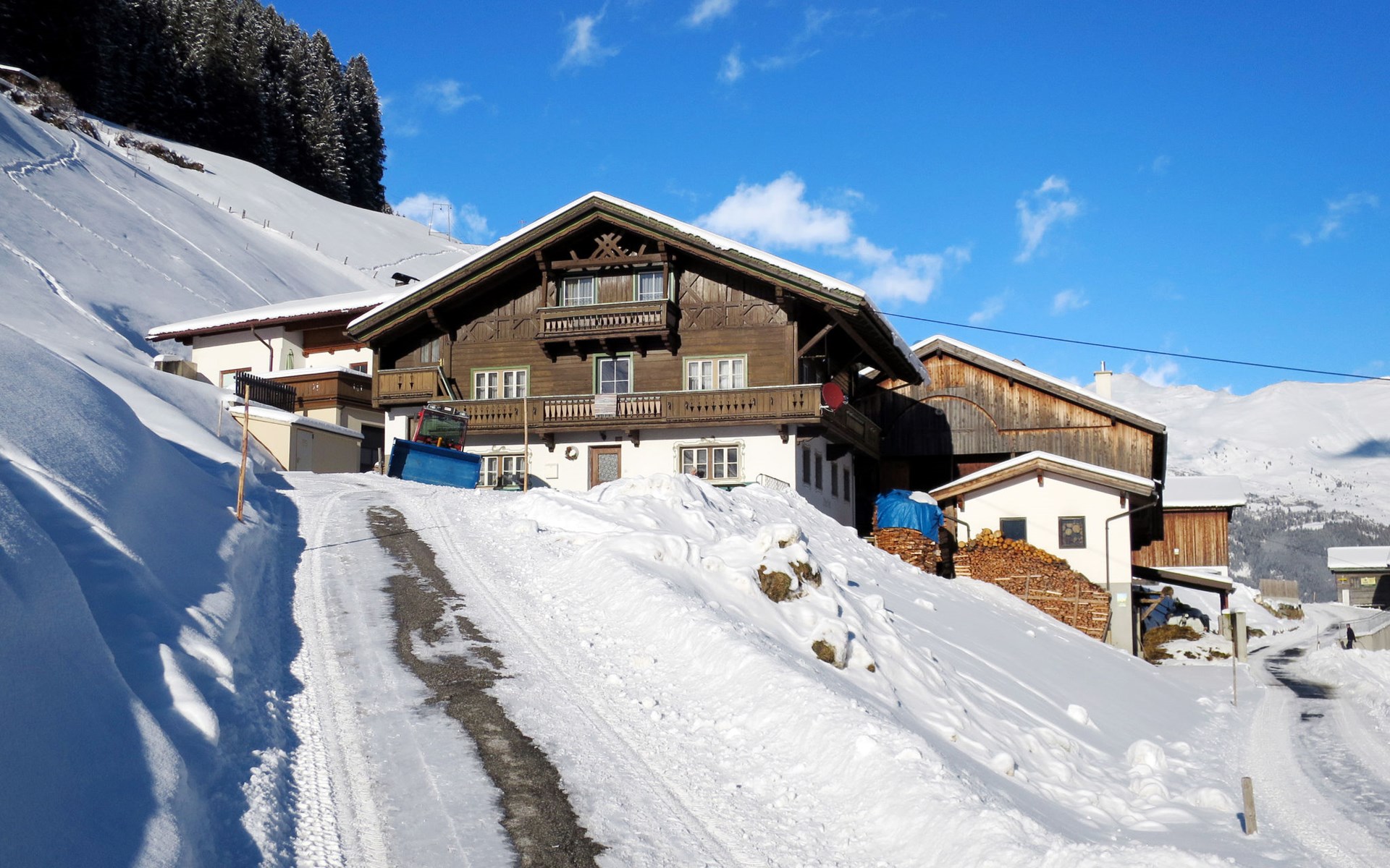 Farmhouse "Oberkofl", 1'400 m a.s.l., surrounded by meadows and fields. In the district of Oberjuns 3 km from the centre of Tux, 2.6 km from the centre of Lanersbach, 16 km from the centre of Mayrhofen, on a slope, in a cul-de-sac. For shared use: terrace, garden furniture. In the house: storage room for skis, ski boot dryer. Bread roll service. Steep, narrow motor access (mountain road). In Winter: please take snow chains. Parking (for 4 cars) on the premises. Supermarket 2.6 km, bus stop "Juns Klausboden" 1.1 km, railway station "Mayrhofen Bahnhof" 14.3 km, indoor swimming pool 16 km. Mountain railway 3.1 km, gondola lift 6.2 km, ski bus stop 1.2 km, cross country ski track 1.3 km. Well-known ski regions can easily be reached: Hintertuxer Gletscher 6.2 km, Eggalmbahn 3.1 km. Please note: the owner lives in the same residence.