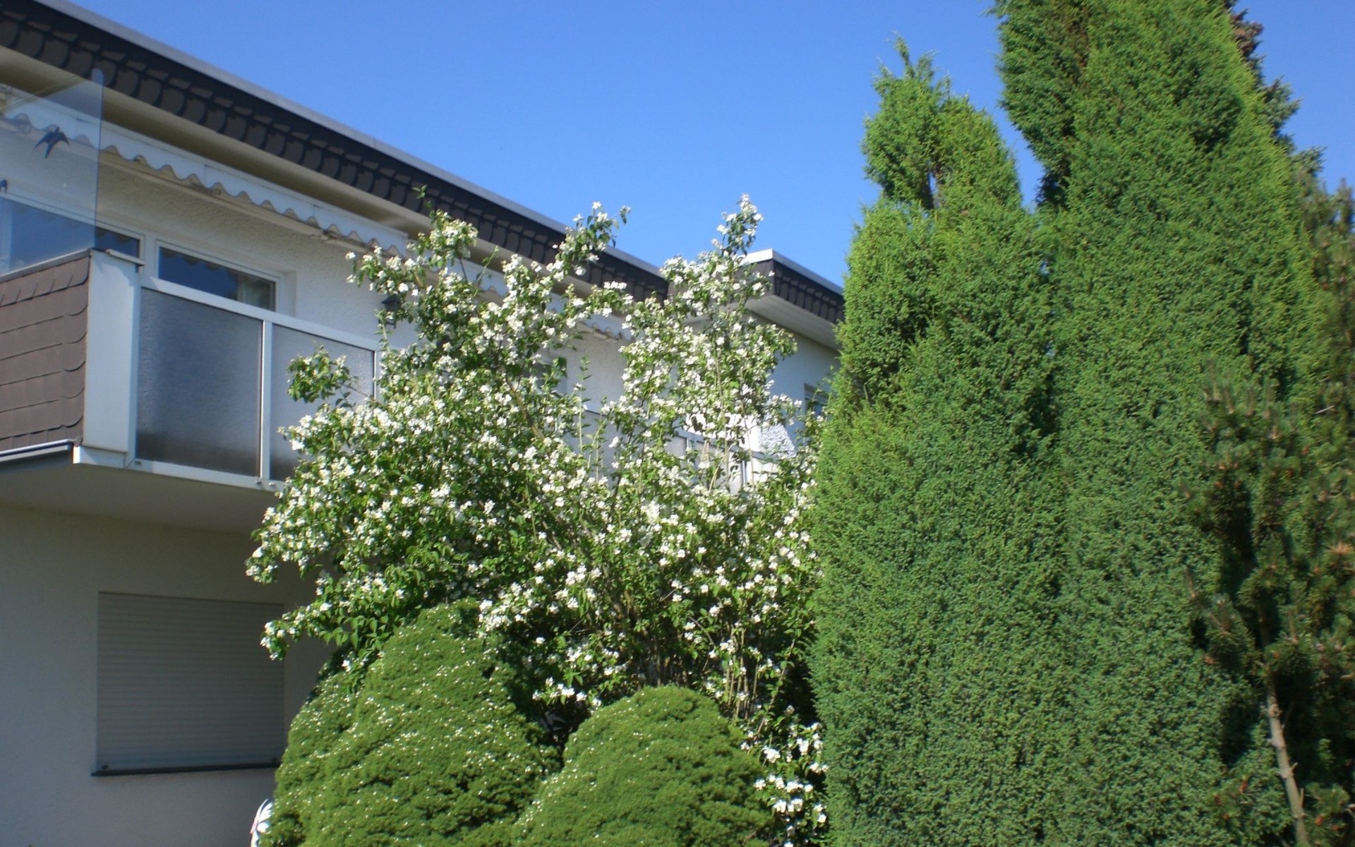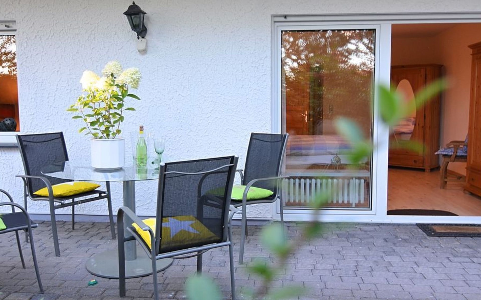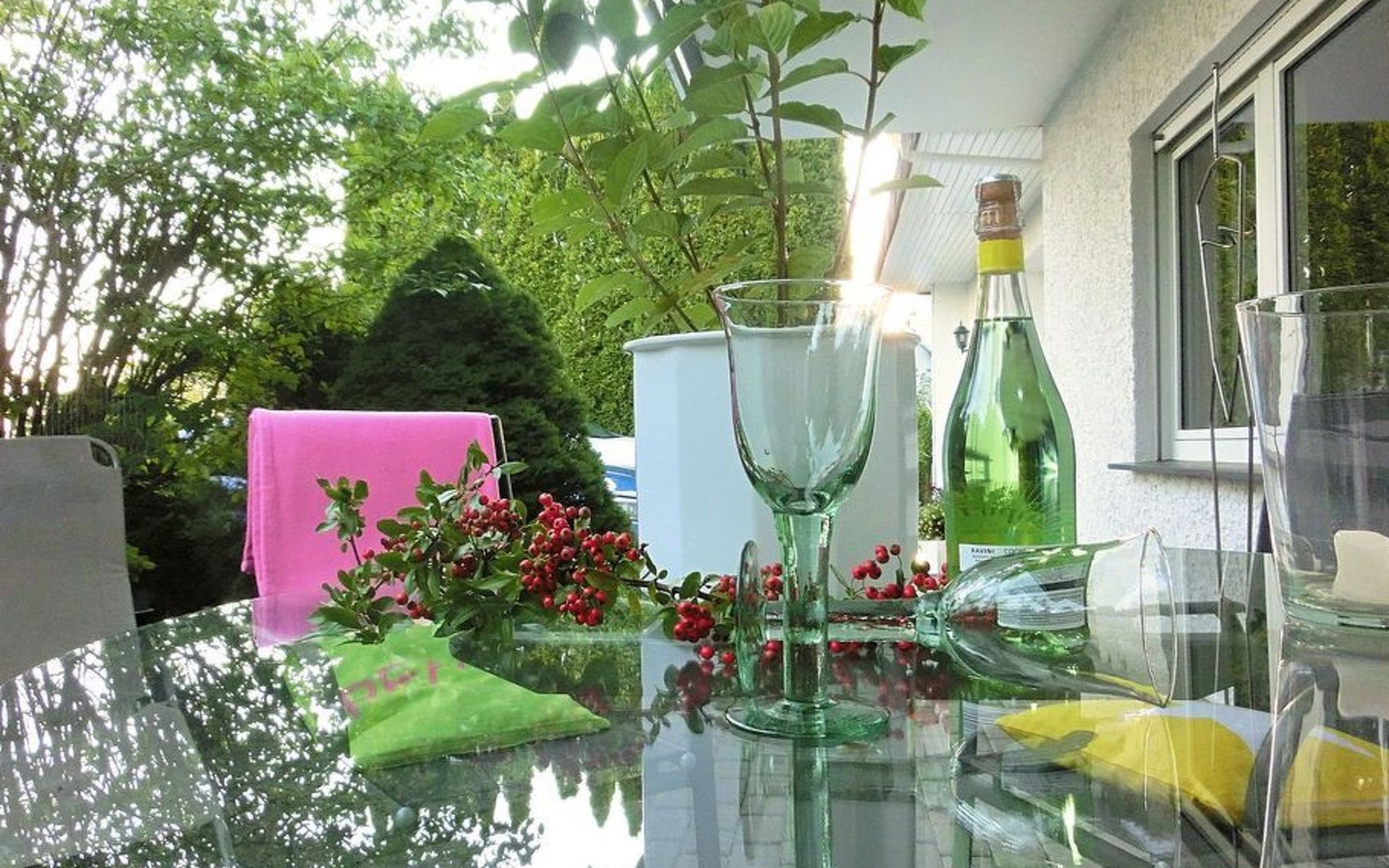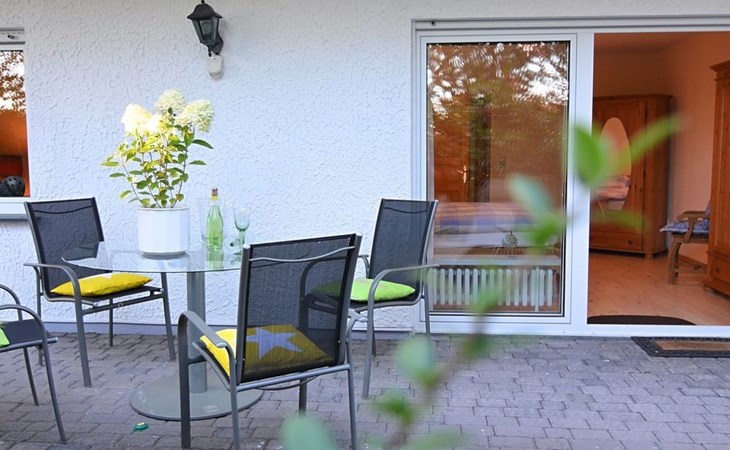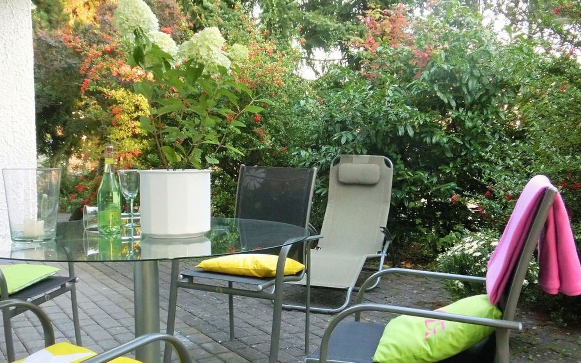small garden with terrace, the terrace is surrounded by bushes, therefore the south-facing terrace - with terrace furniture - is hardly visible