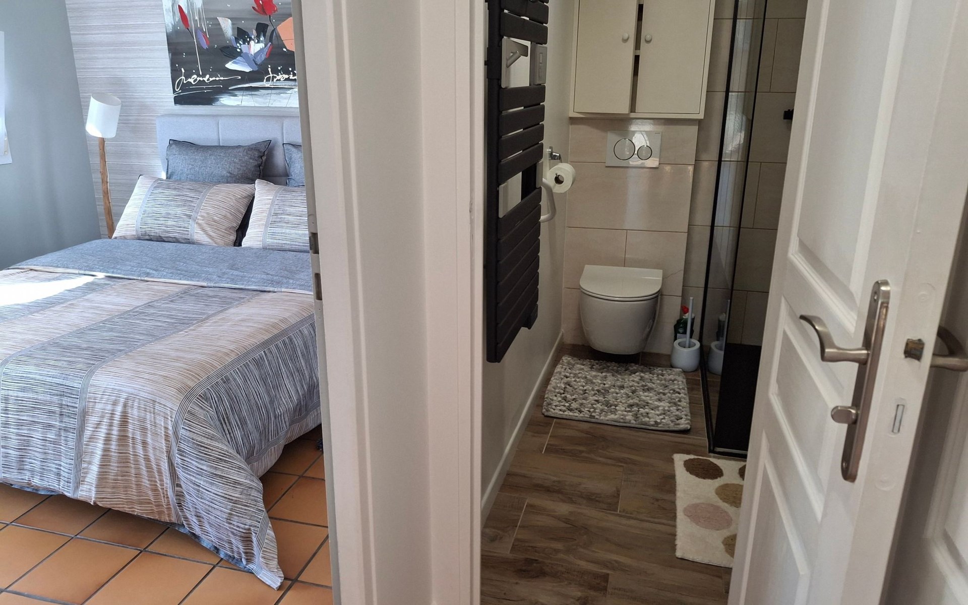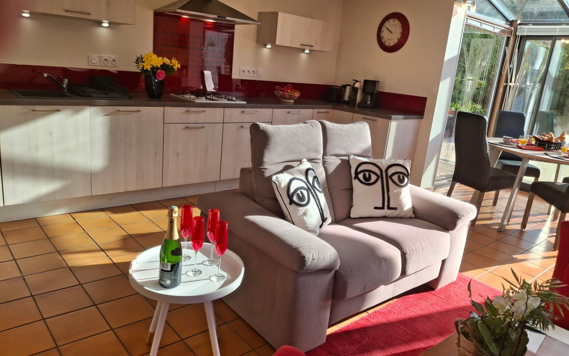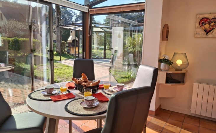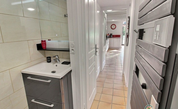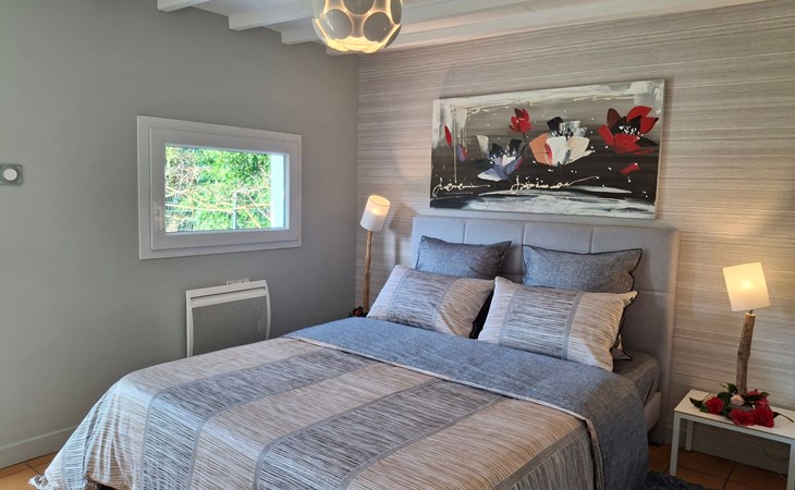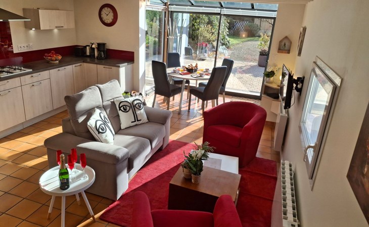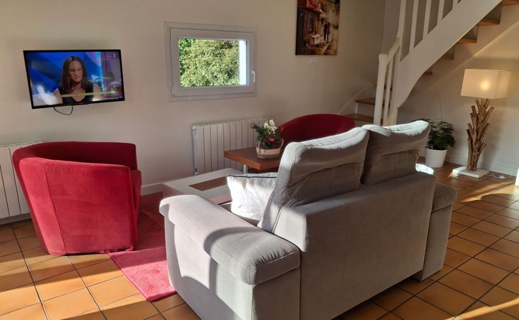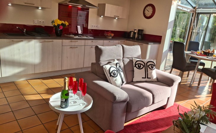 The interior of the gîte is an invitation to rest and tranquillity, combining modern comforts with tasteful decorative touches to create a welcoming atmosphere. There is a fully equipped kitchen with mini-oven, cooker and dishwasher, as well as a lounge area with a comfortable sofa, armchairs and a selected bookcase. New premium bedding ensures a restful night's sleep, complemented by an 80cm flat-screen TV with USB drive and free WIFI for all your multimedia and connectivity needs.