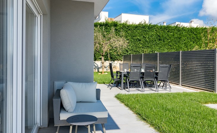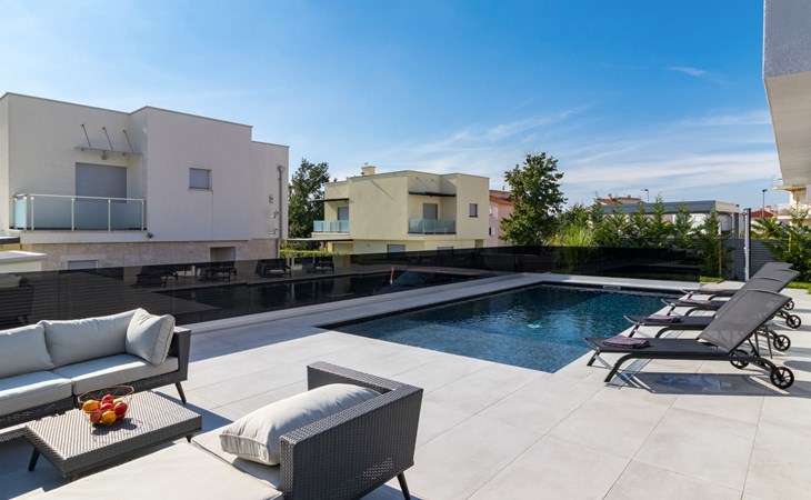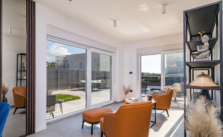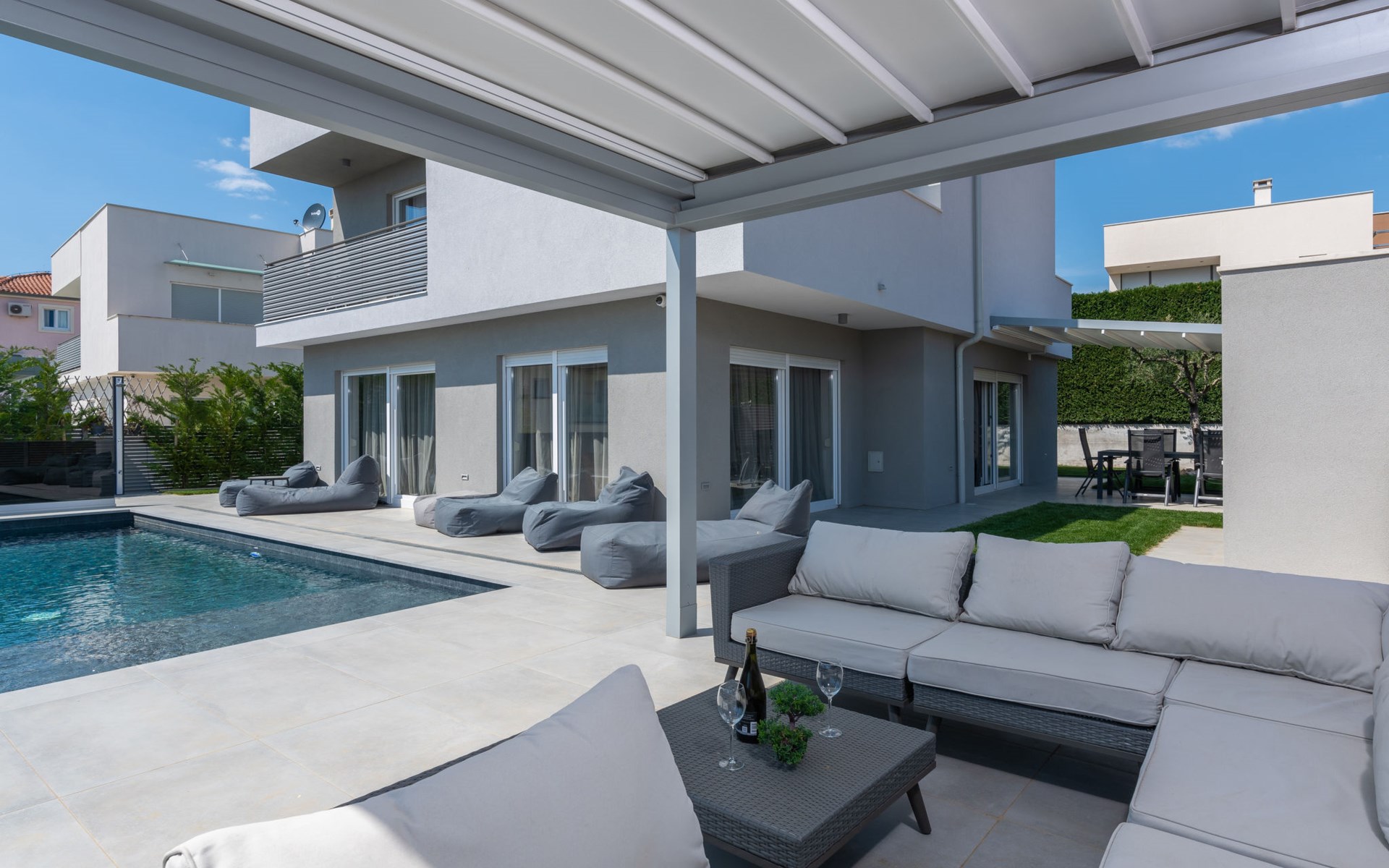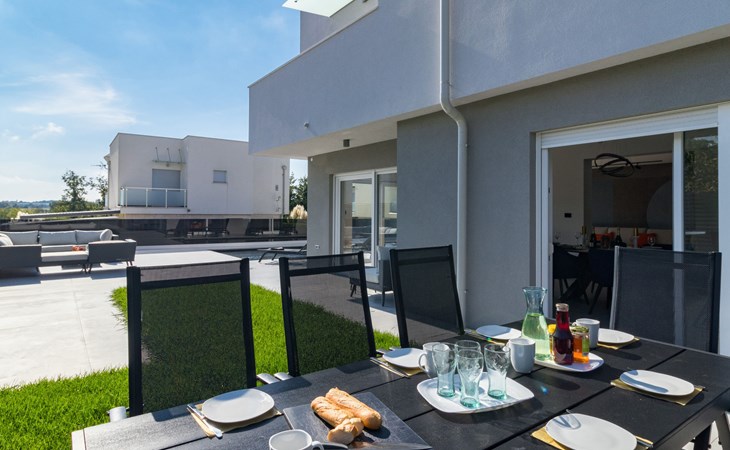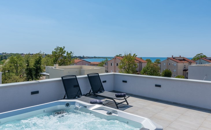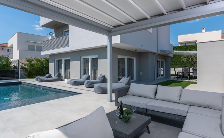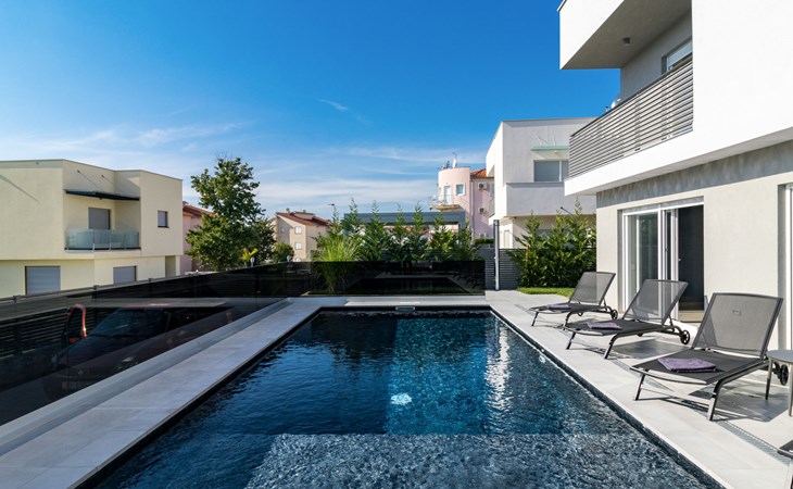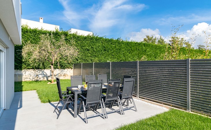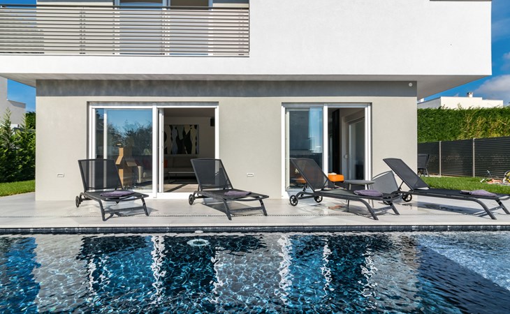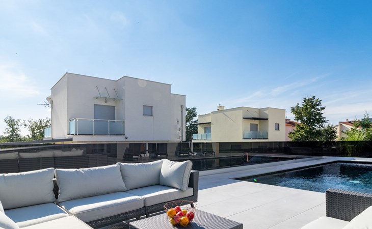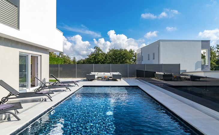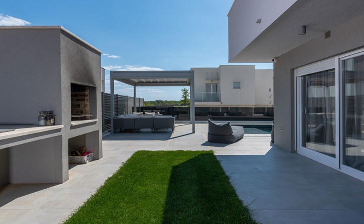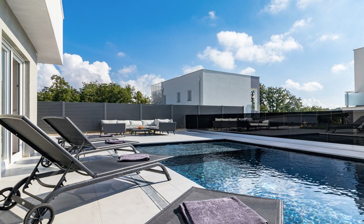 Modern, beautiful villa "Athos", 2 storeys, built in 2020. In the hamlet Karigador 4 km from the centre of Novigrad, in a quiet, sunny position, from the sea, 200 m from the beach. Private: property 550 m2 (fenced), lawn 300 m2, swimming pool angular, heated (8 x 4 m, depth 150 cm, seasonal availability: 01.Jan. - 31.Dec.) with internal staircase. Outdoor shower, arbour (16 m2), pergola (16 m2), garden furniture, barbecue. In the house: internet access, hot tub, roof terrace, burglar alarm system, washing machine. Airport transfer (extra). Parking (for 2 cars) at the house on the premises. Shop 100 m, supermarket 4 km, restaurant, café 100 m, bus stop 400 m, sandy beach, rocky beach 200 m. Children's playground 100 m. Please note: suitable for families. The owner does not accept any youth groups. Swimming pool with hydromassage. It is necessary to announce 7 days in advance if the pool heating is required. Hot tub for 5 persons, garden furniture are situated on the roof terrace (80 m2, exterior staircase).