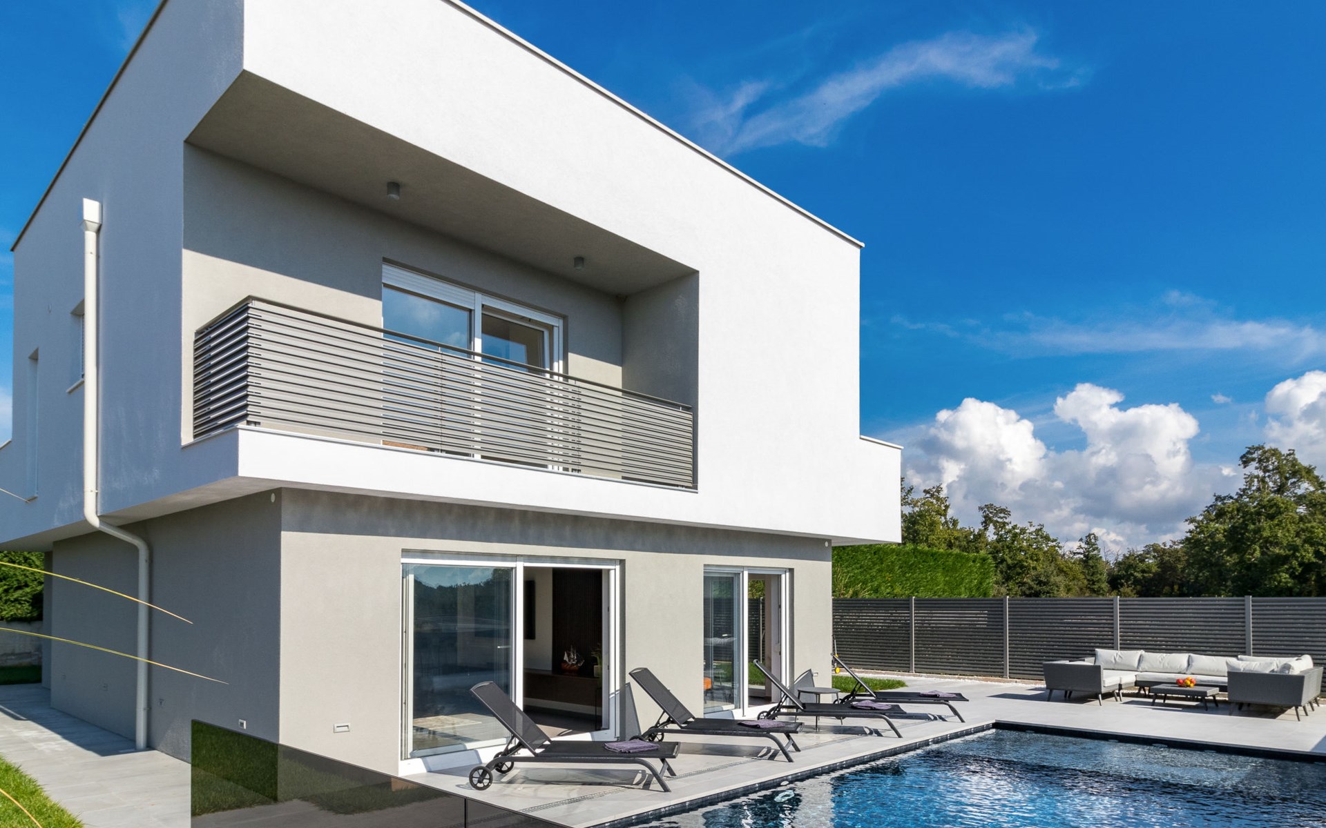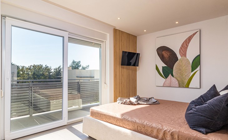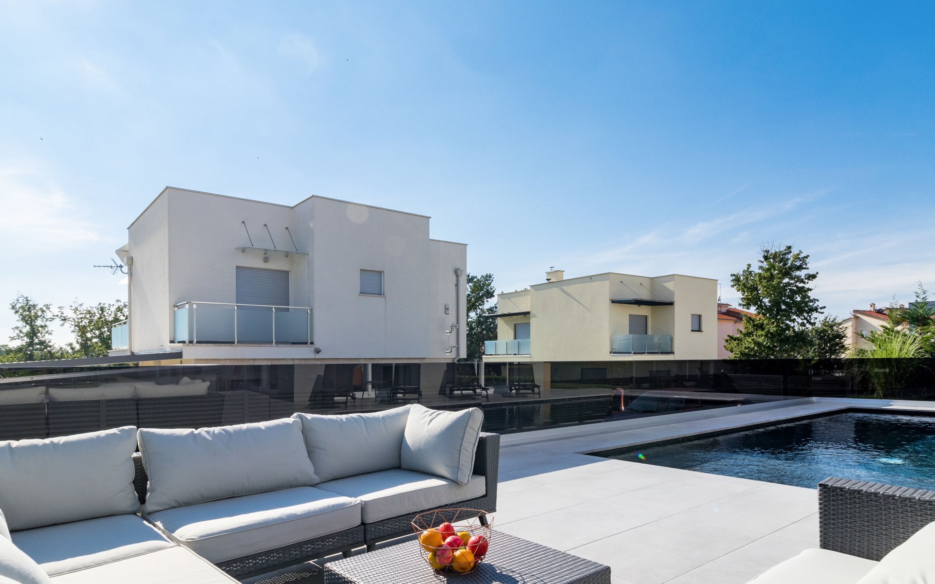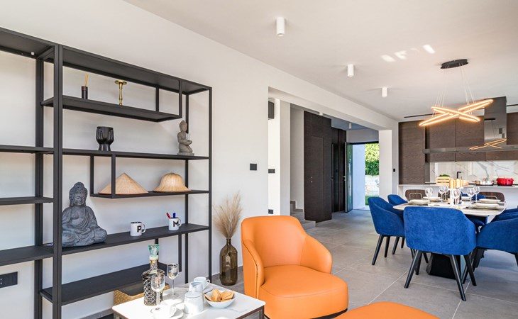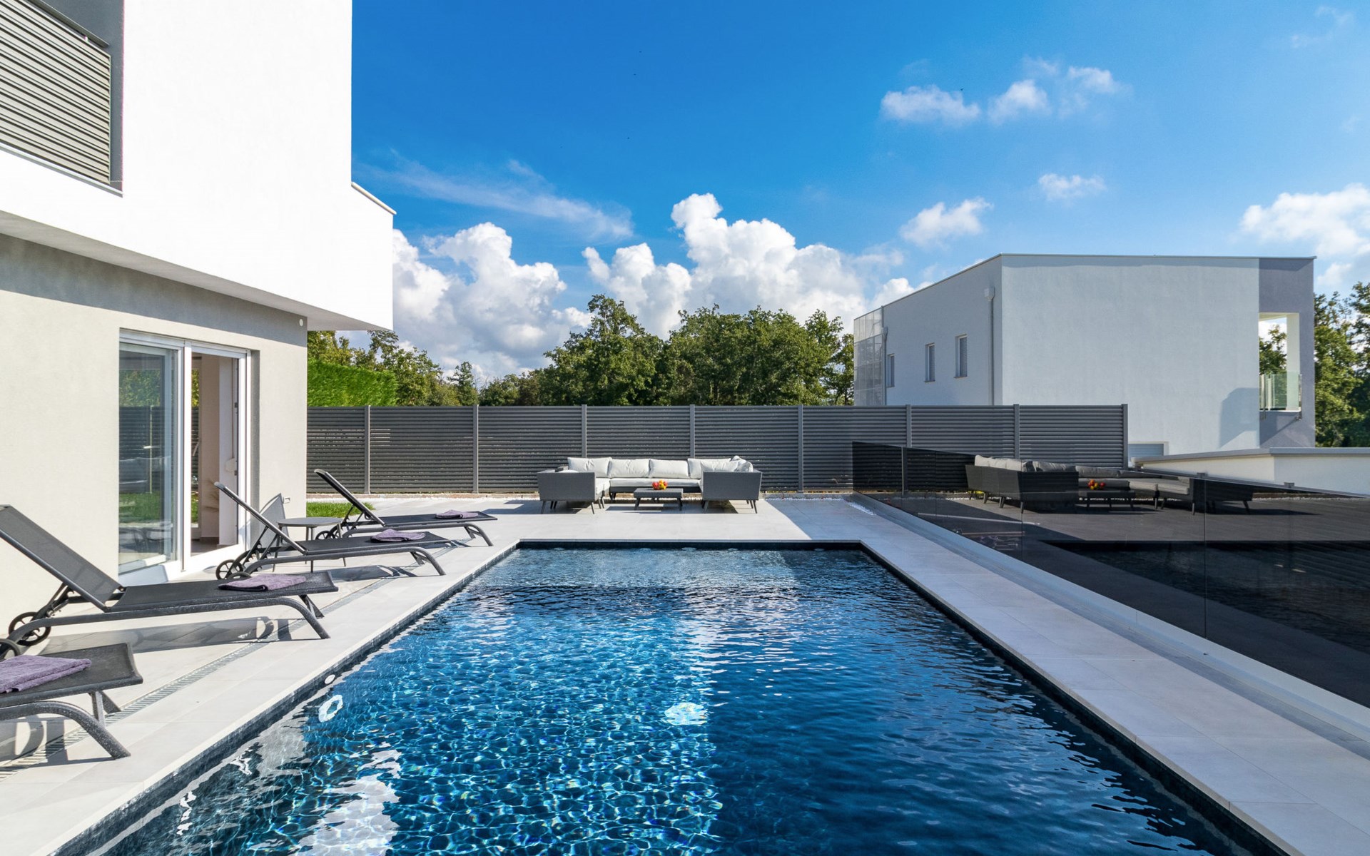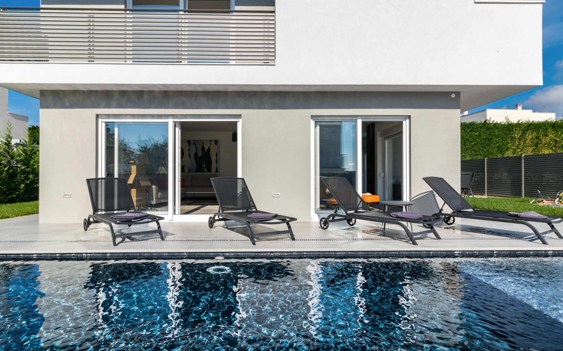 Modern, beautiful villa "Athos", 2 storeys, built in 2020. In the hamlet Karigador 4 km from the centre of Novigrad, in a quiet, sunny position, from the sea, 200 m from the beach. Private: property 550 m2 (fenced), lawn 300 m2, swimming pool angular, heated (8 x 4 m, depth 150 cm, seasonal availability: 01.Jan. - 31.Dec.) with internal staircase. Outdoor shower, arbour (16 m2), pergola (16 m2), garden furniture, barbecue. In the house: internet access, hot tub, roof terrace, burglar alarm system, washing machine. Airport transfer (extra). Parking (for 2 cars) at the house on the premises. Shop 100 m, supermarket 4 km, restaurant, café 100 m, bus stop 400 m, sandy beach, rocky beach 200 m. Children's playground 100 m. Please note: suitable for families. The owner does not accept any youth groups. Swimming pool with hydromassage. It is necessary to announce 7 days in advance if the pool heating is required. Hot tub for 5 persons, garden furniture are situated on the roof terrace (80 m2, exterior staircase).
