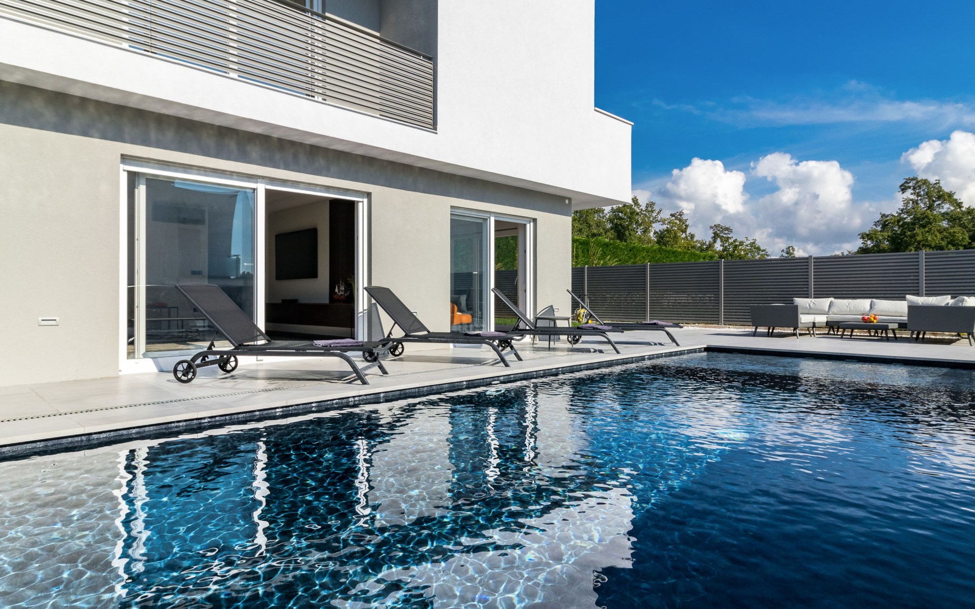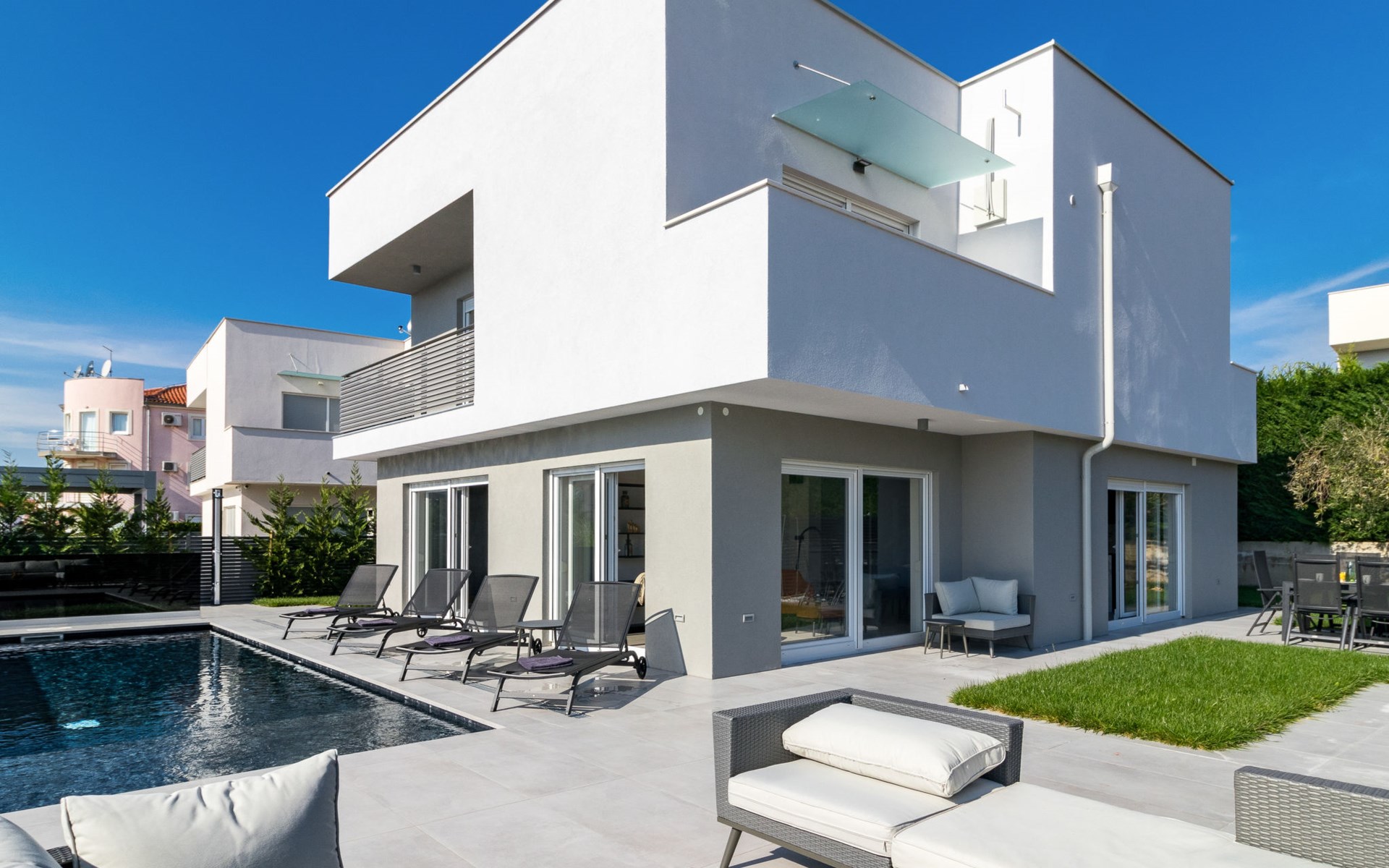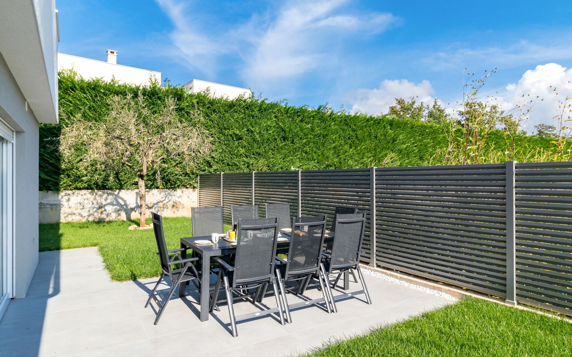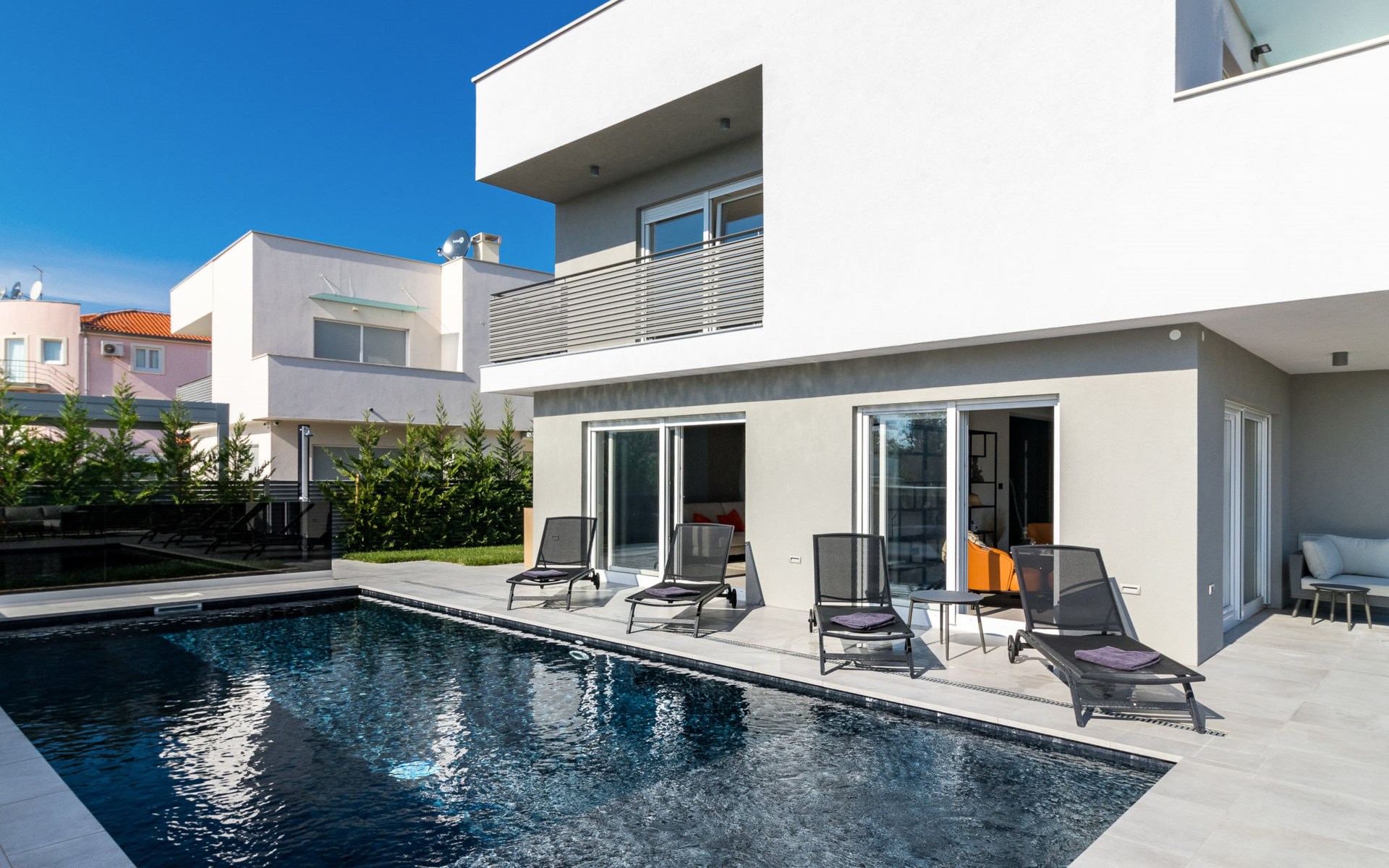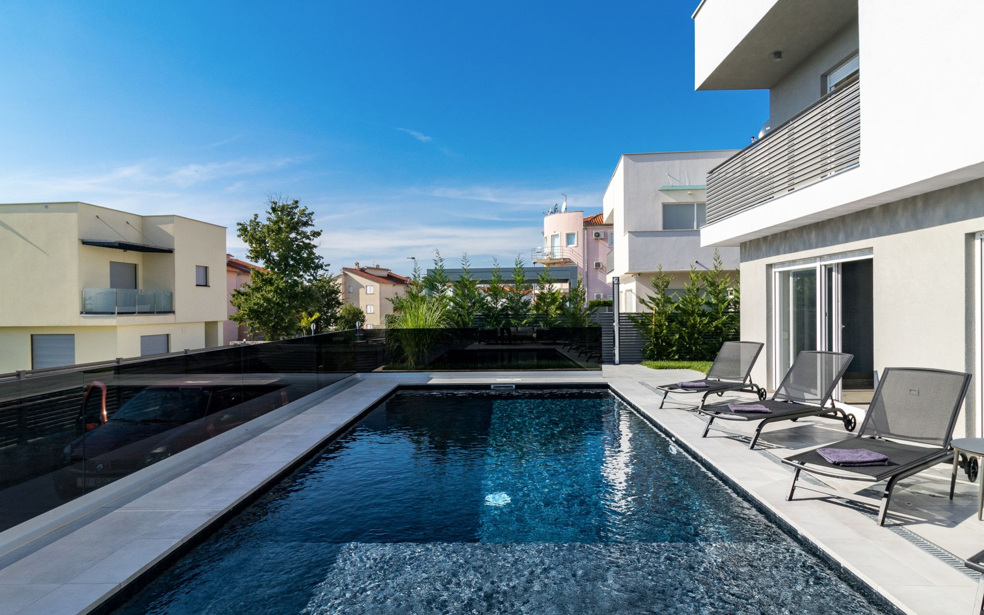 Modern, beautiful villa "Athos", 2 storeys, built in 2020. In the hamlet Karigador 4 km from the centre of Novigrad, in a quiet, sunny position, from the sea, 200 m from the beach. Private: property 550 m2 (fenced), lawn 300 m2, swimming pool angular, heated (8 x 4 m, depth 150 cm, seasonal availability: 01.Jan. - 31.Dec.) with internal staircase. Outdoor shower, arbour (16 m2), pergola (16 m2), garden furniture, barbecue. In the house: internet access, hot tub, roof terrace, burglar alarm system, washing machine. Airport transfer (extra). Parking (for 2 cars) at the house on the premises. Shop 100 m, supermarket 4 km, restaurant, café 100 m, bus stop 400 m, sandy beach, rocky beach 200 m. Children's playground 100 m. Please note: suitable for families. The owner does not accept any youth groups. Swimming pool with hydromassage. It is necessary to announce 7 days in advance if the pool heating is required. Hot tub for 5 persons, garden furniture are situated on the roof terrace (80 m2, exterior staircase).