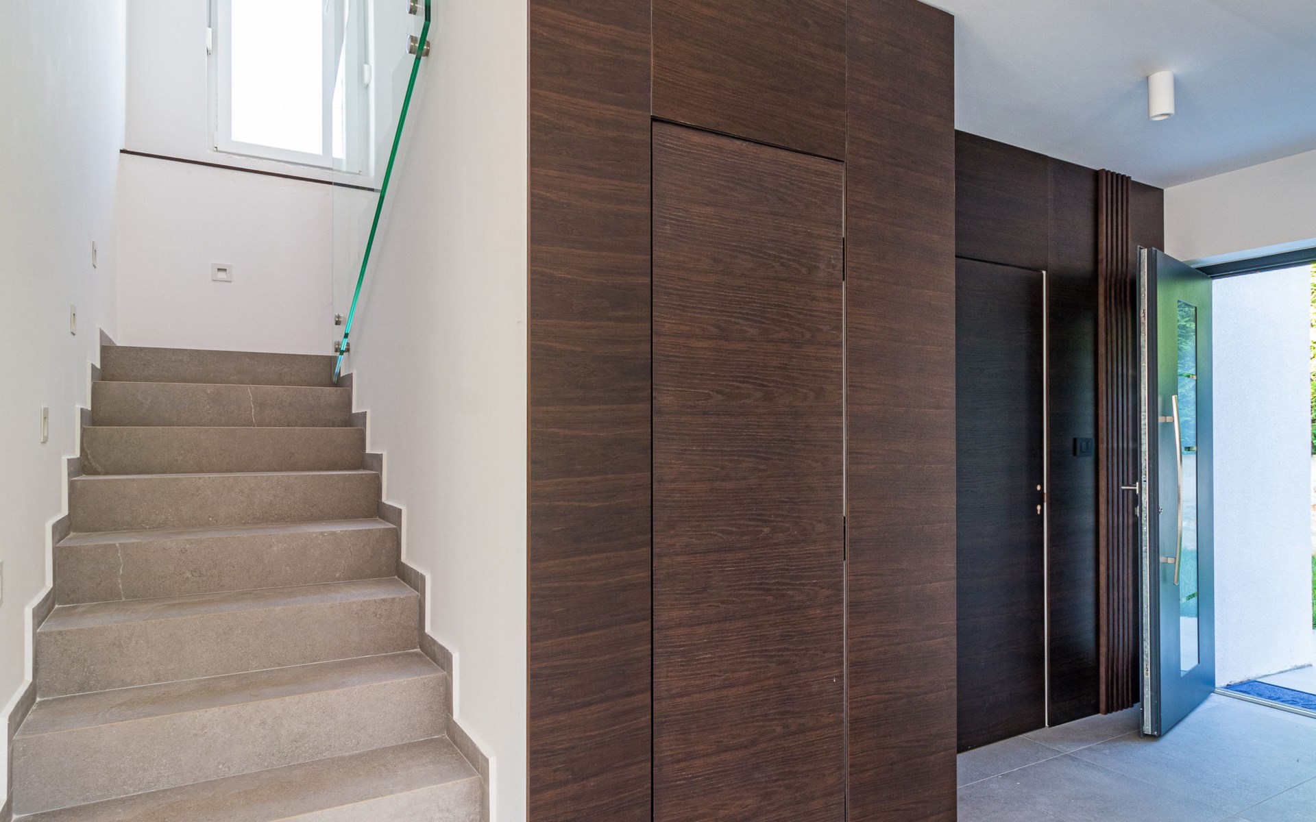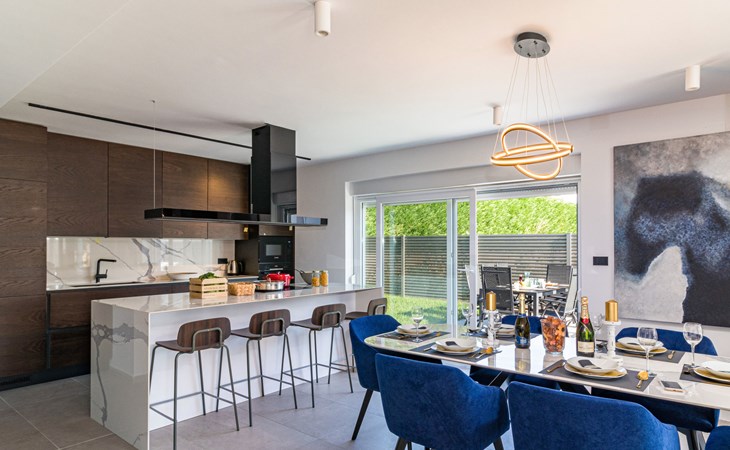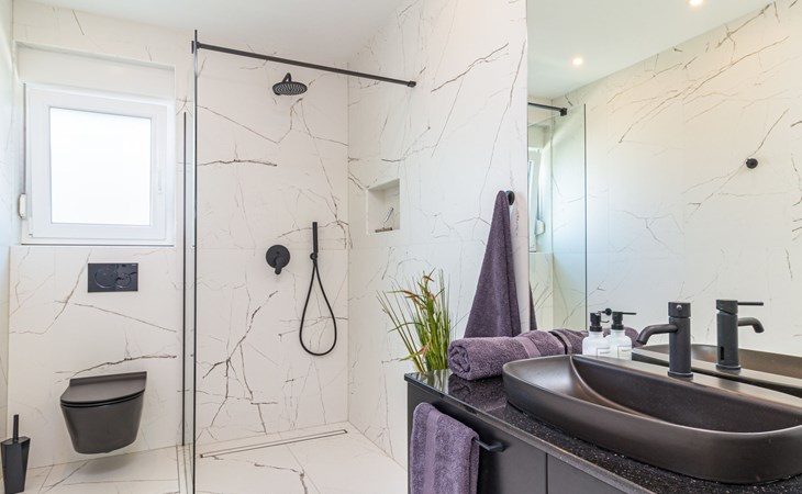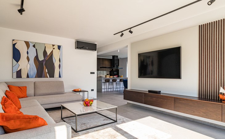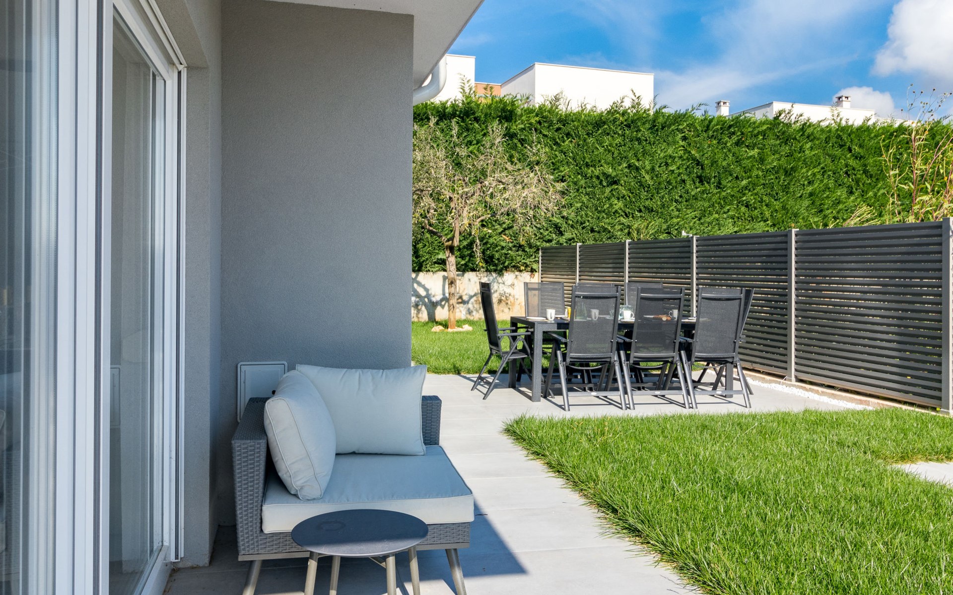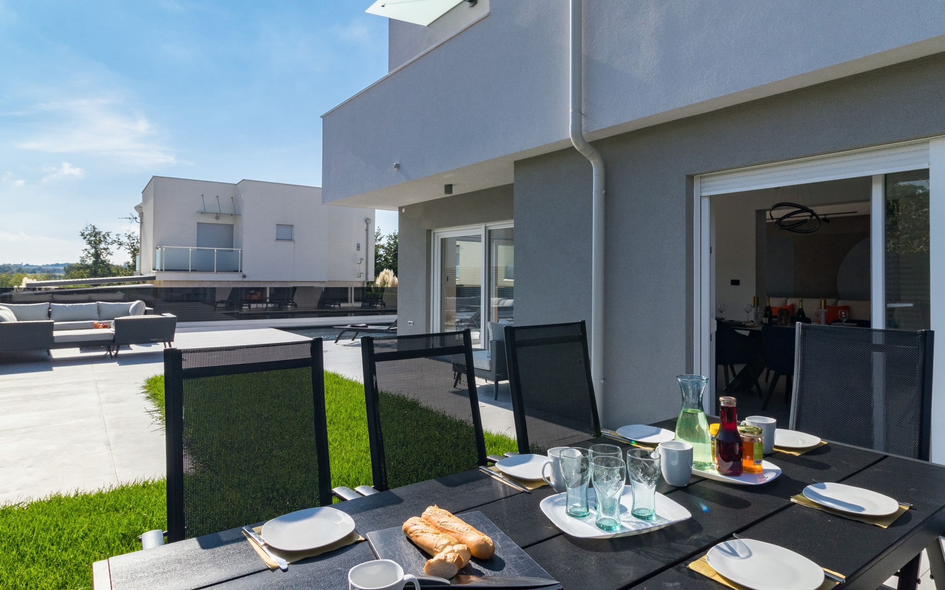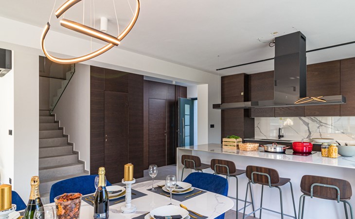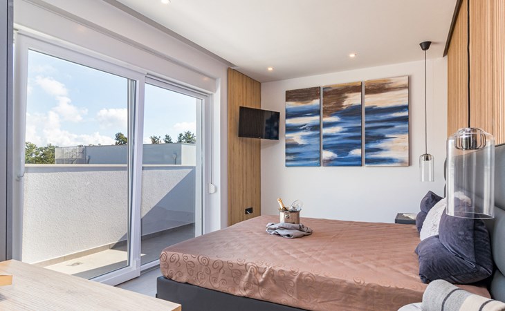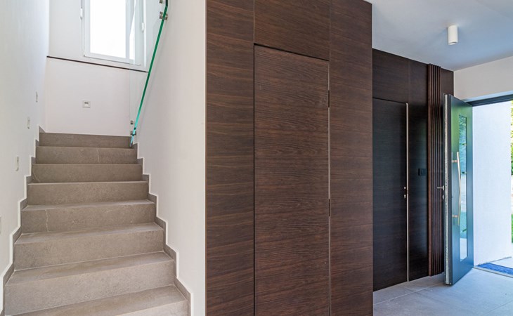 Modern, beautiful villa "Athos", 2 storeys, built in 2020. In the hamlet Karigador 4 km from the centre of Novigrad, in a quiet, sunny position, from the sea, 200 m from the beach. Private: property 550 m2 (fenced), lawn 300 m2, swimming pool angular, heated (8 x 4 m, depth 150 cm, seasonal availability: 01.Jan. - 31.Dec.) with internal staircase. Outdoor shower, arbour (16 m2), pergola (16 m2), garden furniture, barbecue. In the house: internet access, hot tub, roof terrace, burglar alarm system, washing machine. Airport transfer (extra). Parking (for 2 cars) at the house on the premises. Shop 100 m, supermarket 4 km, restaurant, café 100 m, bus stop 400 m, sandy beach, rocky beach 200 m. Children's playground 100 m. Please note: suitable for families. The owner does not accept any youth groups. Swimming pool with hydromassage. It is necessary to announce 7 days in advance if the pool heating is required. Hot tub for 5 persons, garden furniture are situated on the roof terrace (80 m2, exterior staircase).