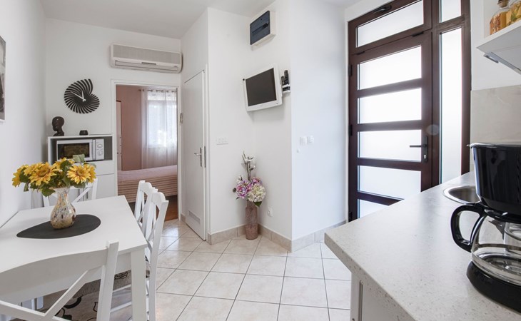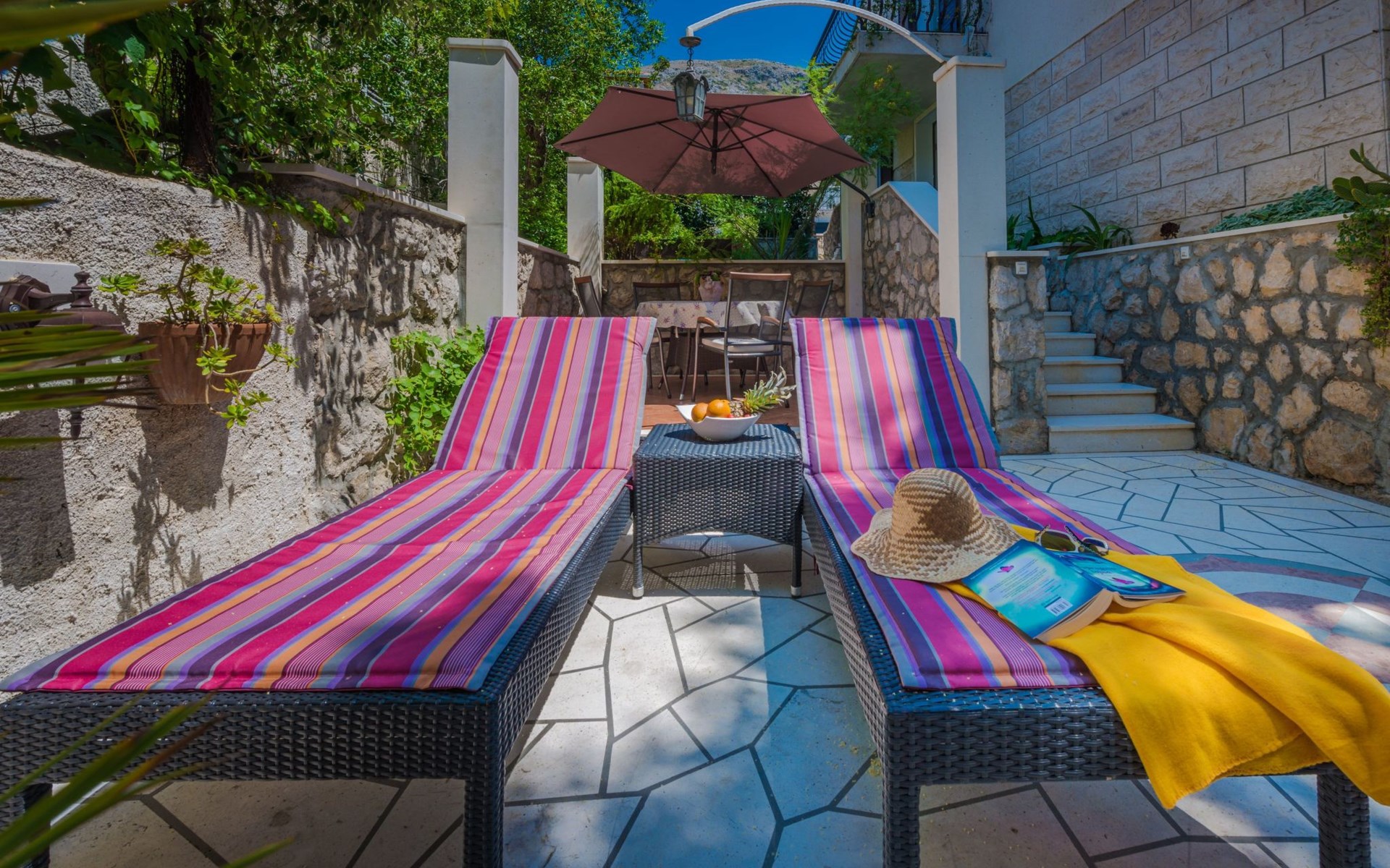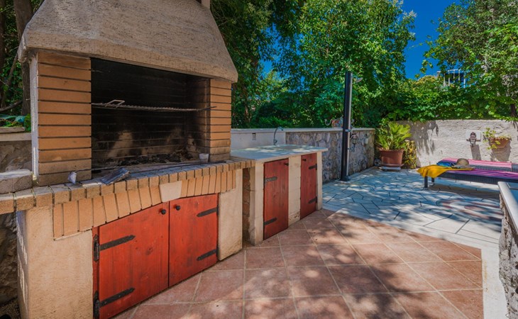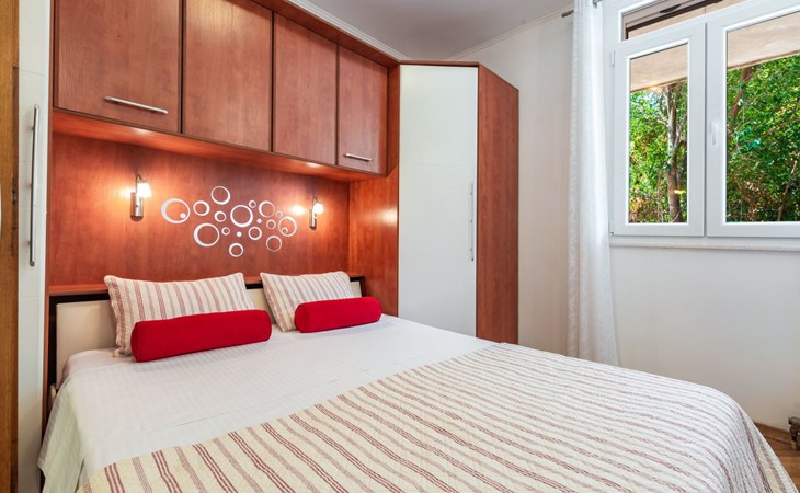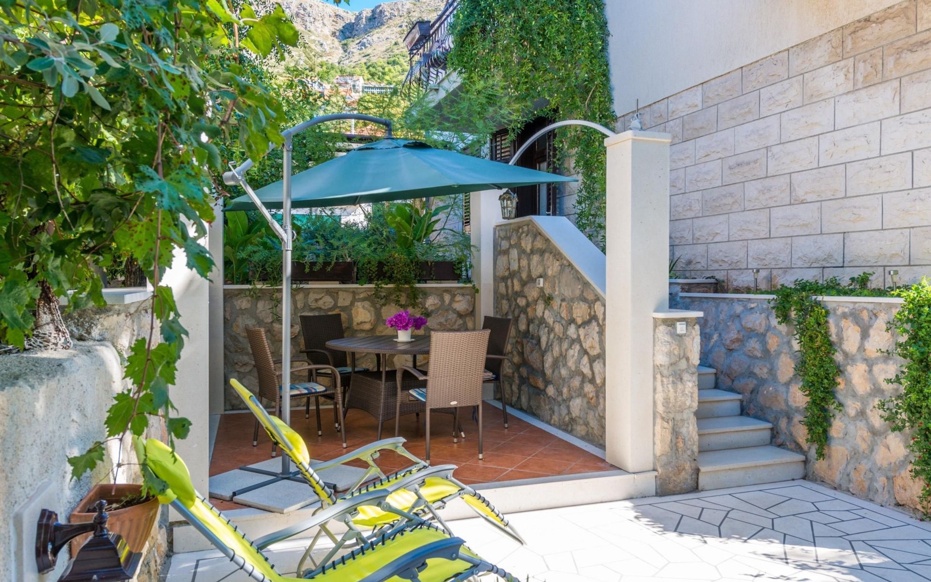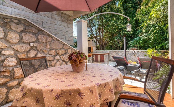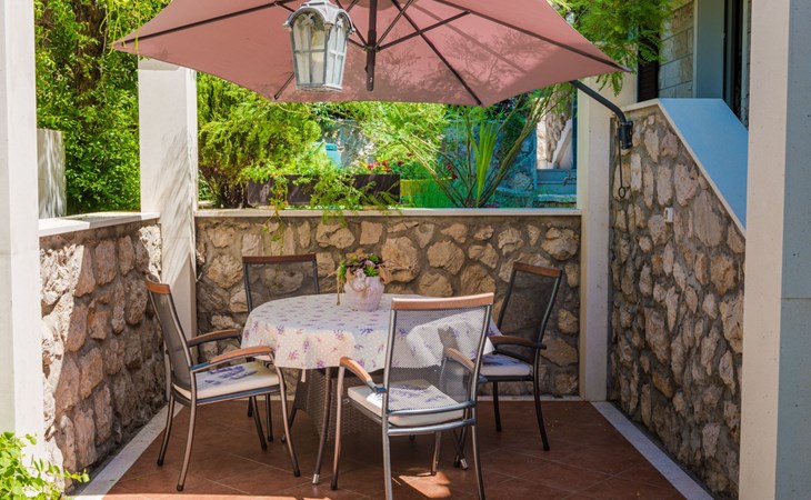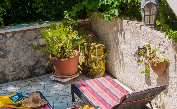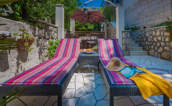 The living room opens directly onto your private terrace, which is furnished with a table, chairs, sun loungers and a parasol. It is ideal for relaxing in the shade of the trees. There is also a convenient outdoor shower.