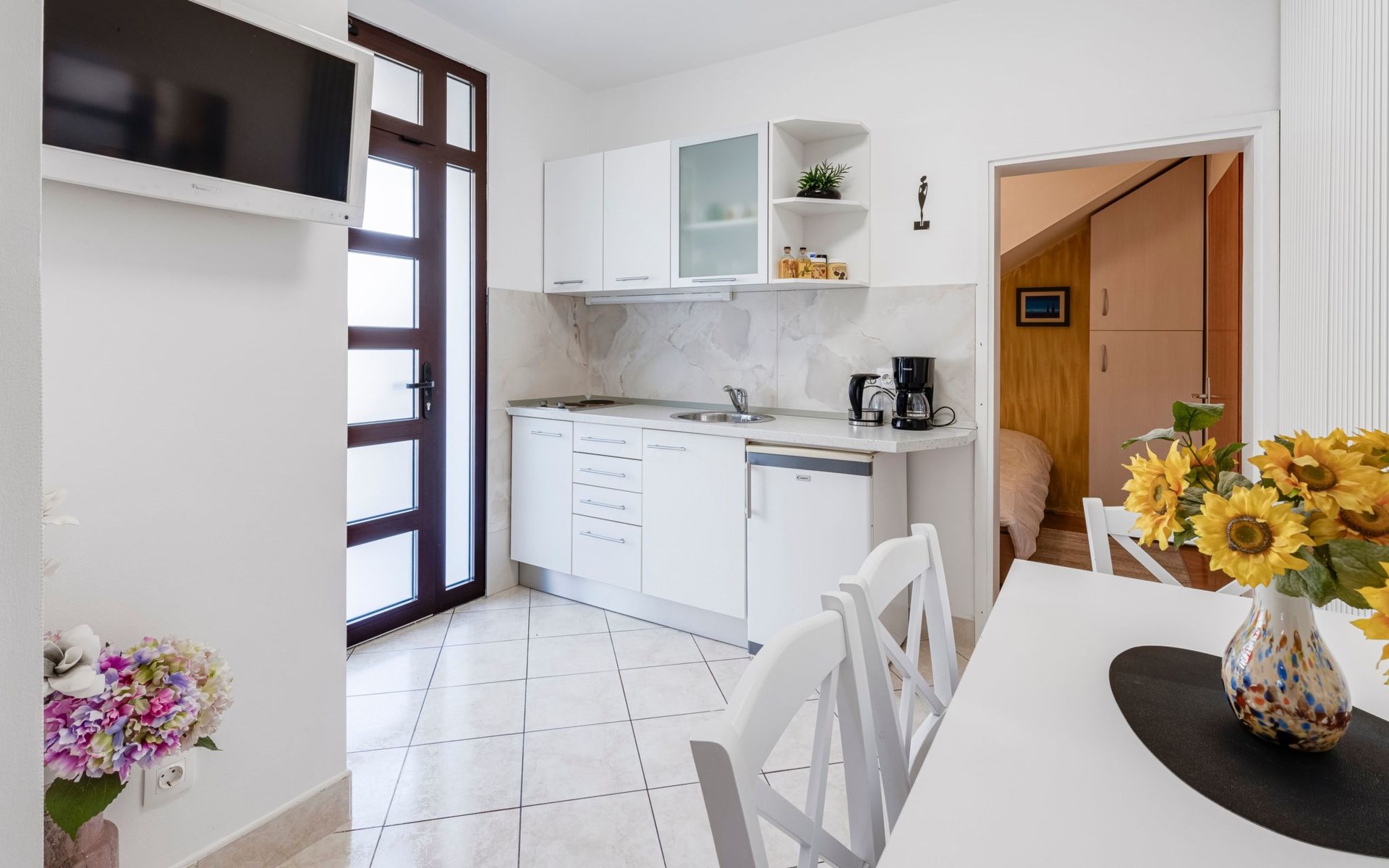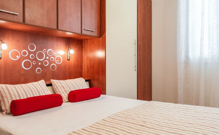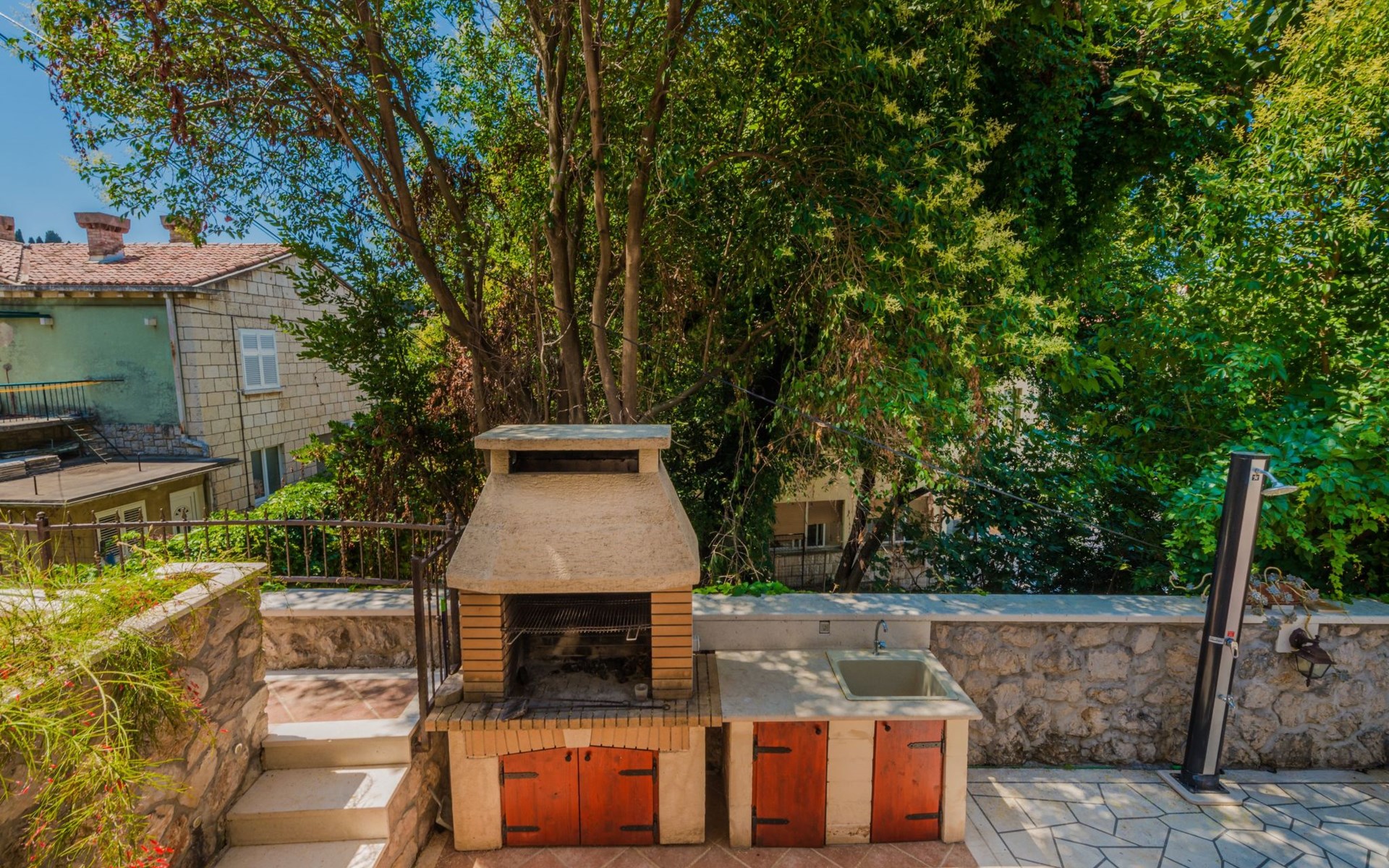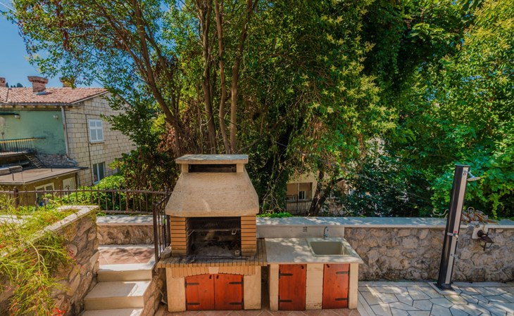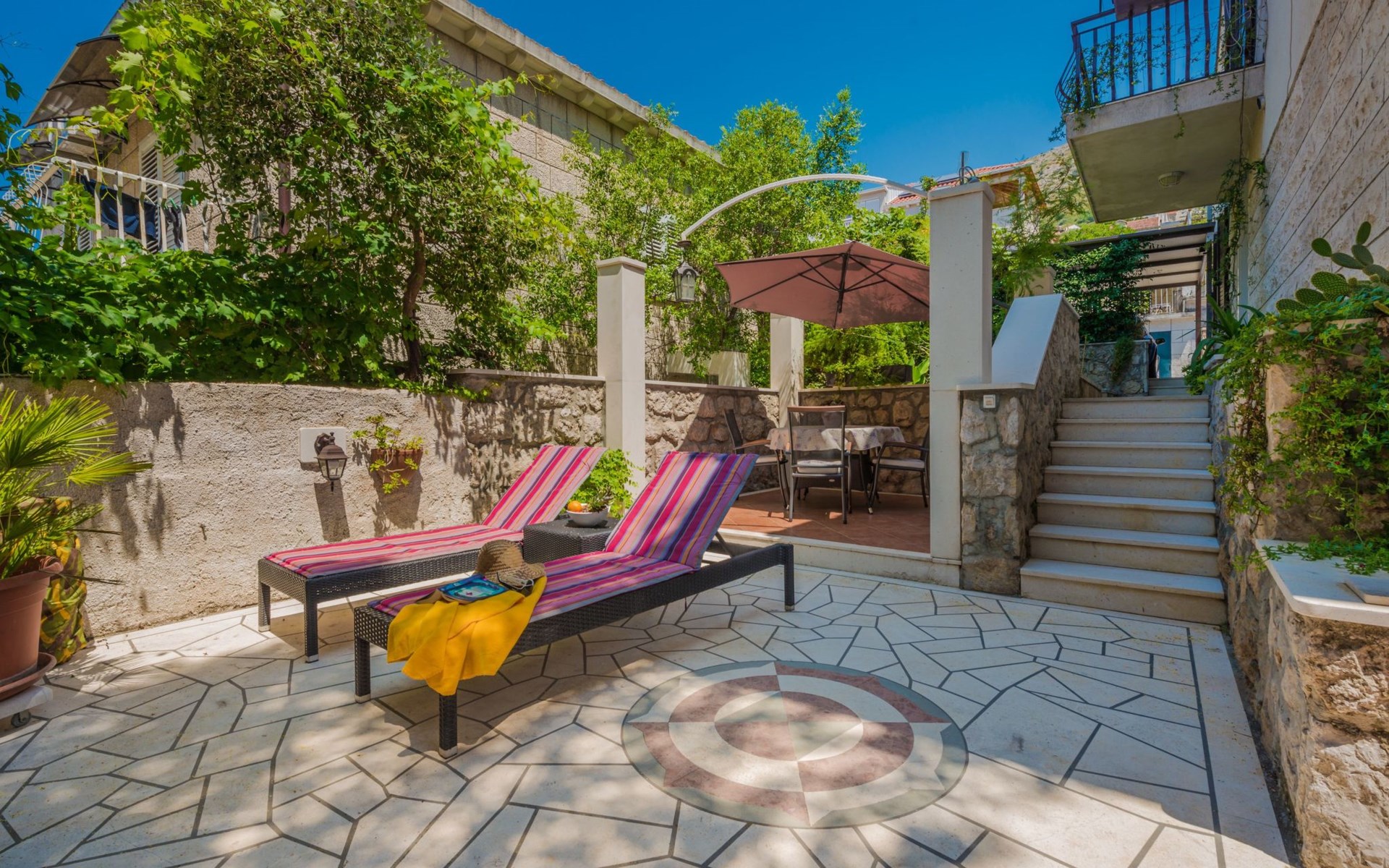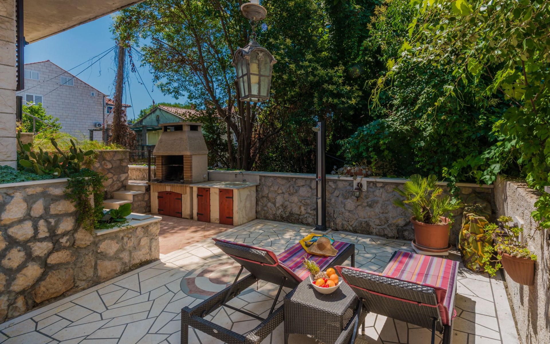 The living room opens directly onto your private terrace, which is furnished with a table, chairs, sun loungers and a parasol. It is ideal for relaxing in the shade of the trees. There is also a convenient outdoor shower.