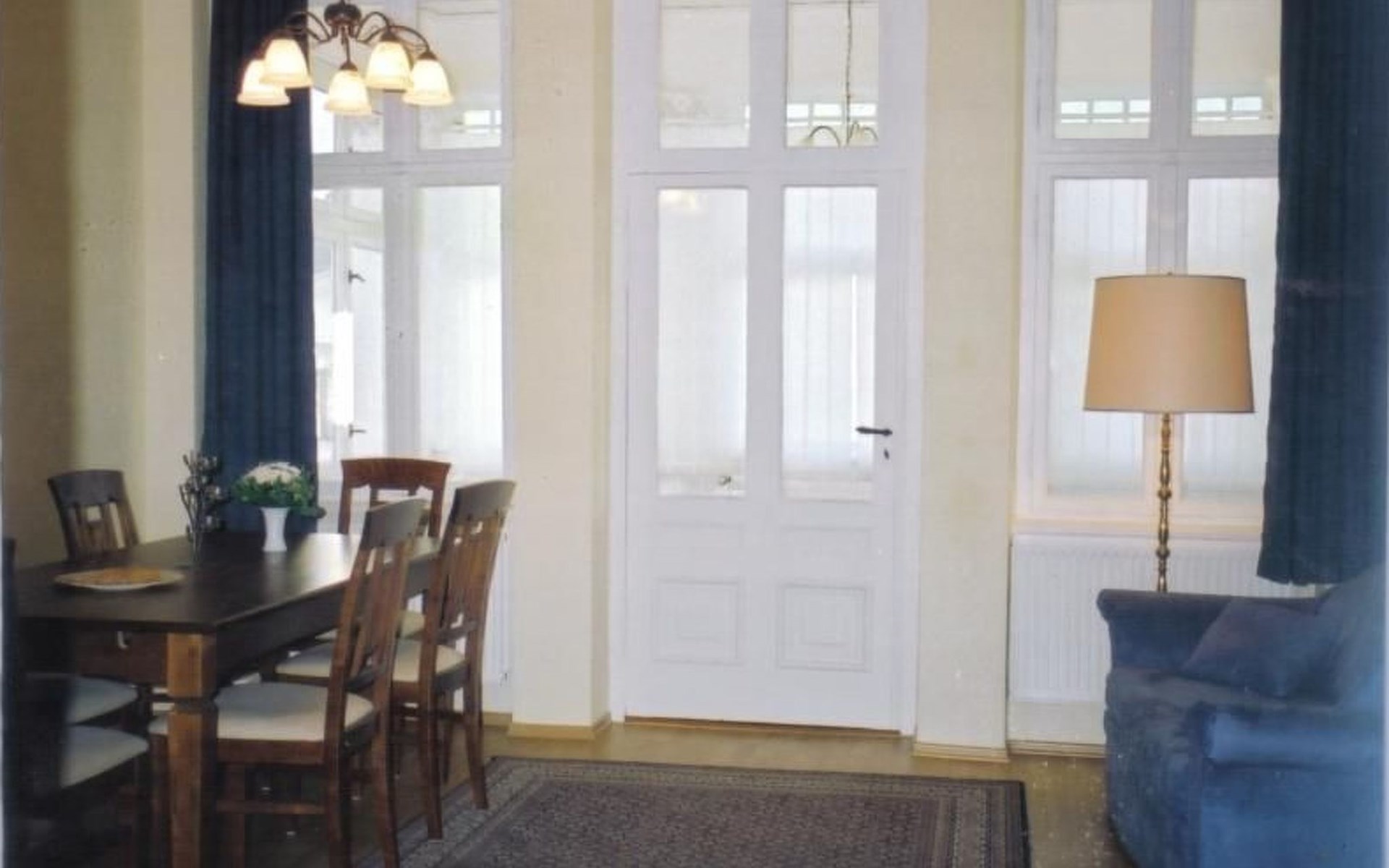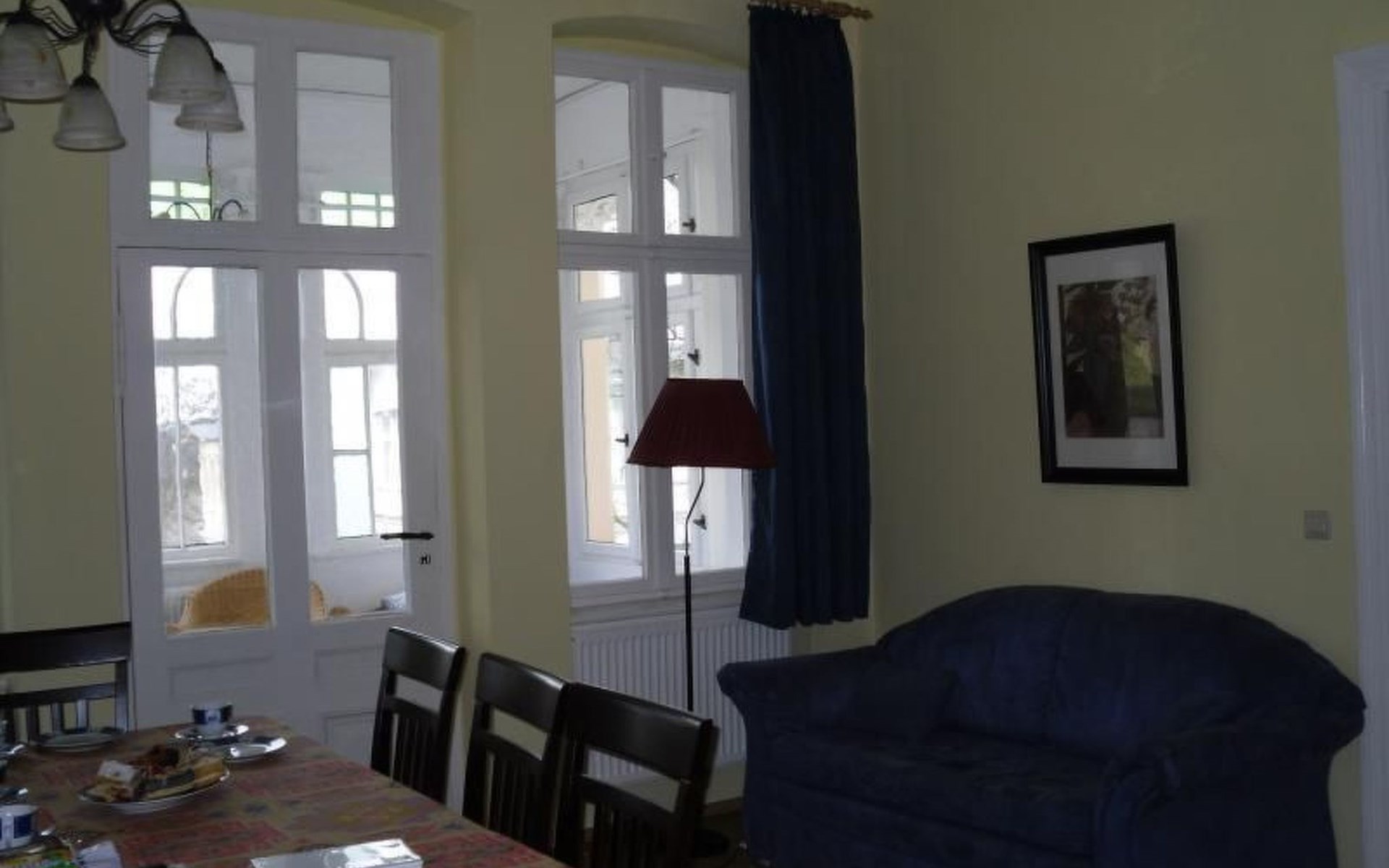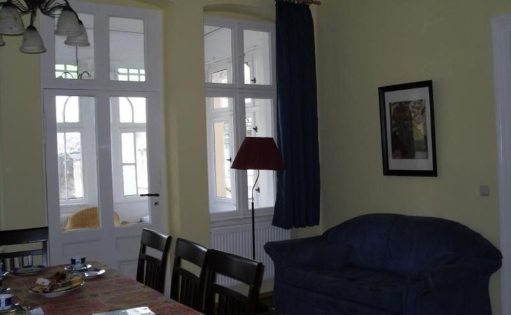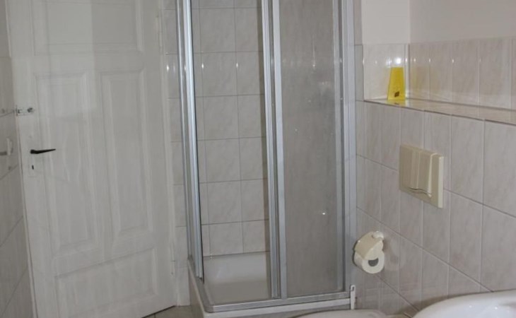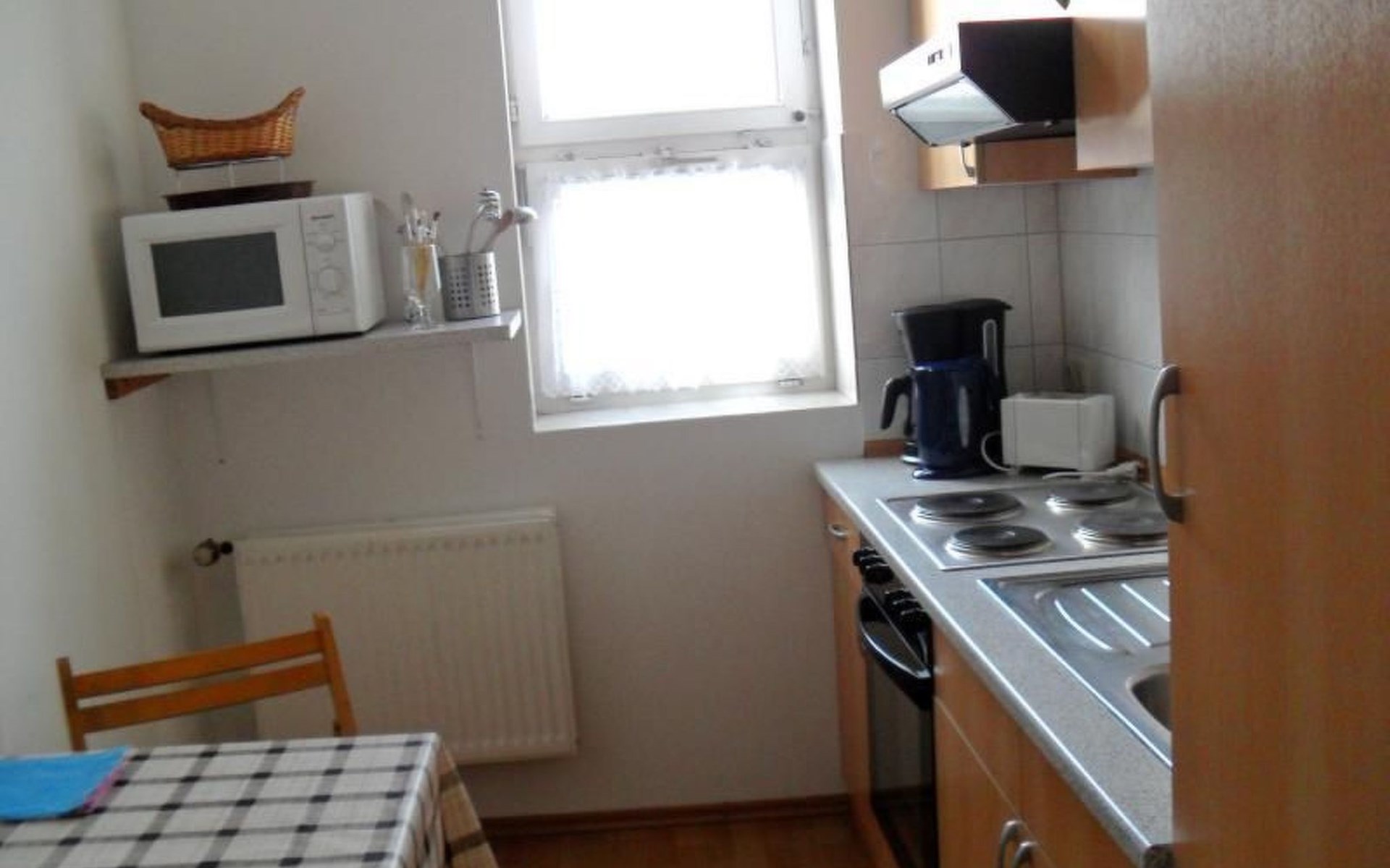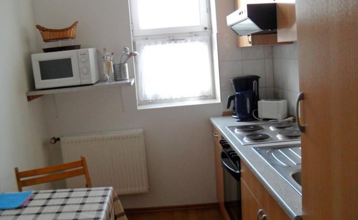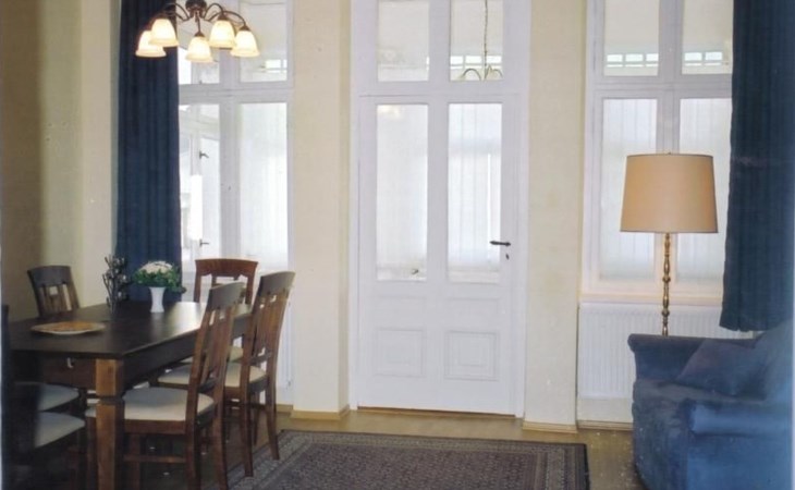 The flat is located on the 1st floor, is 65 m² in size and is suitable for 4 people. The flat has a large living room with a glass veranda in front (2 beds), a separate bedroom, a small shared hallway with the neighbouring flat and opposite a shower/WC and kitchen with electric cooker, fridge, microwave and all small appliances.