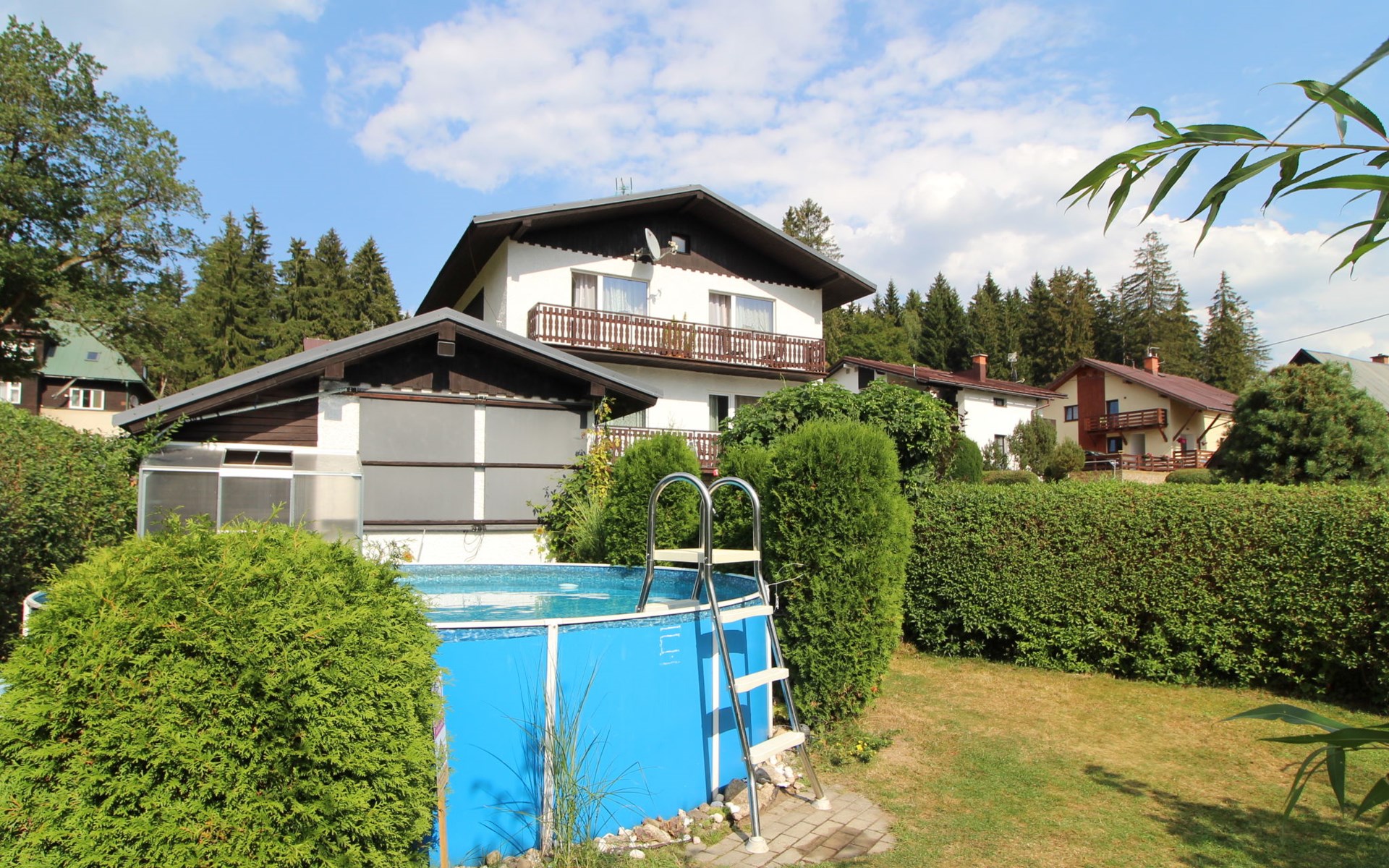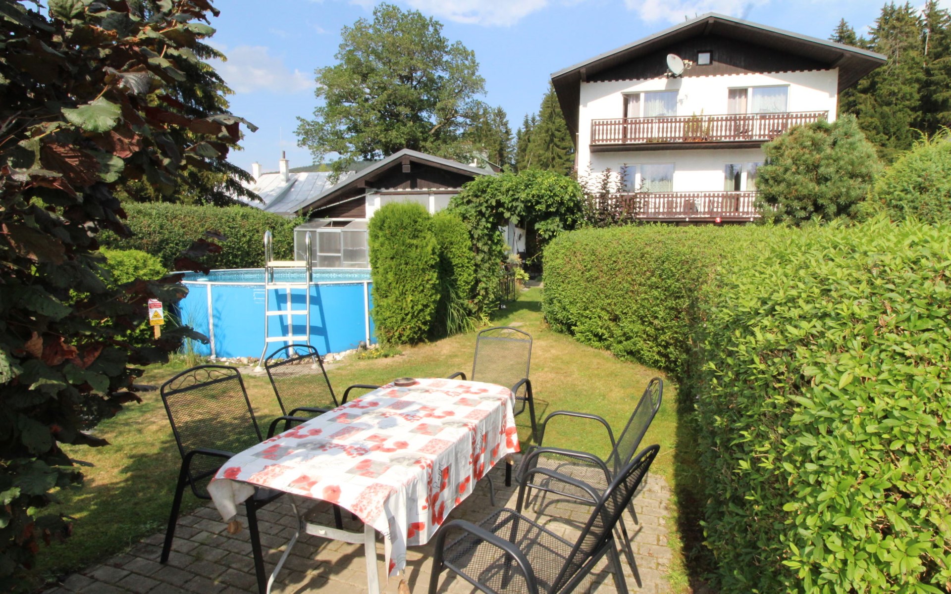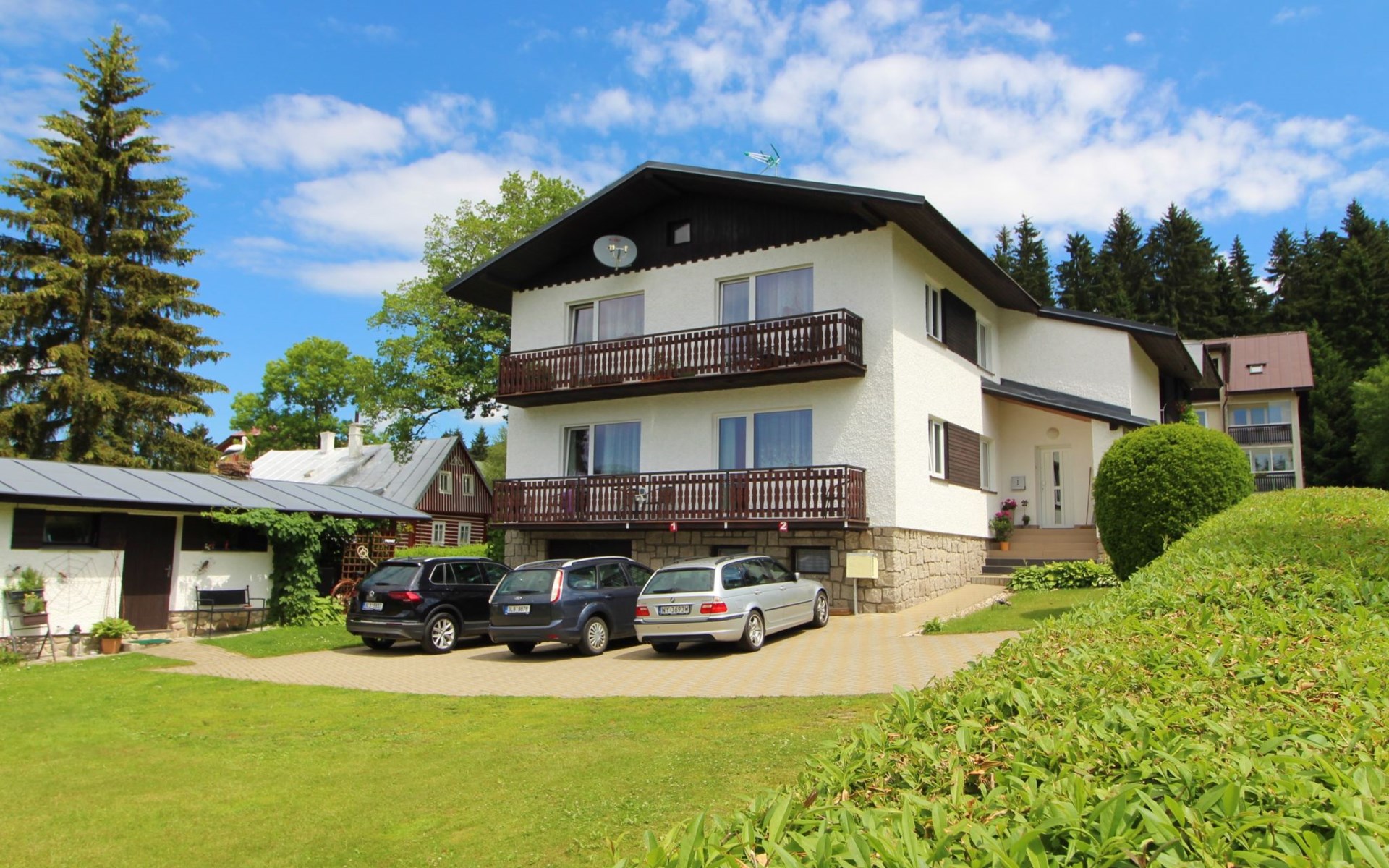 Comfortable house "Nový Svět 417", 2 storeys, detached. In the district of Nový Svět, in the resort 300 m from the centre of Harrachov, 800 m from the skiing area. For shared use: property, garden. In the house: storage room for skis, central heating system. Parking at the house. Supermarket 200 m, restaurant, café 100 m, bicycle rental 1.5 km, bus stop "U Karolíny" 100 m, railway station "Harrachov" 2.1 km, outdoor swimming pool 1.5 km. Golf course (9 hole) 3 km, tennis 1 km, ski lift 500 m, chair lift 800 m, slopes 500 m, ski rental 10 m, ski school 300 m, cross country ski track 200 m, children's playground 300 m. Nearby attractions: Bobová dráha, Muzeum skla 300 m, Skokanské můstky Harrachov 1.3 km, Mumlavský vodopád 1.9 km, Vodopády Kamienczyka, Szklarki (PL) 6.6 km, Huťský vodopád, Vosecká bouda, Dvořačky 9 km, Aquapark Babylon Liberec 34 km. Well-known ski regions can easily be reached: Čertova hora 800 m, Zákoutí 1,5 km, Ryžoviště 3 km, Kořenov 6,5 km, Rokytnice nad Jizerou 14 km. Hiking paths: Western City(Pl) 40 km, Karpacz Wang,Park miniatury Kowary (Pl) 44 km, Giganteria Piechowice 23km, Dinopark(Pl) 15 km.