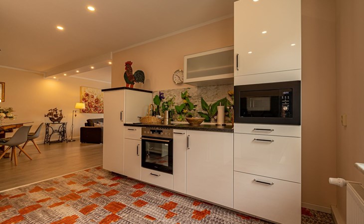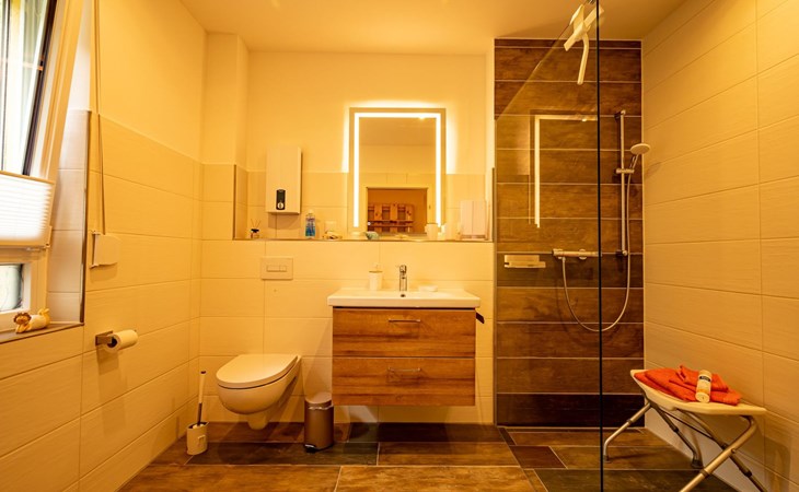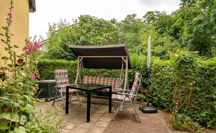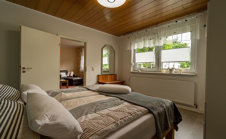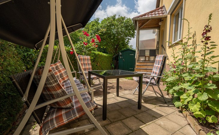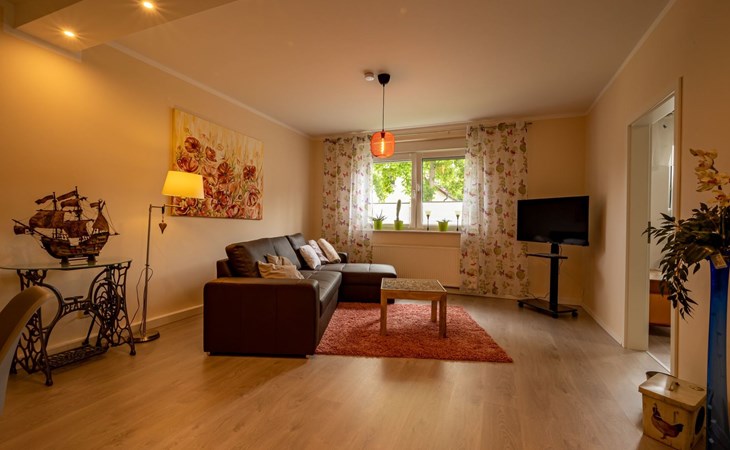 Details- holiday flat with separate entrance/ 24-hour check-in- around 75 m² living space- space for 2 people- bedroom with a comfortable double bed 1.80 x 2.00 m, open foot end- a cosy living room with corner sofa, pull-out- a fully equipped kitchen- a bathroom with shower, WC, incl. hairdryer, make-up mirror- terrace with cosy Hollywood swing, garden furniture and loungers.