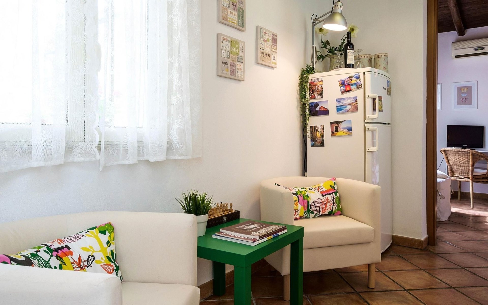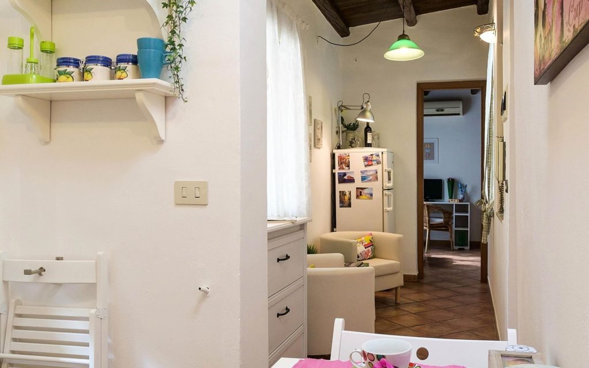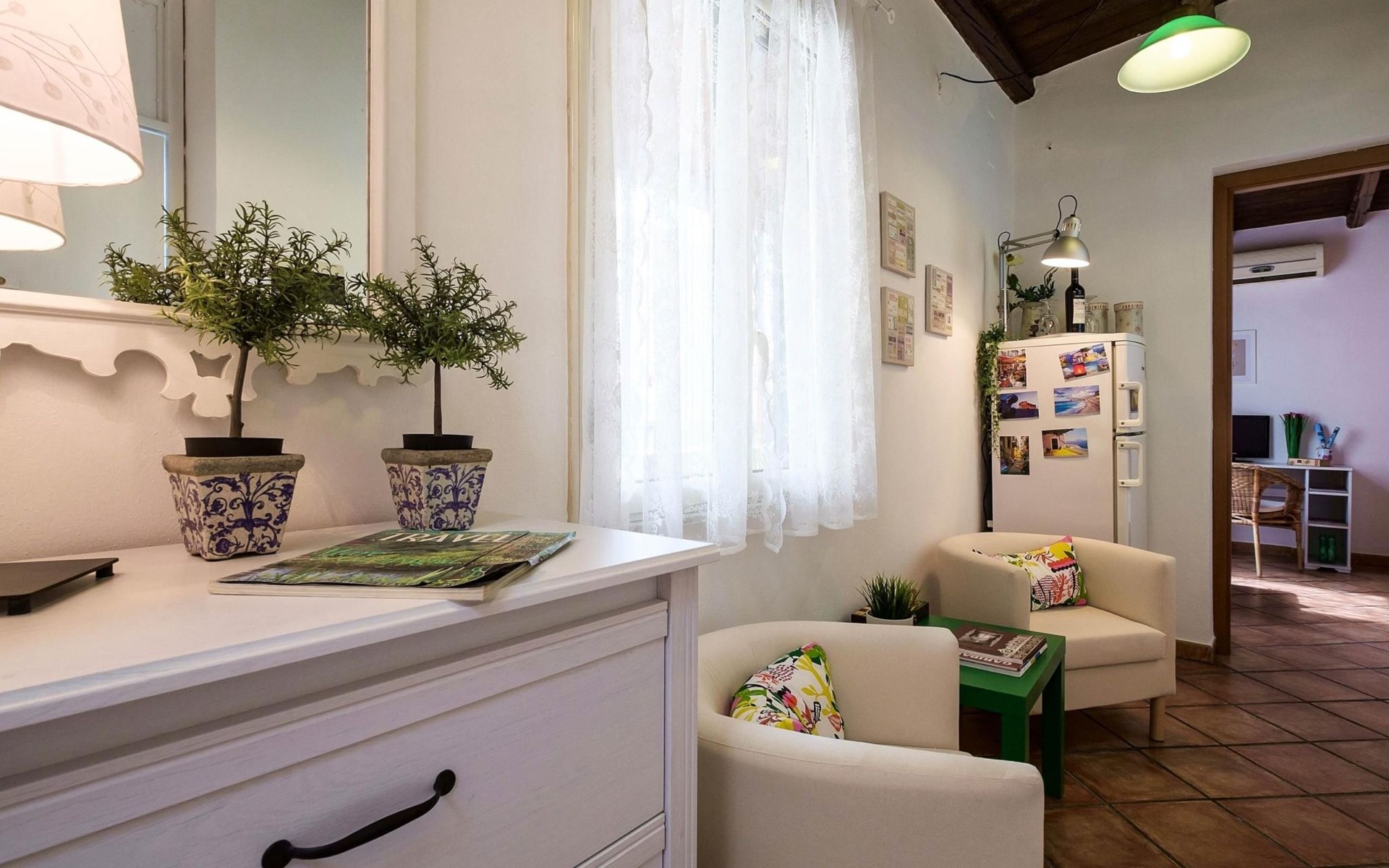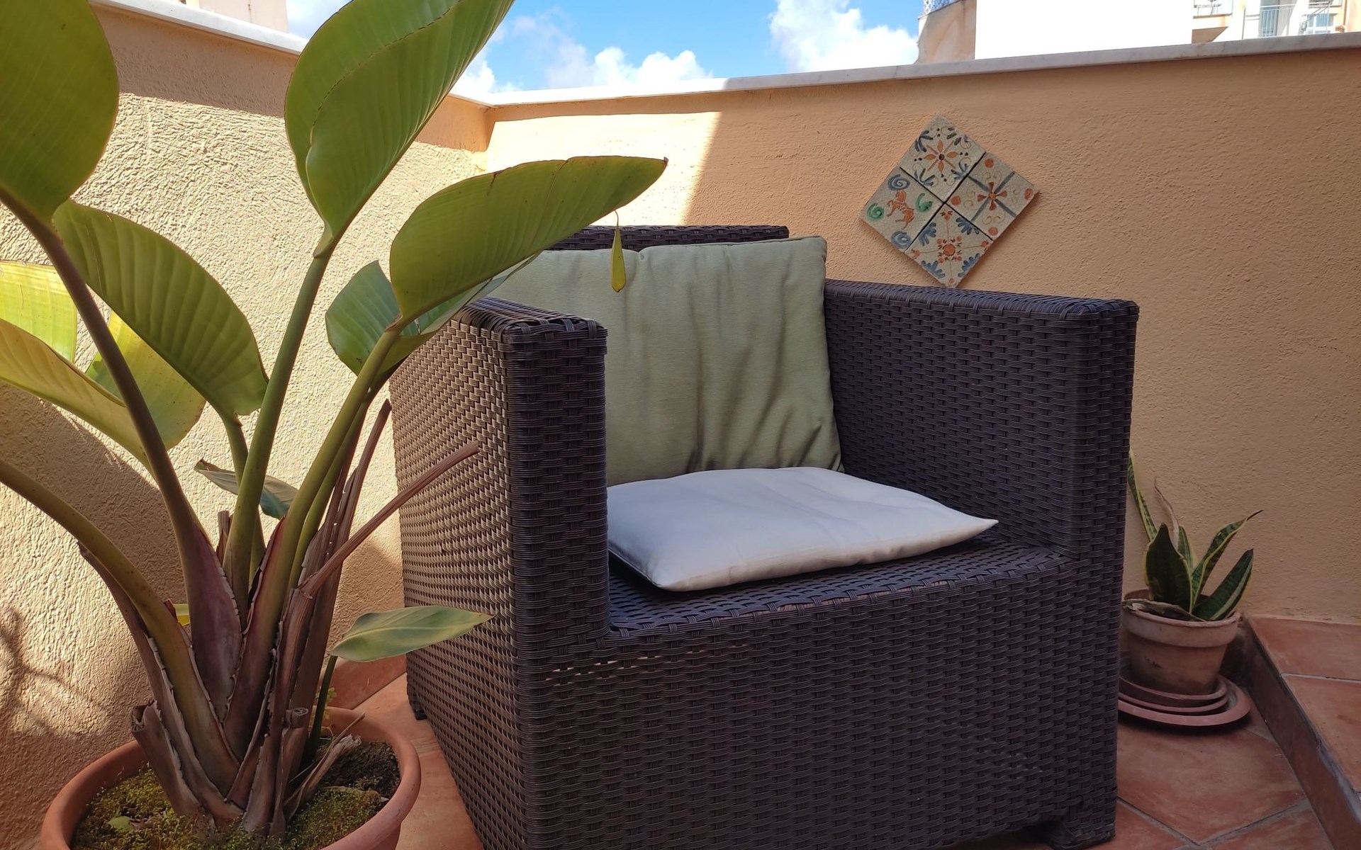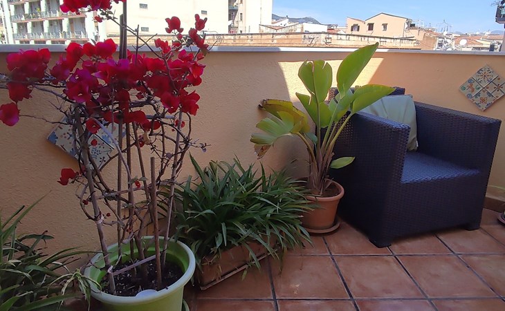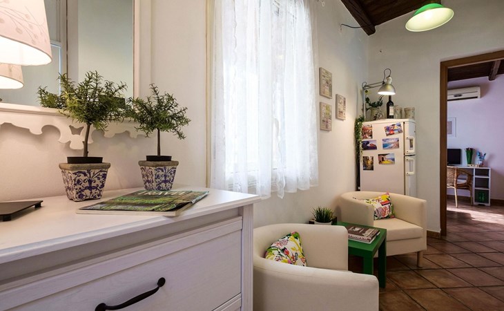 Inside, the flat consists of a beautiful bedroom with characteristic wooden beams, bright and air-conditioned, well furnished with a desk, armchair, wardrobe, flat-screen TV and a large bed with an orthopaedic mattress. A bright and well-furnished relaxation area with armchairs and a coffee table, a cosy, well-equipped kitchen and a new bathroom with a window.In addition, it has a beautiful terrace overlooking the main street, equipped with a sofa, table and chairs where you can relax or eat.The flat enjoys good environmental insulation that makes it suitable for relaxation.The flat is equipped with free Internet WI-FI.Utilities, Internet WI-FI, bed linen, bath towels, included in the rental price.Transfer service from the airport to the flat and vice versa for a fee. Fully equipped kitchen: including oil, salt, sugar, coffee, etc..