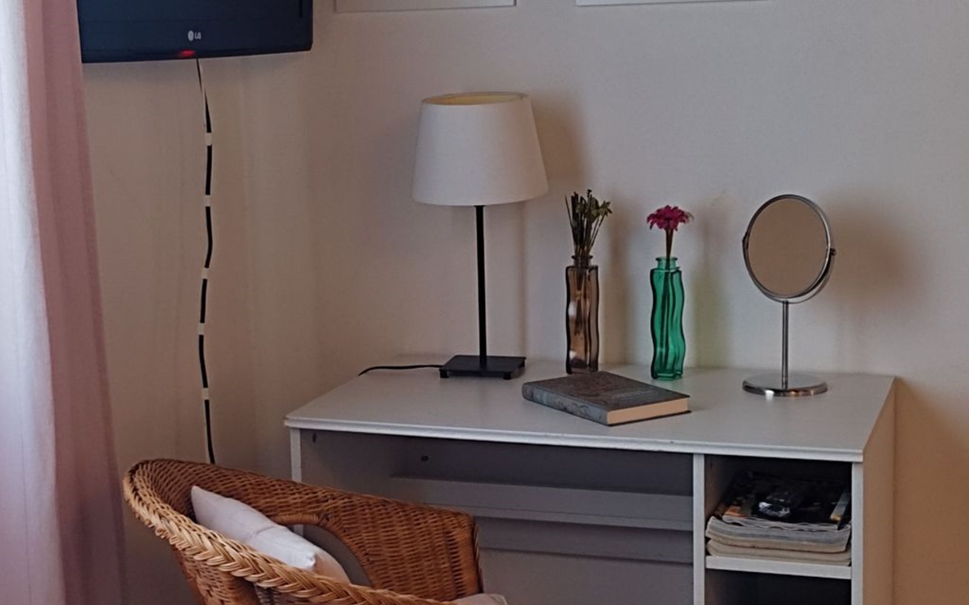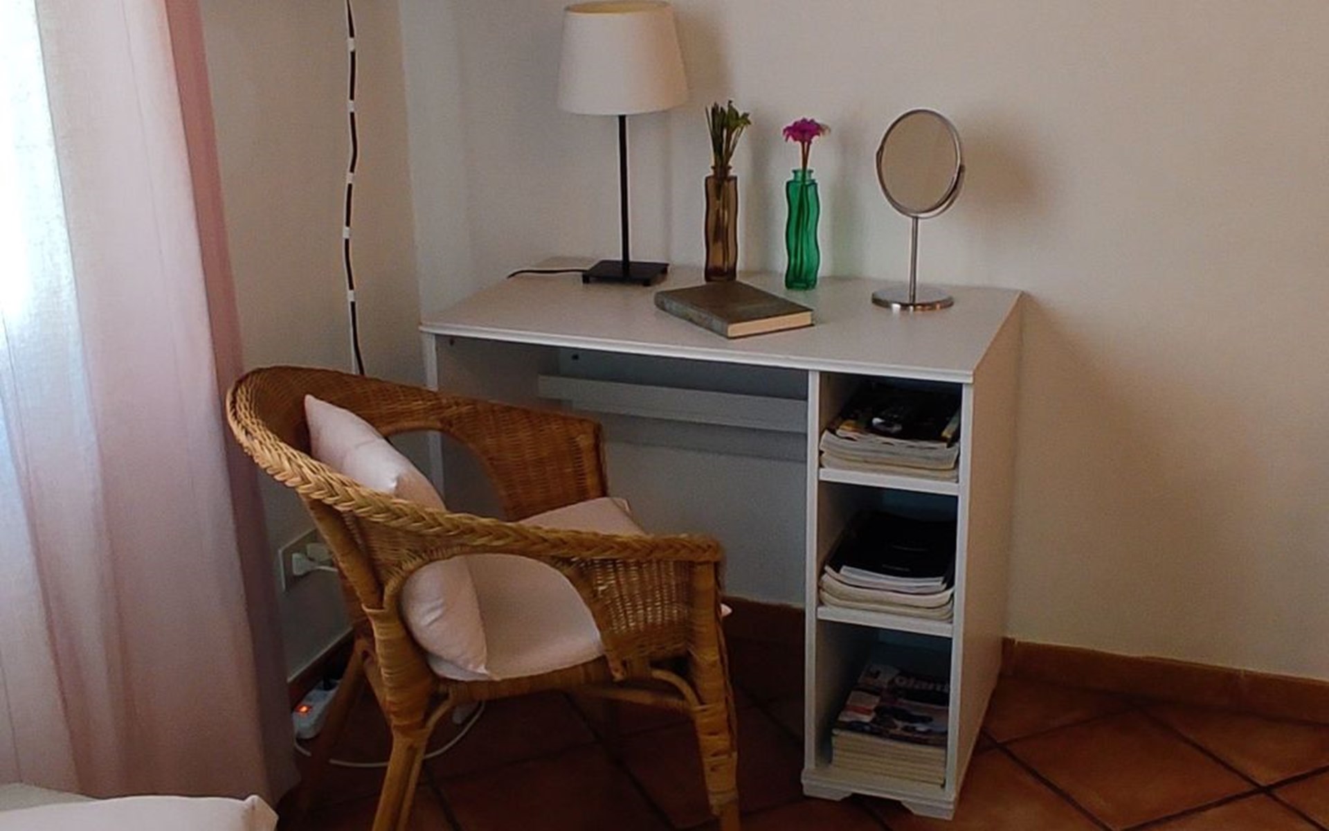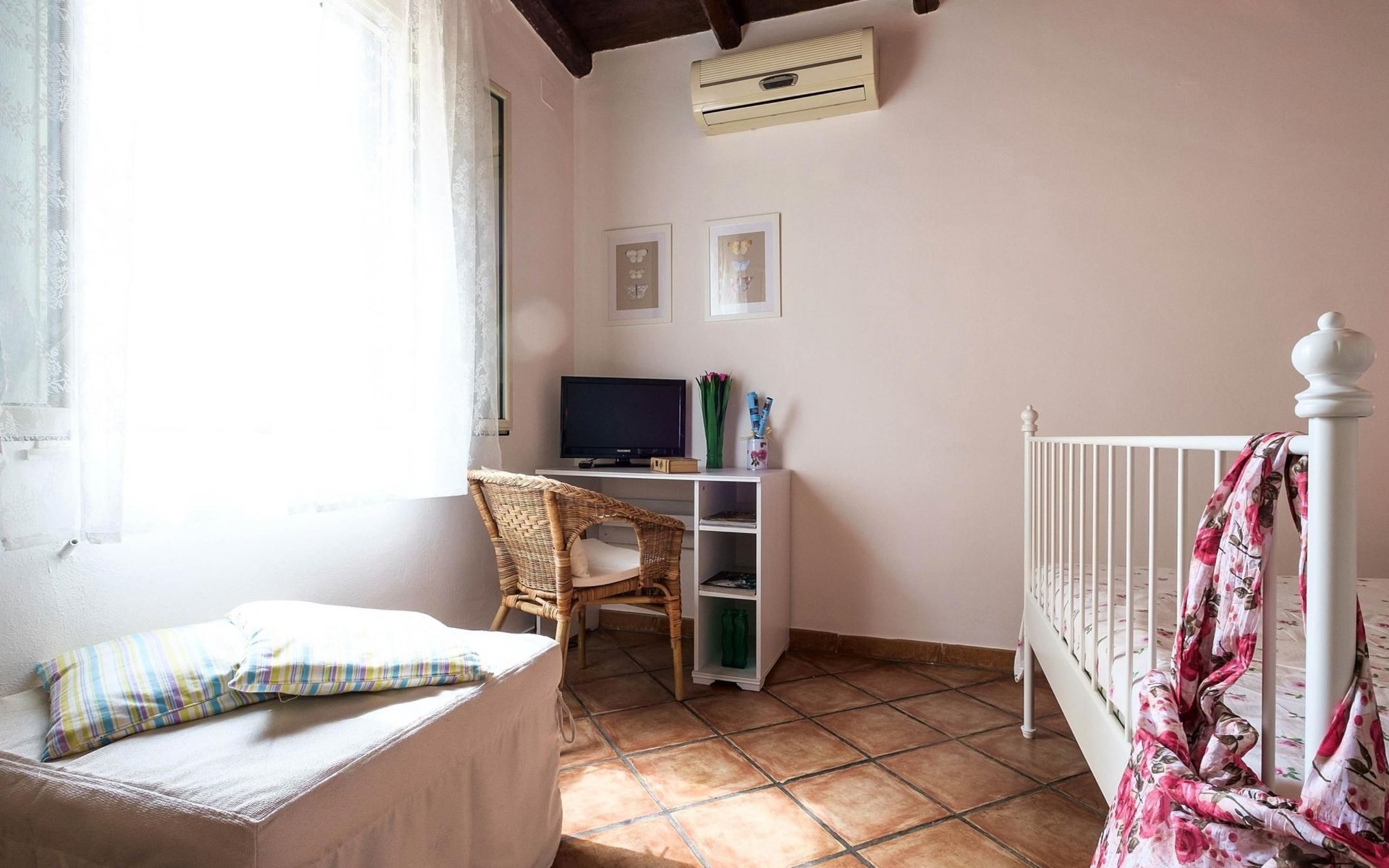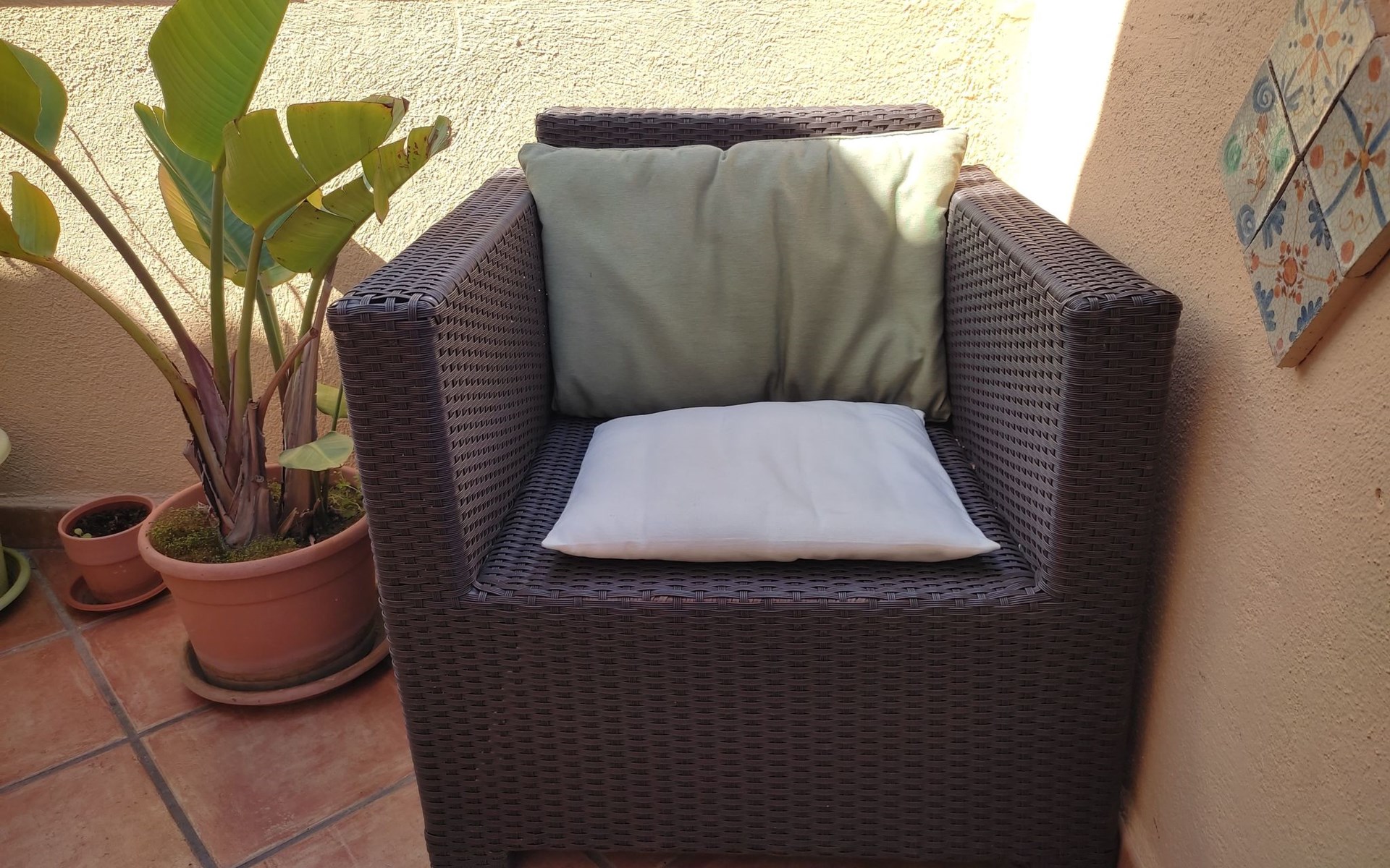 Inside, the flat consists of a beautiful bedroom with characteristic wooden beams, bright and air-conditioned, well furnished with a desk, armchair, wardrobe, flat-screen TV and a large bed with an orthopaedic mattress. A bright and well-furnished relaxation area with armchairs and a coffee table, a cosy, well-equipped kitchen and a new bathroom with a window.In addition, it has a beautiful terrace overlooking the main street, equipped with a sofa, table and chairs where you can relax or eat.The flat enjoys good environmental insulation that makes it suitable for relaxation.The flat is equipped with free Internet WI-FI.Utilities, Internet WI-FI, bed linen, bath towels, included in the rental price.Transfer service from the airport to the flat and vice versa for a fee. Fully equipped kitchen: including oil, salt, sugar, coffee, etc..