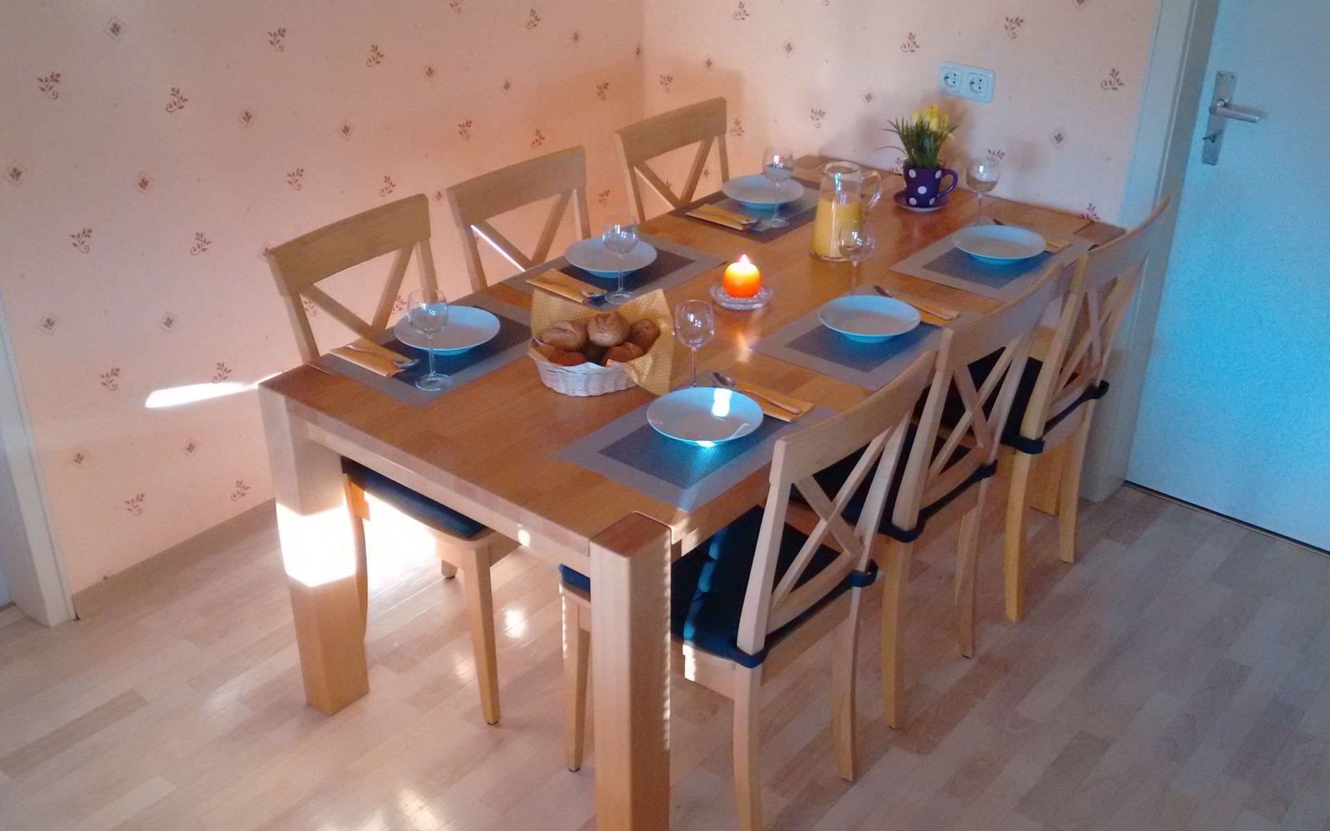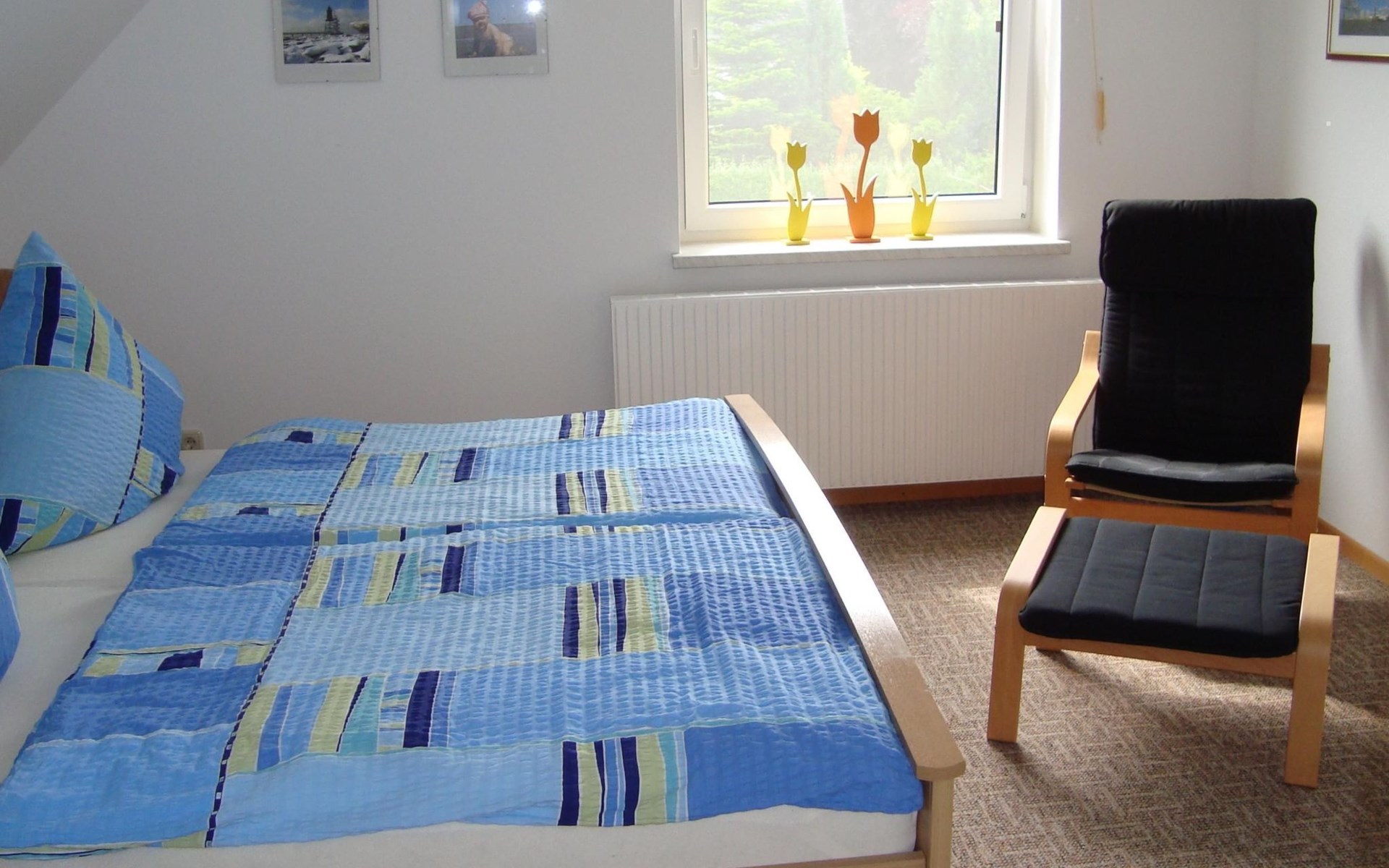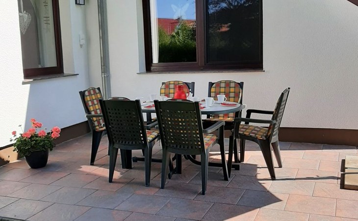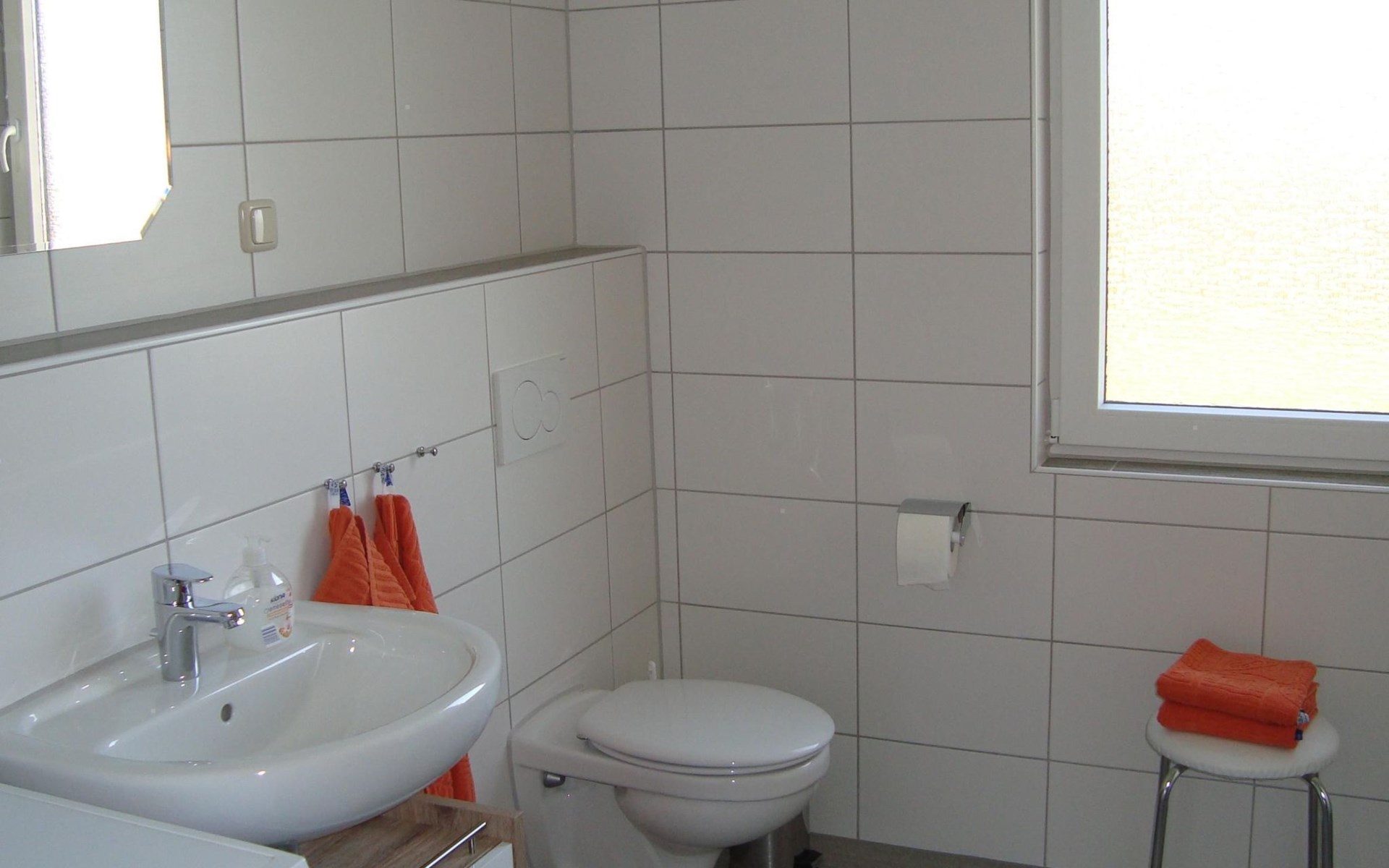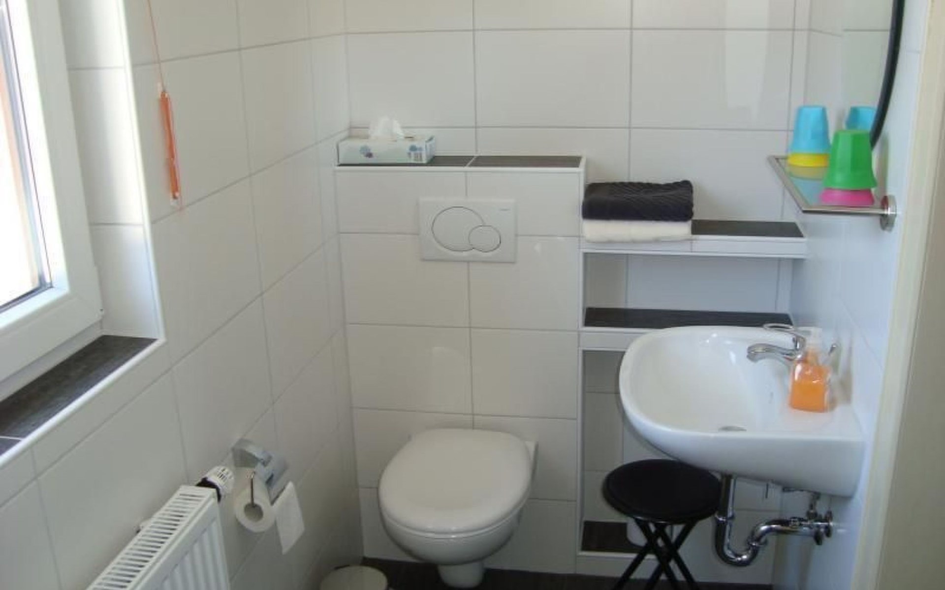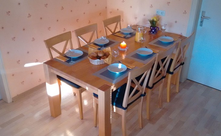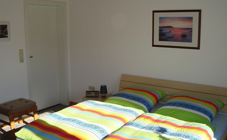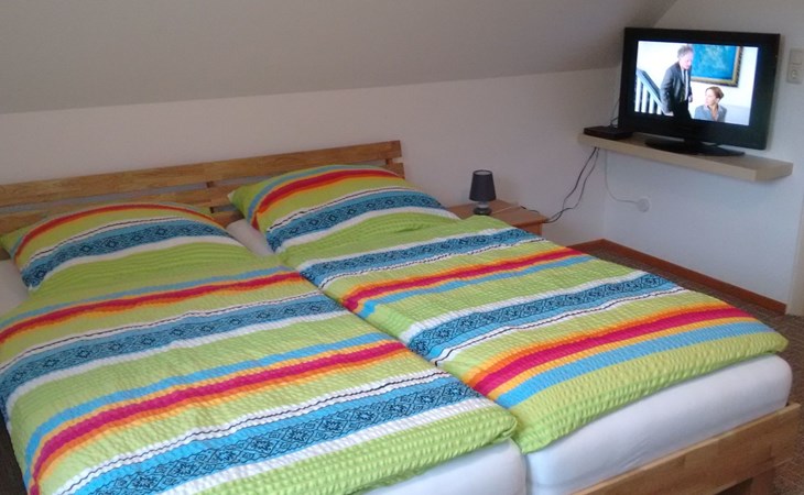 The generous non-smoking apartment is accessed through a separate entrance and creates the impression of an independent holiday house. It is only the kitchen on the ground floor that lies below a room used by the owners. This ensures a very quiet stay with ample privacy. The interior consists of a ground floor and an upper floor totaling 120m². The ground floor has a kitchen with a dining space, a cosy living room, a bedroom and a shower room with a WC. The rooms are accessed individually from a long hallway. The upper floor has two further bedrooms and a second shower room with a WC. The ground-floor bedroom is furnished with a double bed (180 x 200cm) with bedside tables and reading lamps on either side. The two double beds in the upper-floor bedrooms measure 200 x 200cm. One bedroom has a relaxation armchair with a leg rest, if you would like to read a good book undisturbed. The other bedroom has a TV. After a day trip, you can relax together in the living room on an upholstered corner sofa and an armchair. The dining room in the kitchen invites up to eight people to dine together. A stove with a ceramic hob and oven, a washing machine, a dishwasher, a fridge and freezer, a coffee machine, kettle and toaster are provided for comprehensive self-catering. The daylight shower rooms have a shower cubicle, a WC and a washbasin.