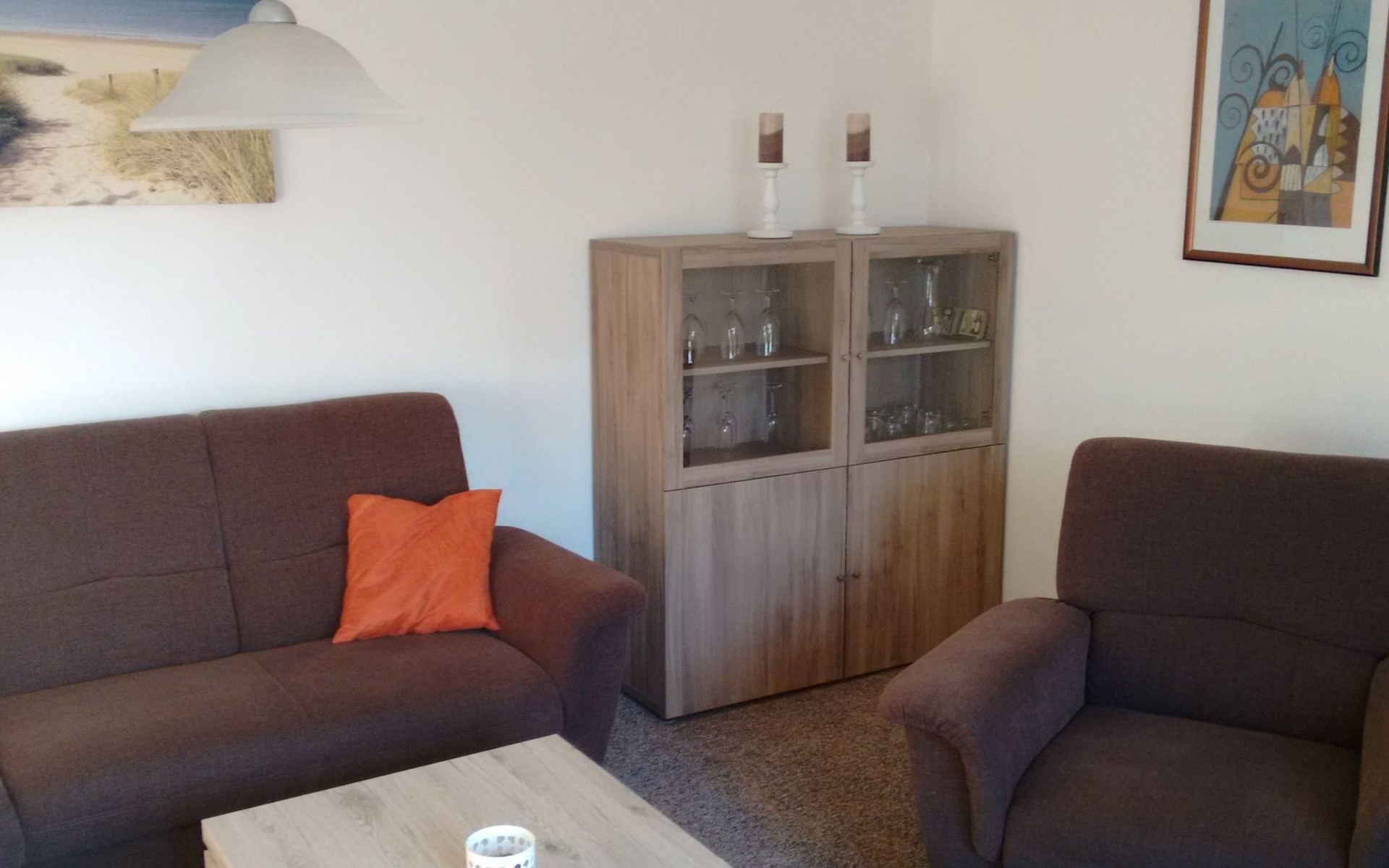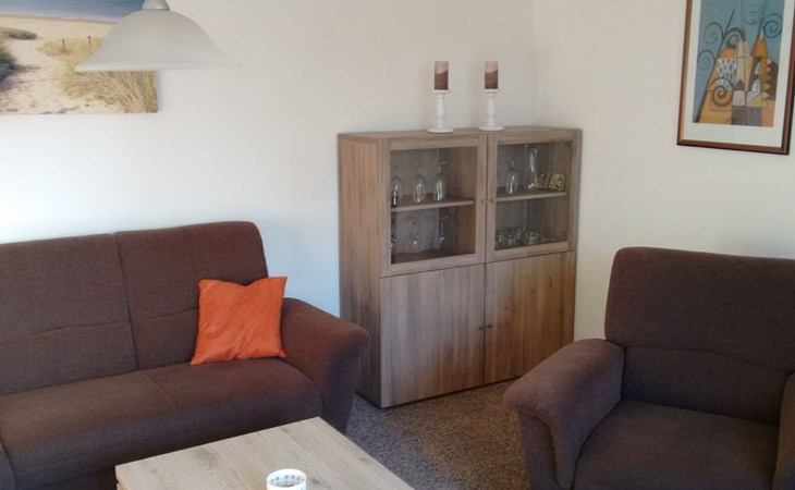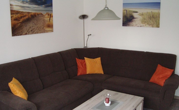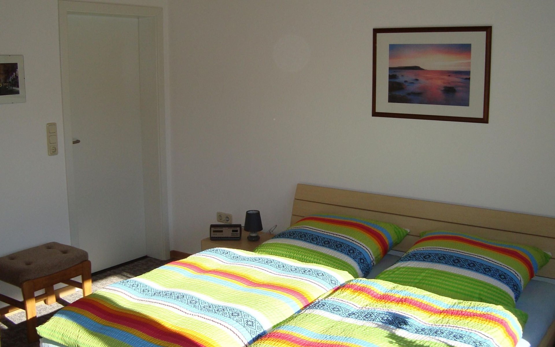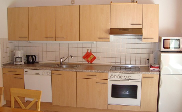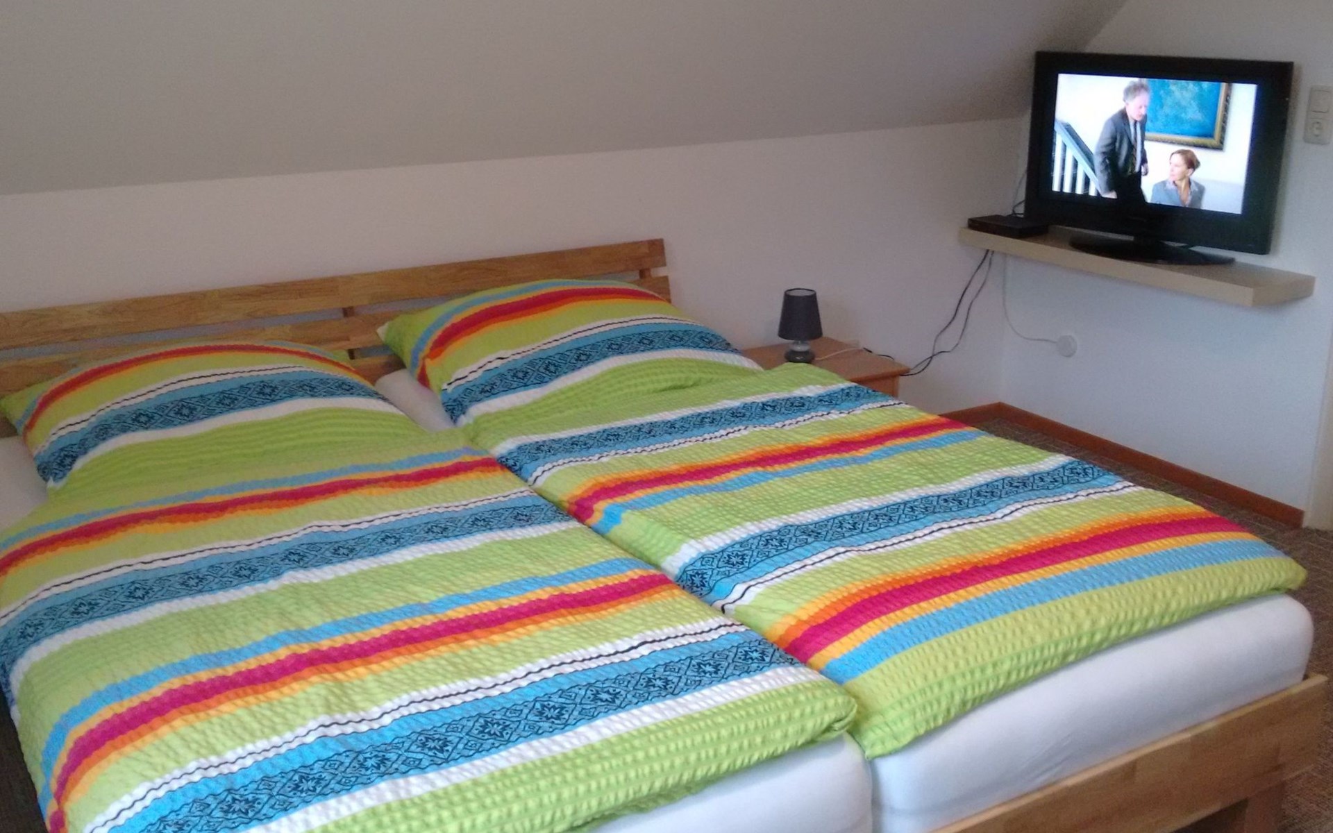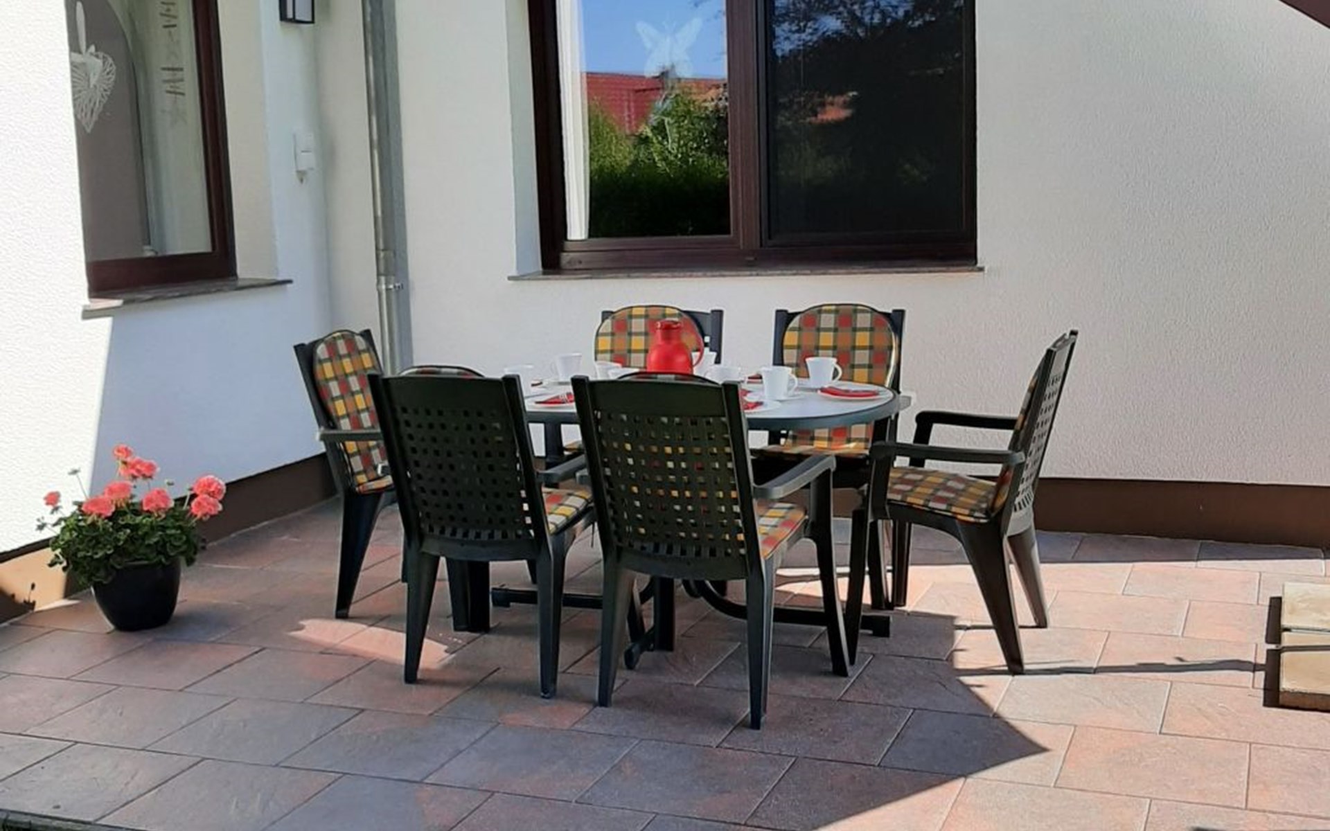 The generous non-smoking apartment is accessed through a separate entrance and creates the impression of an independent holiday house. It is only the kitchen on the ground floor that lies below a room used by the owners. This ensures a very quiet stay with ample privacy. The interior consists of a ground floor and an upper floor totaling 120m². The ground floor has a kitchen with a dining space, a cosy living room, a bedroom and a shower room with a WC. The rooms are accessed individually from a long hallway. The upper floor has two further bedrooms and a second shower room with a WC. The ground-floor bedroom is furnished with a double bed (180 x 200cm) with bedside tables and reading lamps on either side. The two double beds in the upper-floor bedrooms measure 200 x 200cm. One bedroom has a relaxation armchair with a leg rest, if you would like to read a good book undisturbed. The other bedroom has a TV. After a day trip, you can relax together in the living room on an upholstered corner sofa and an armchair. The dining room in the kitchen invites up to eight people to dine together. A stove with a ceramic hob and oven, a washing machine, a dishwasher, a fridge and freezer, a coffee machine, kettle and toaster are provided for comprehensive self-catering. The daylight shower rooms have a shower cubicle, a WC and a washbasin.