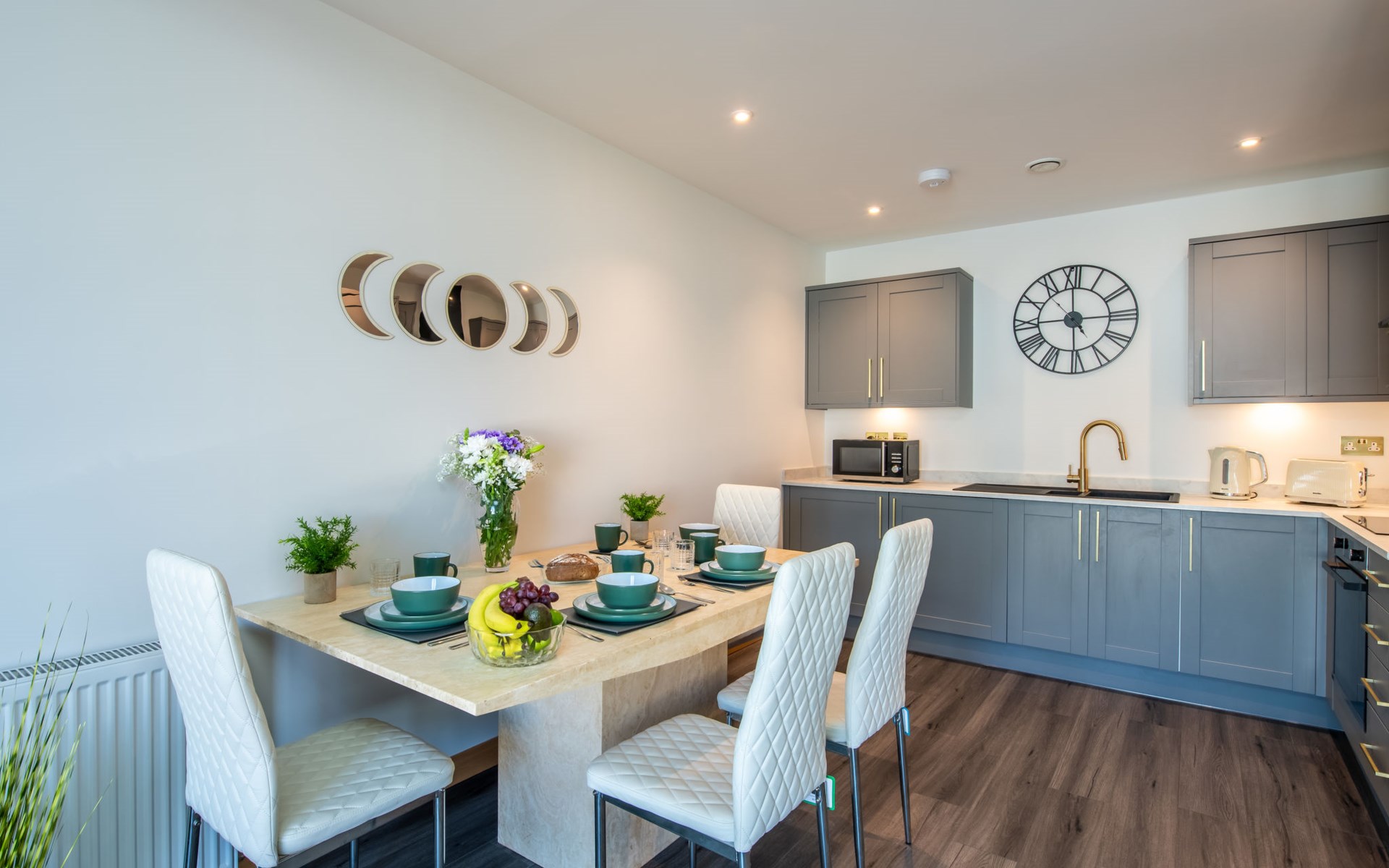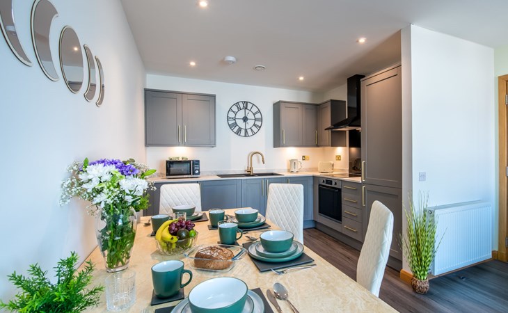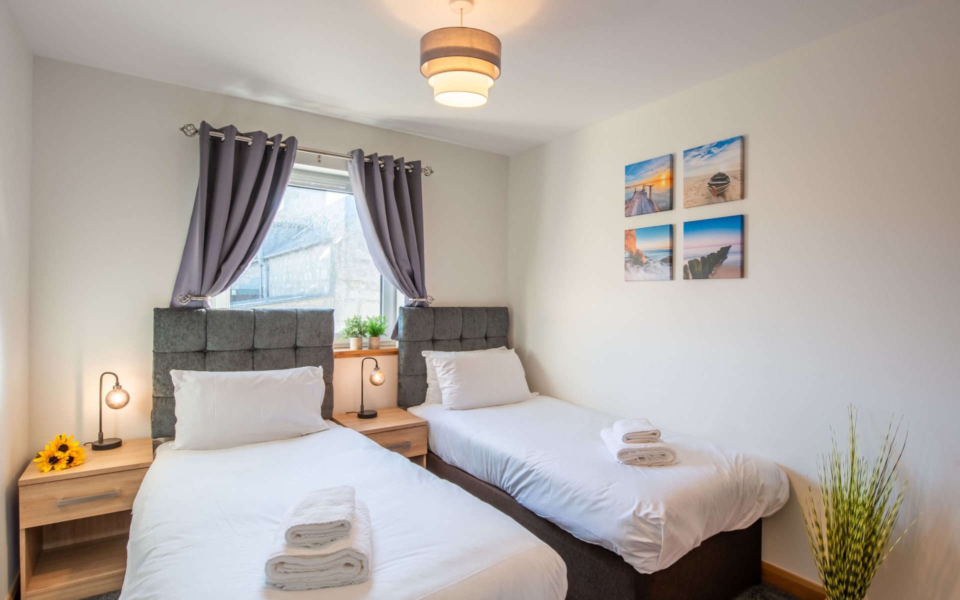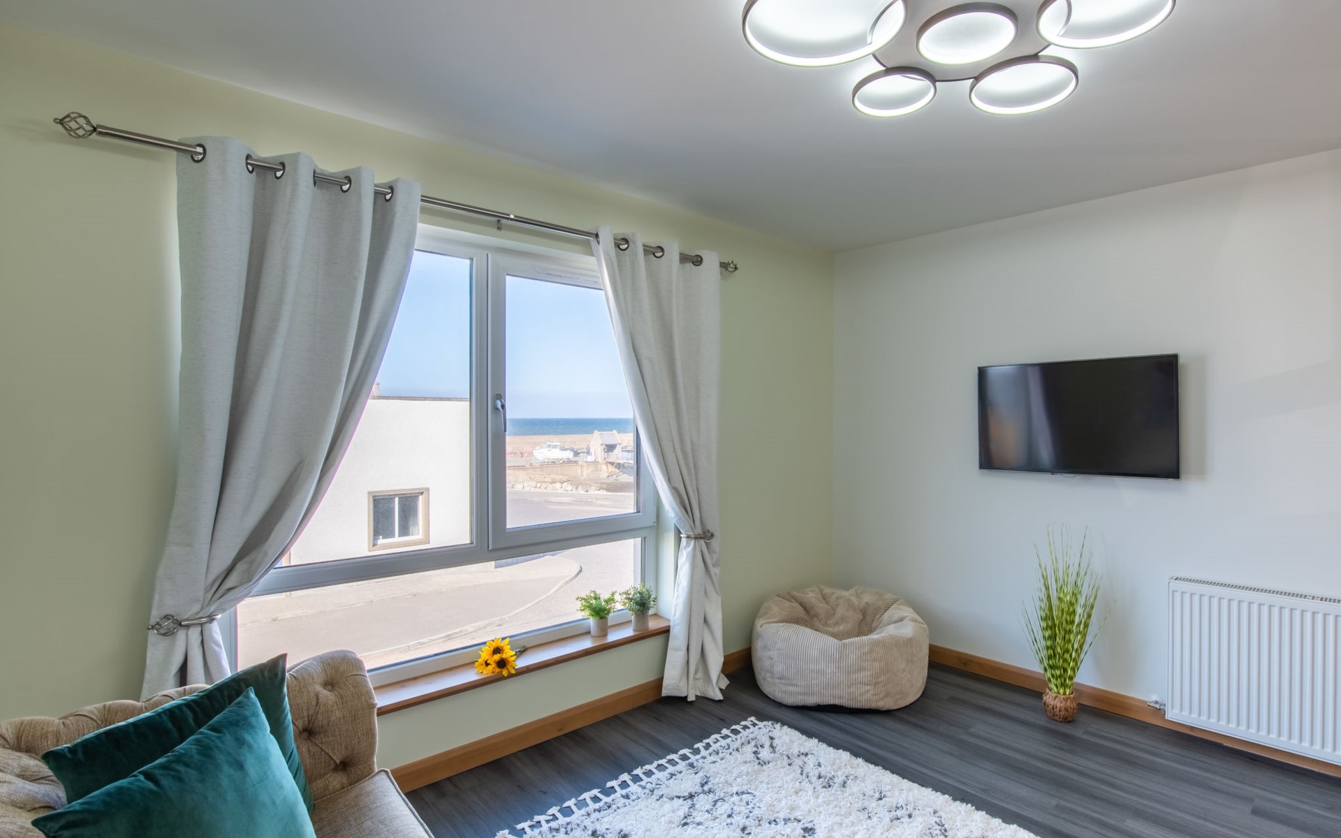Modern apartment block "Shore Street", 2 storeys, built in 2023. In the centre of Lossiemouth, in a central position in the residential district, 30 m from the sea, 400 m from the beach. Parking at the house. Shop, grocery 300 m, supermarket 180 m, restaurant, bar 90 m, bus stop "James Square" 200 m, railway station "Elgin" 10 km, sandy beach "Lossiemouth Beach" 350 m. Marina 90 m, golf course (18 hole) 100 m, tennis 50 m. Please note: Additional accommodations can be booked.