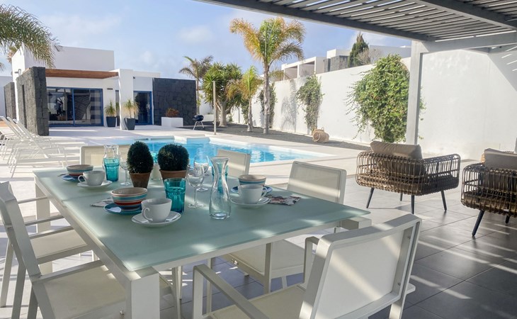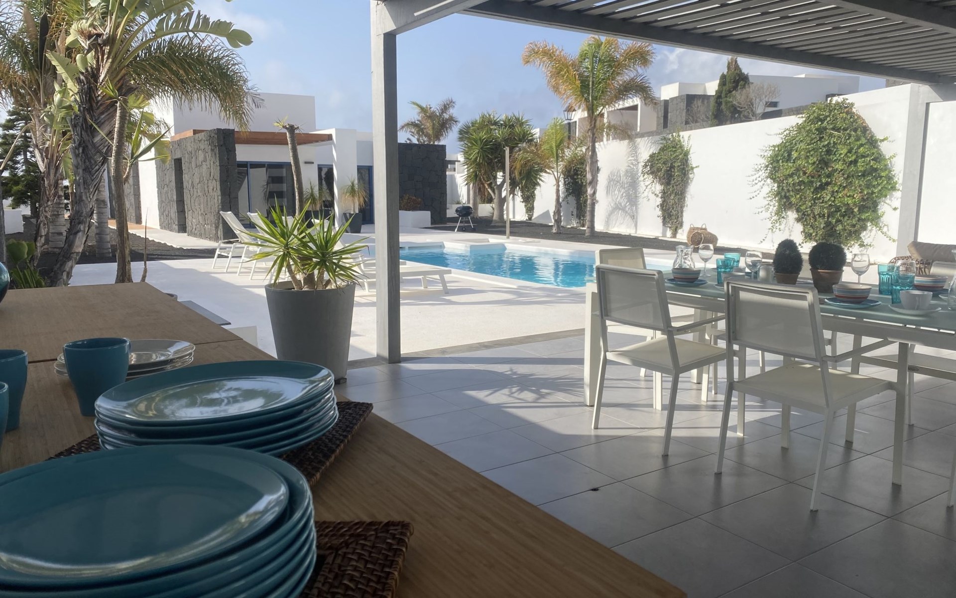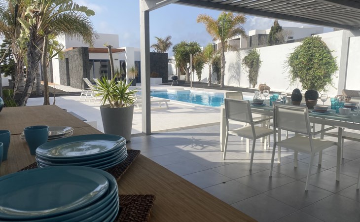 Beautiful terraced house "Julia". 2.5 km from the sea. Private: property 350 m2, swimming pool angular, heated (8 x 4 m, seasonal availability: 01.Jan. - 31.Dec.) with internal staircase. Outdoor shower, barbecue. Supermarket 400 m, restaurant 1.5 km, bus stop 500 m, sandy beach "Playa Blanca" 2.5 km. Golf course (18 hole) 32 km, riding stable 1.5 km. Nearby attractions: Paque acĂșatico Agualava 1.8 km. Please note: car recommended. The owner does not accept any youth groups. Neighbourhood highly sensitive to noise. Quietness and good behaviour expected.