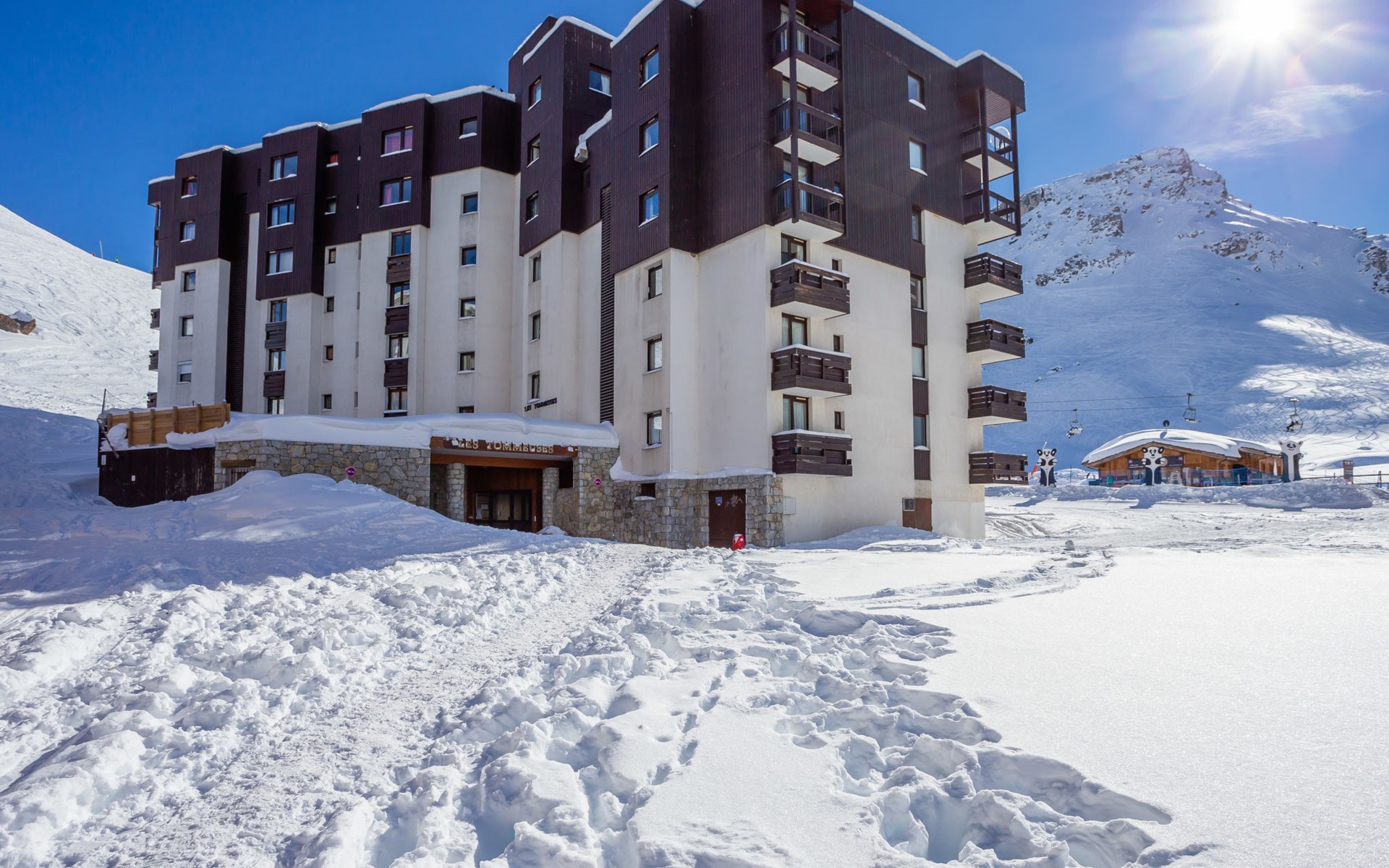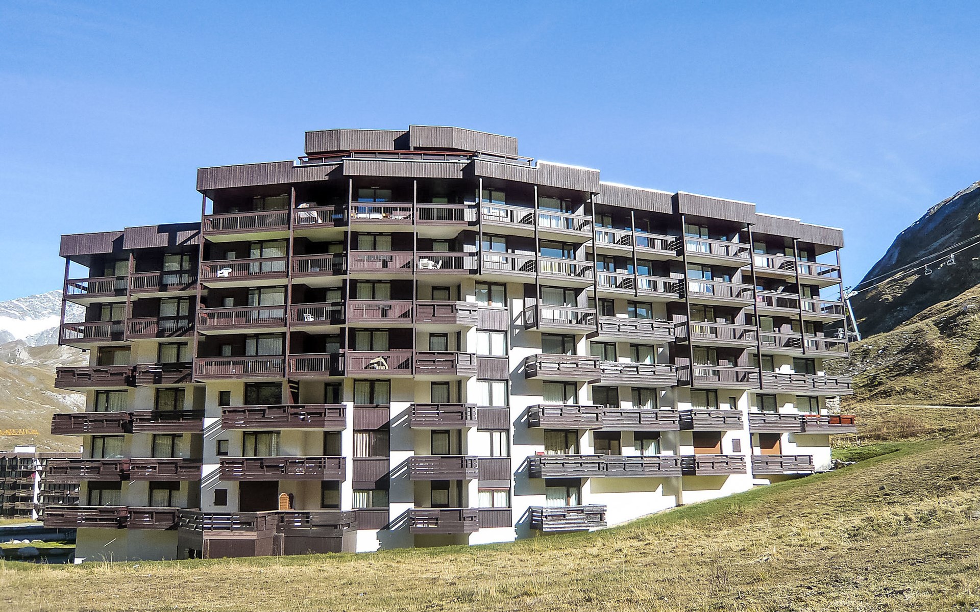Tignes Val Claret: Residence "Les Tommeuses" - excellent location: central but quiet, right by the Tignes and Val d'Isère slopes, ski in ski out. Residence "Les Tommeuses (Val Claret)", 7 storeys. 20 m from the skiing area. In the complex: lift, storage room for skis, central heating system. Public car park at 700 m, extra. Grocery, restaurant 50 m, bus stop 600 m, indoor swimming pool 2 km. Sports centre 2 km, skisport facilities 100 m, slopes 20 m, ski rental 50 m, ski school 200 m, children's ski school 20 m, sled run 200 m. Nearby attractions: LAGON CENTRE AQUATIQUE 2 km, TIGNES ESPACE CENTRE SPORTIF 2 km, GOLF DE TIGNES 2 km, CINEMA 800 m. Well-known ski regions can easily be reached: TIGNES VAL D'ISERE 20 m. Well-known lakes can easily be reached: LAC DE TIGNES 2 km. Hiking paths: PARC DE LA VANOISE 20 m. Please note: ski bus (free of charge). Additional accommodations can be booked.